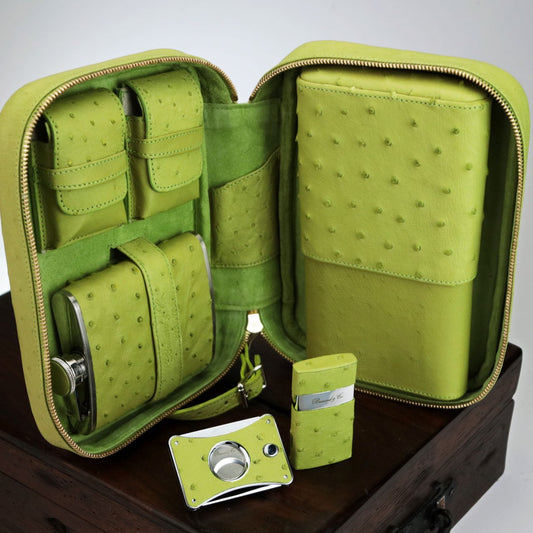 Havana Traveler in Genuine Ostrich Matcha Green with cutter and lighter