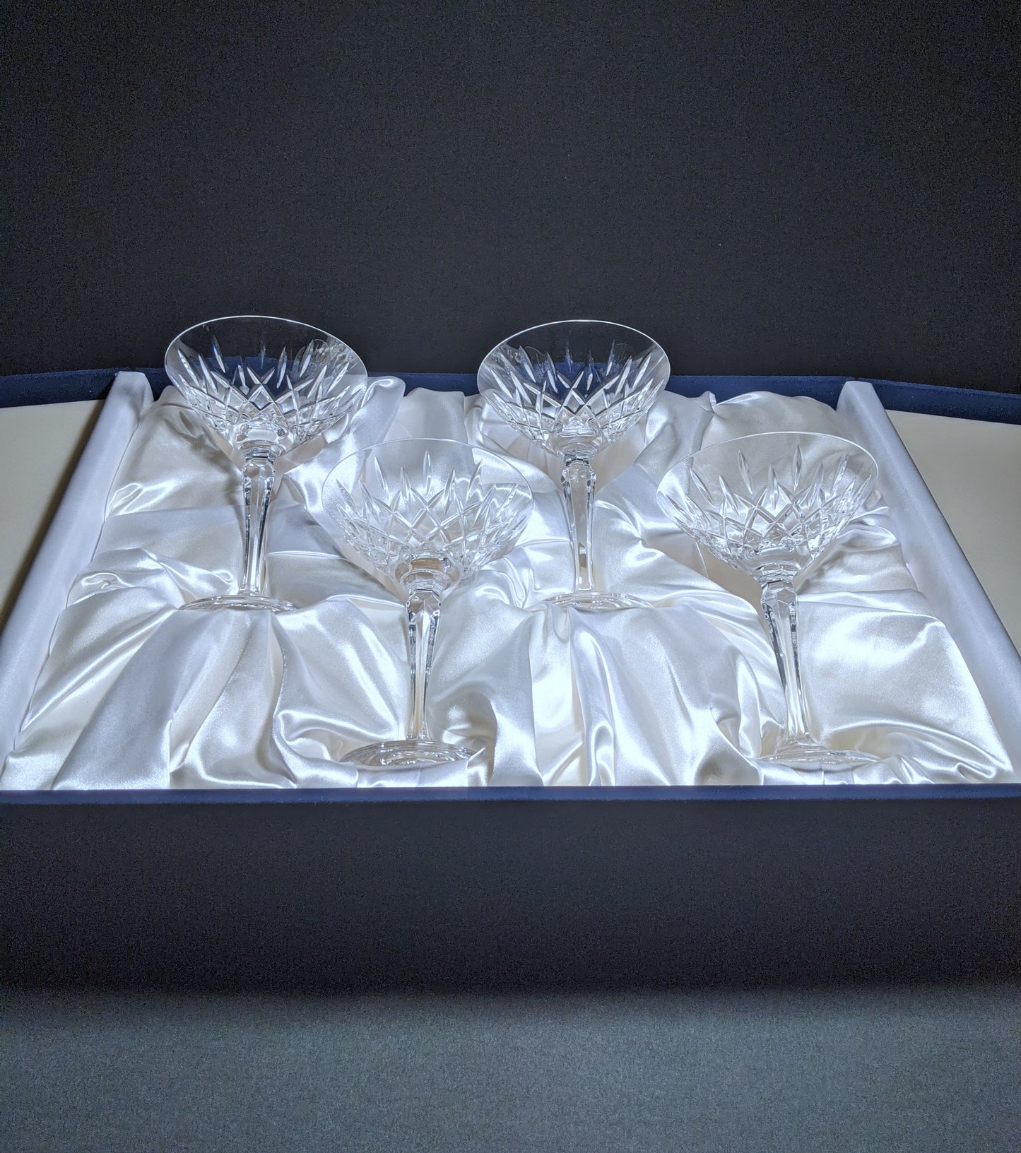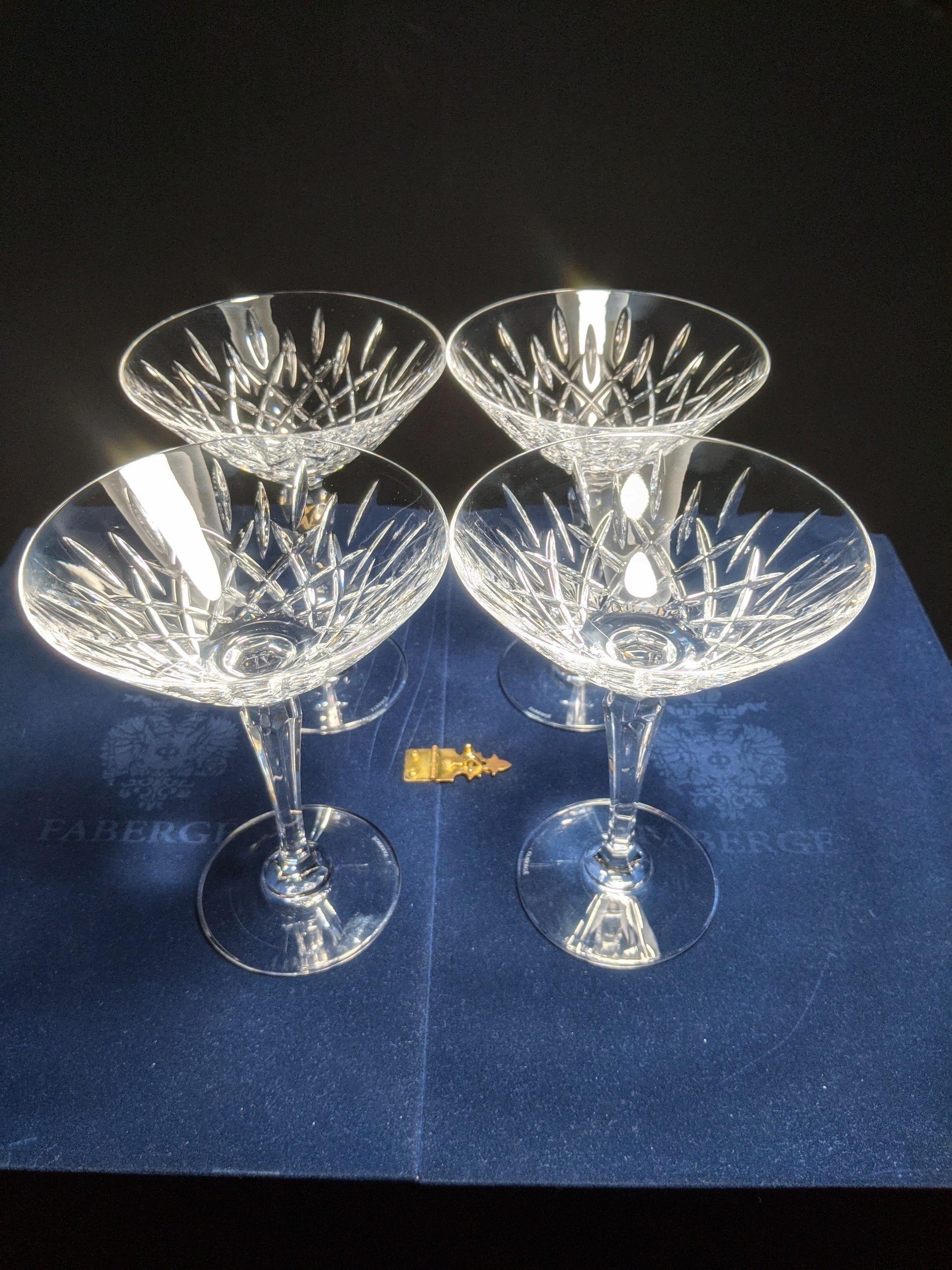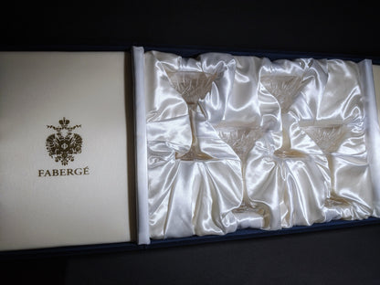 This is a new set of 4 Faberge Clear Crystal Martini Glasses in the original presentation case.  Made in Slovenia. We ship worldwide fully insured. Signature is required upon delivery.