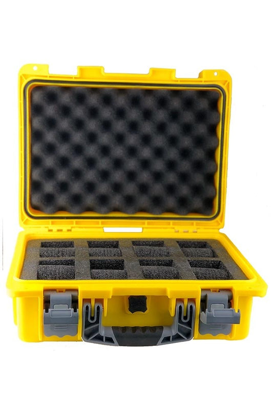 Invicta watch carrying case in grey with yellow handles holds 8 watches