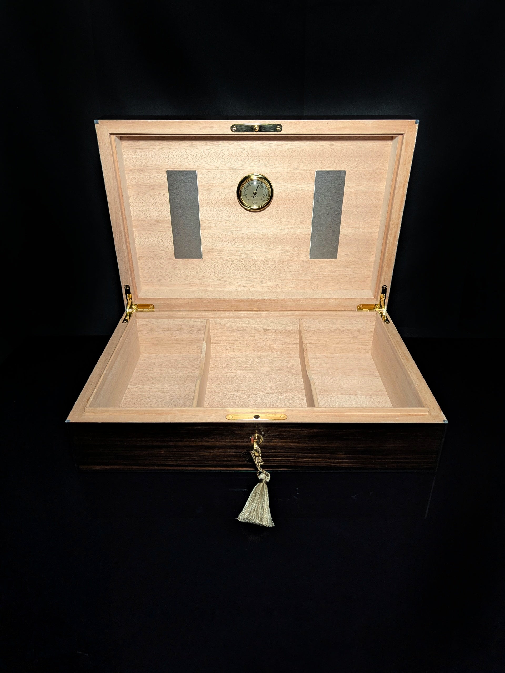This is a new pristine Elie Bleu Macassar Ebony 110 count Humidor. Comes in the original Elie Bleu Presentation Box . Measures approx 11.75" L x 9.50" W x 5.25" H. Has locking lid with key. Comes with one Elie Bleu humidifier & one Elie Blue hygrometer. Made in France. In stock and ready to ship .We Ship fully insured. Signature is required upon delivery.