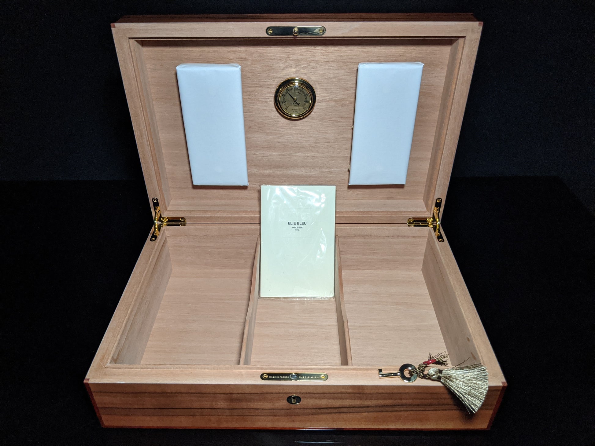 This is a new Elie Bleu Tineo Wood Humidor 110 count. Made in France. Comes in the original presentation box complete with all contents. We ship insured. Signature is required upon delivery.