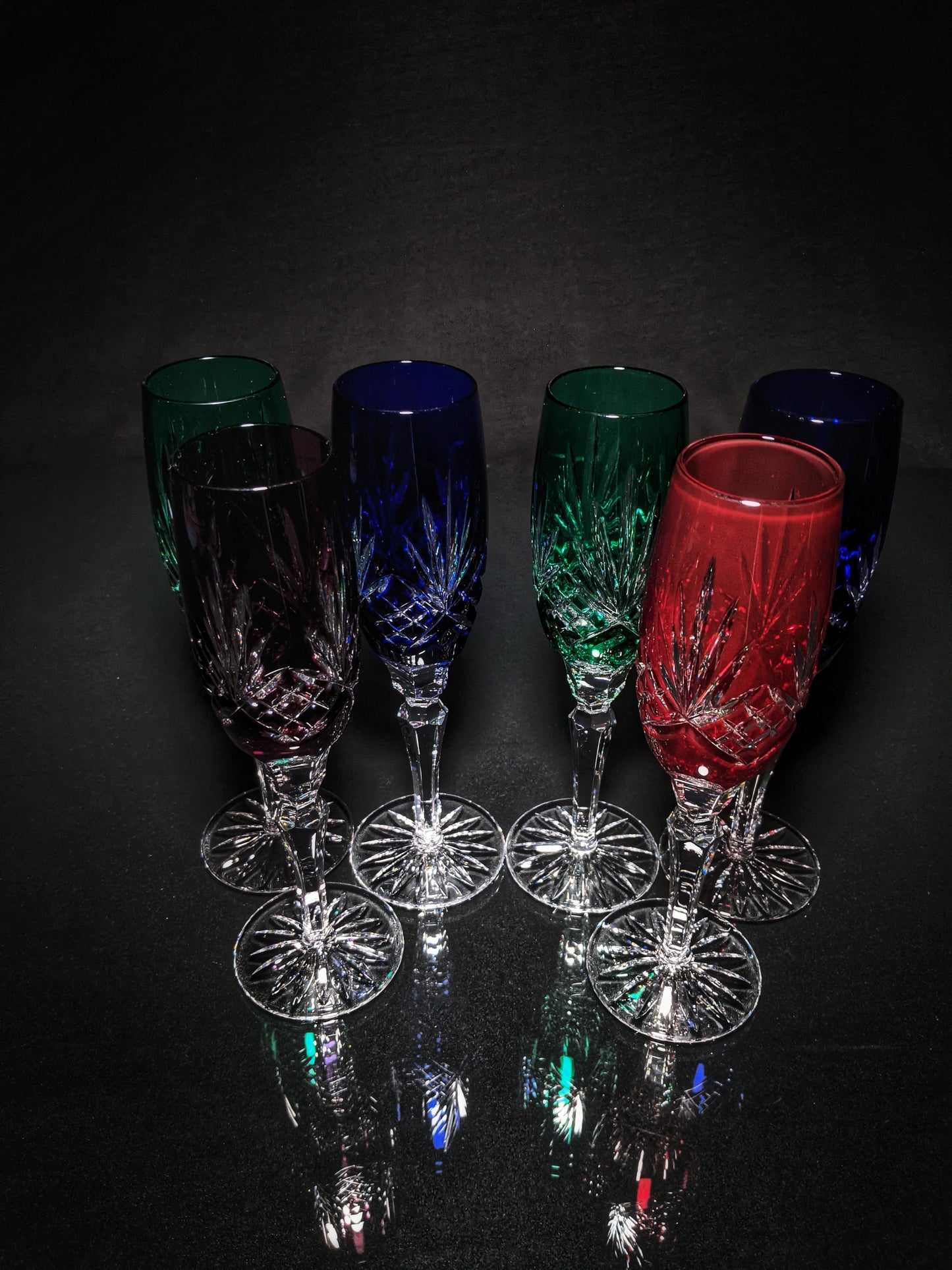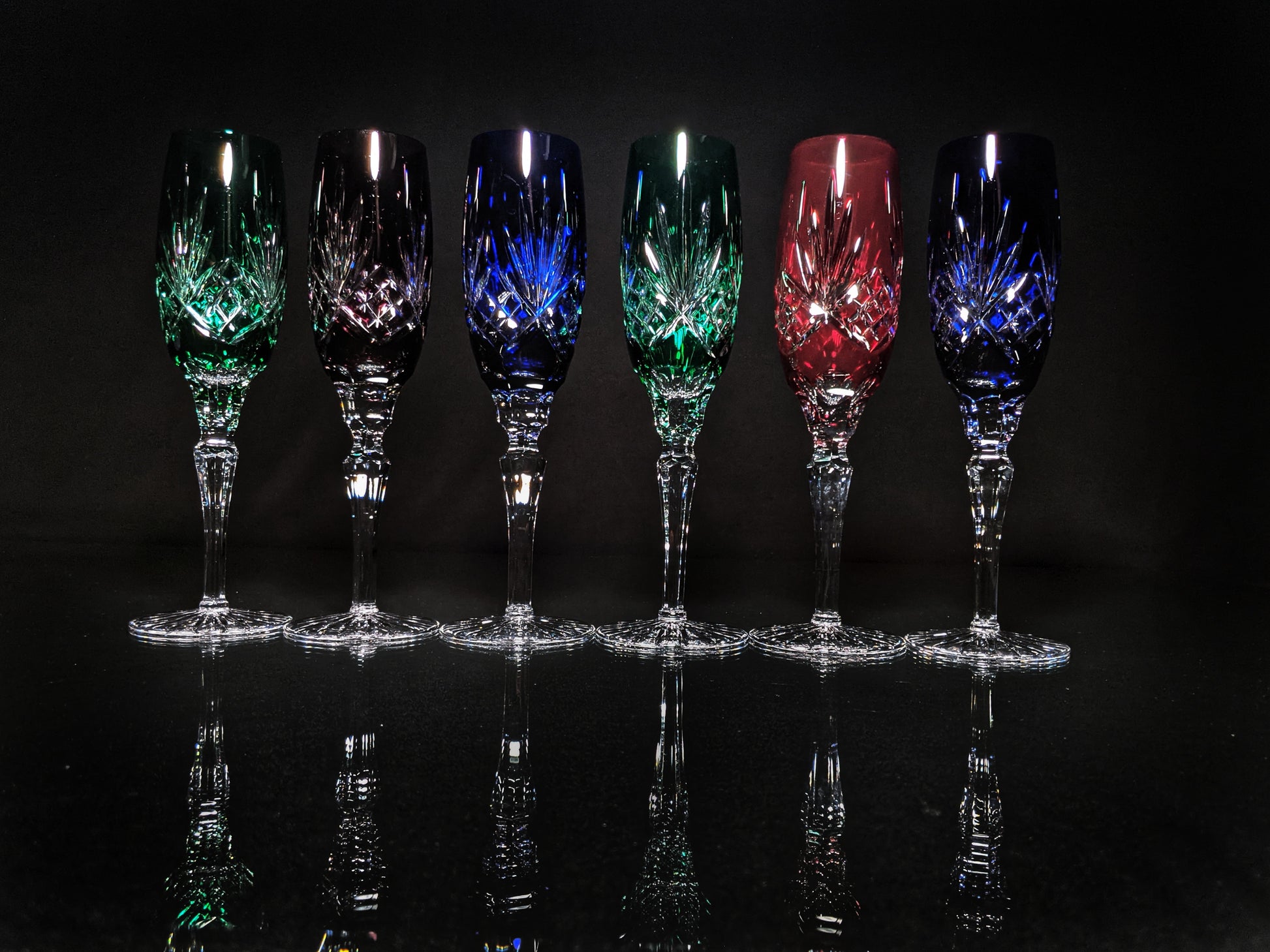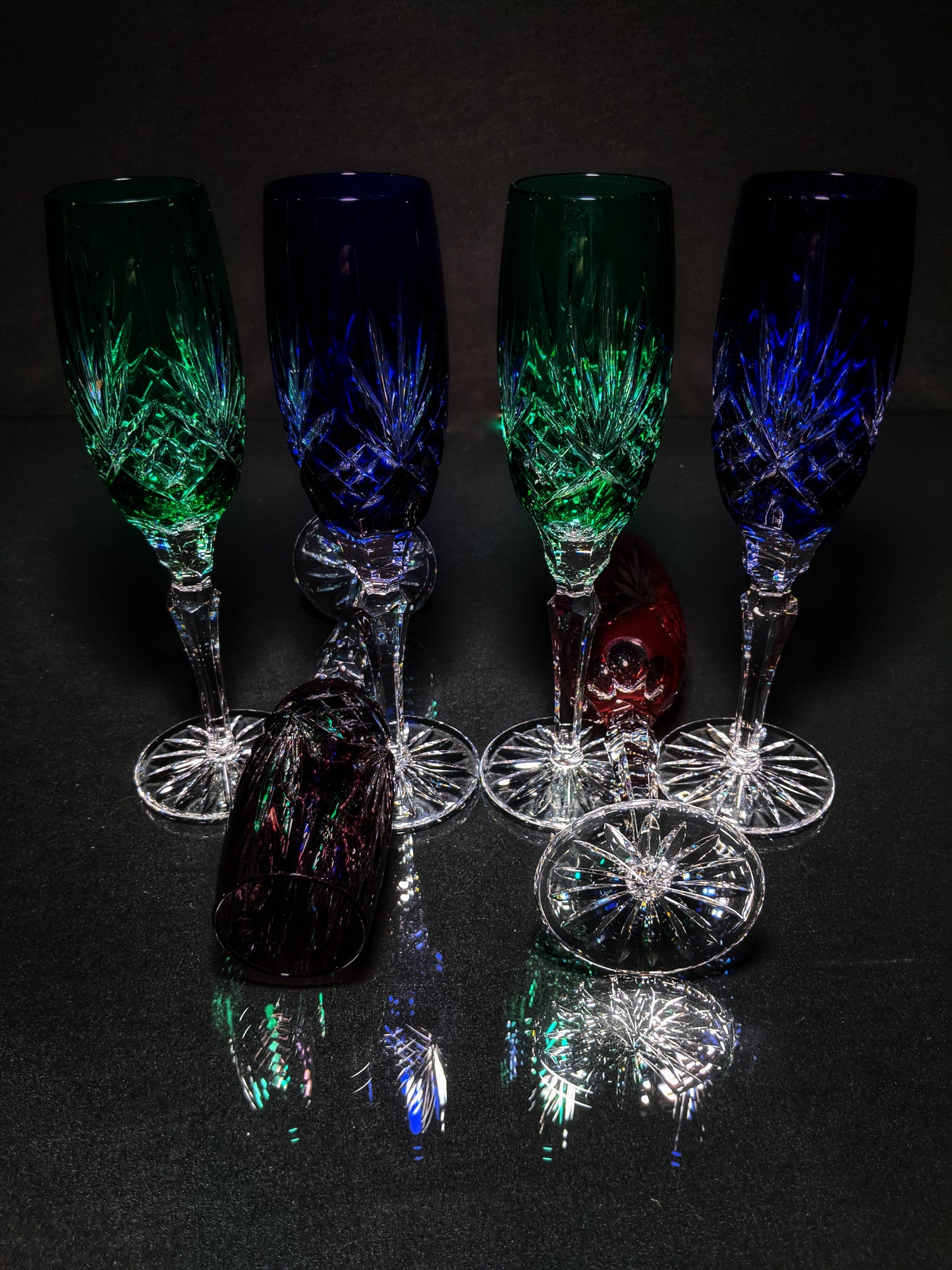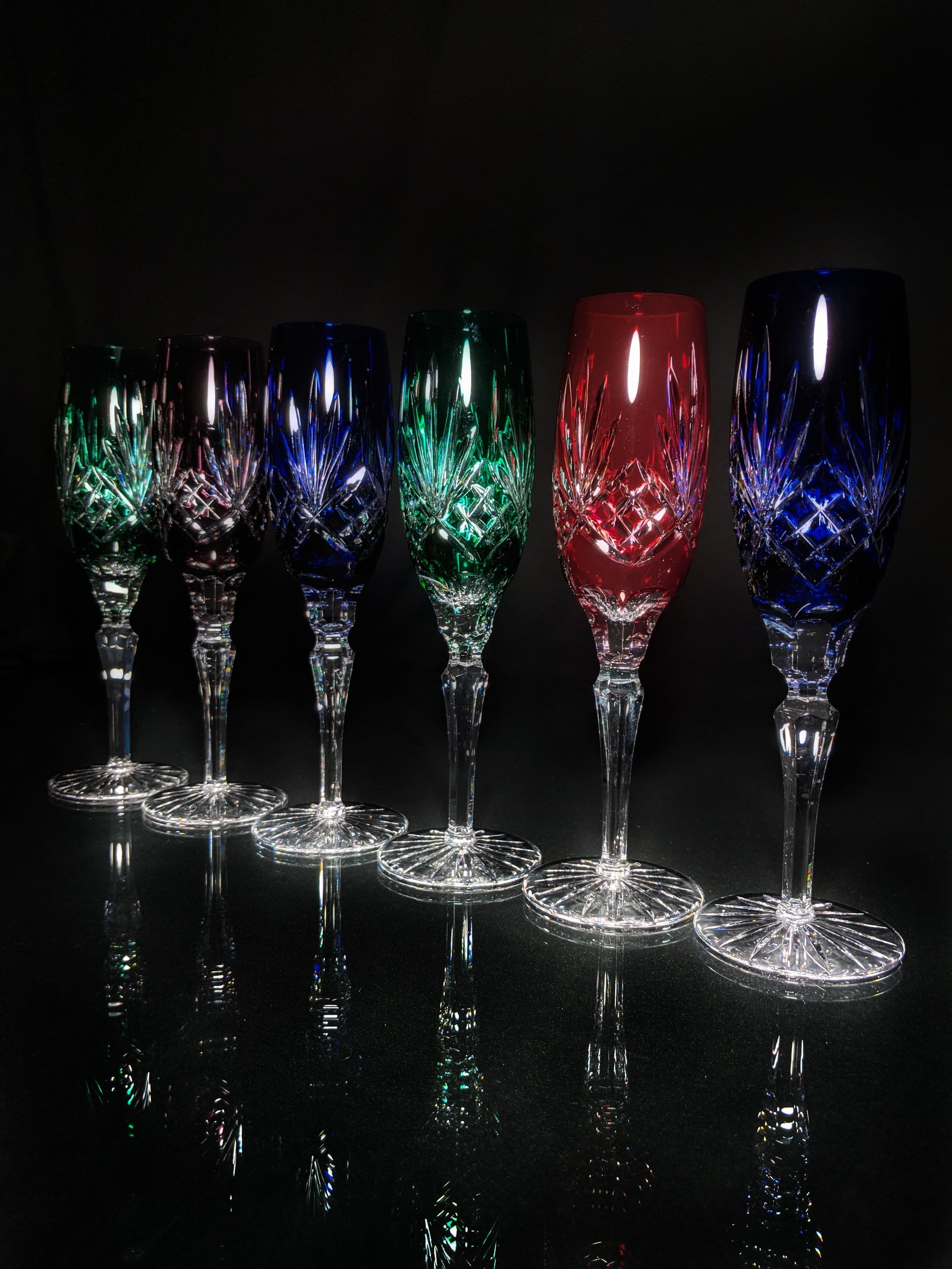 This is a set of 6 AJKA Colored Crystal Flutes. Made in Hungary. We ship worldwide fully insured. Signature is required upon delivery.