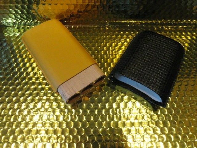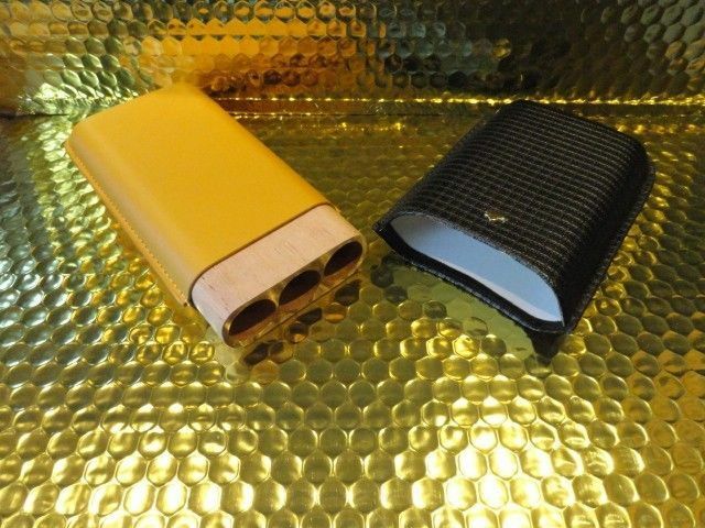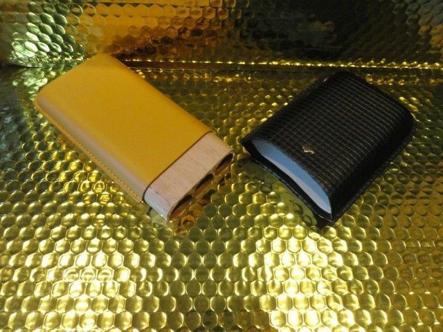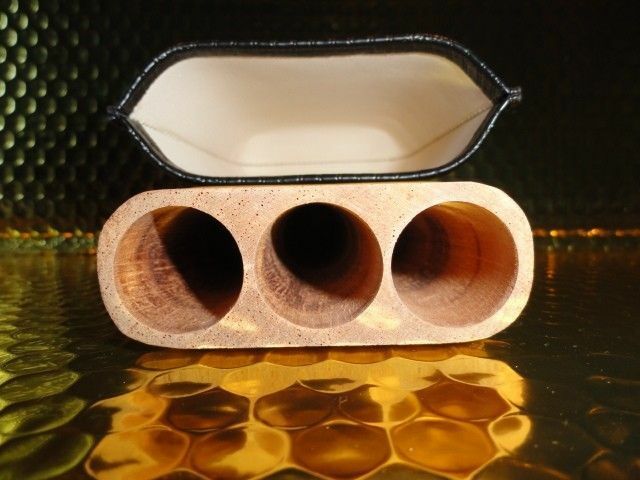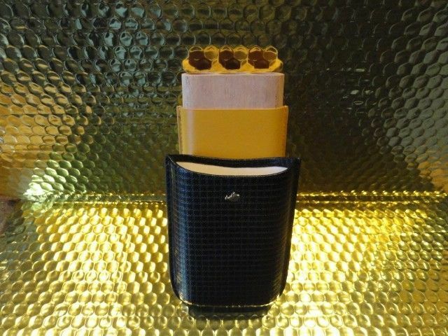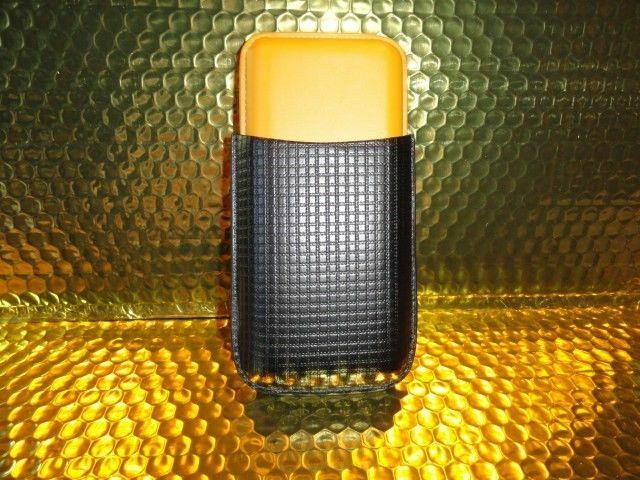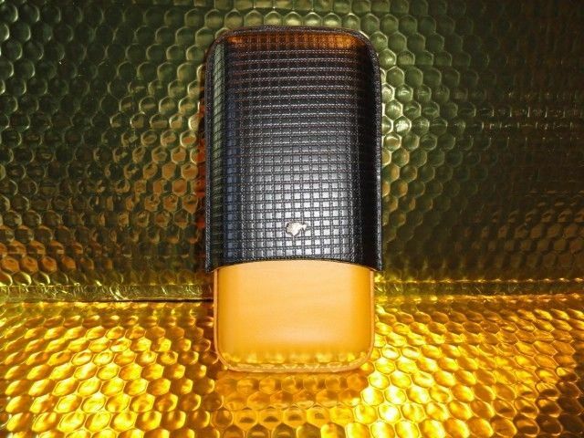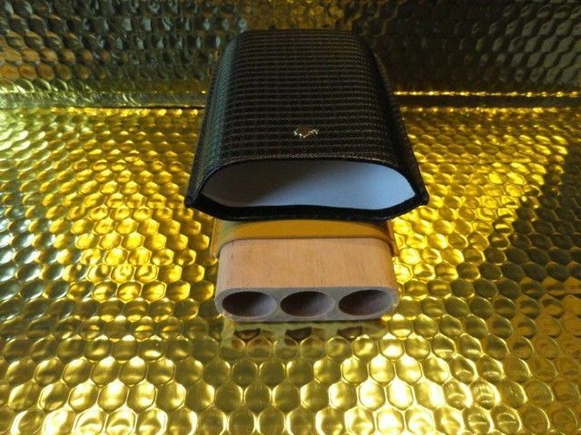 This is a new Black & Gold Leather & wood carrying case. Comes in the original box. Made for 3 Large size . Inside holes are 7/8" diameter . The long wooden slots are 6" long . The top cover allows you to adjust to the proper length of your cigars. We ship Worldwide fully insured. Thank you!
