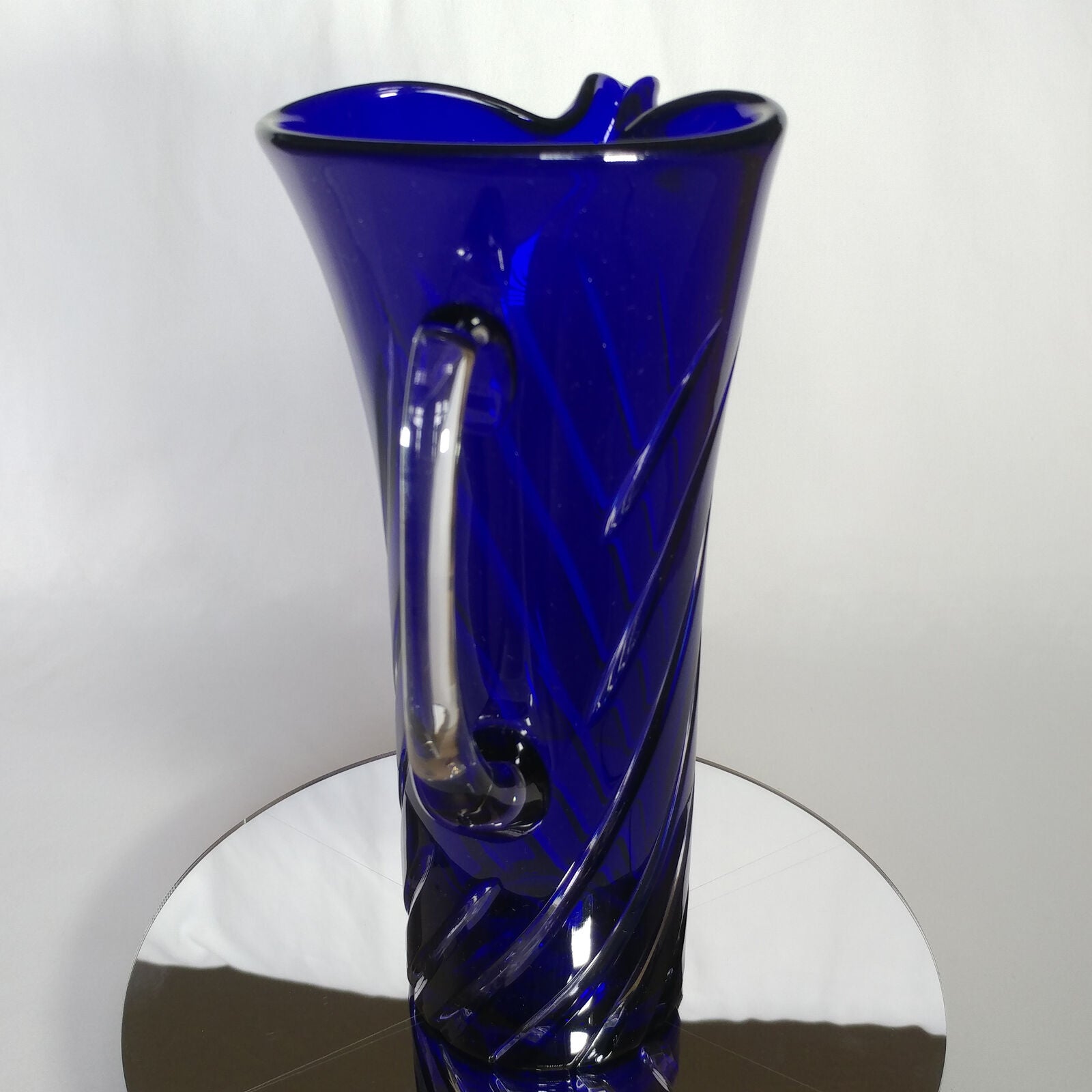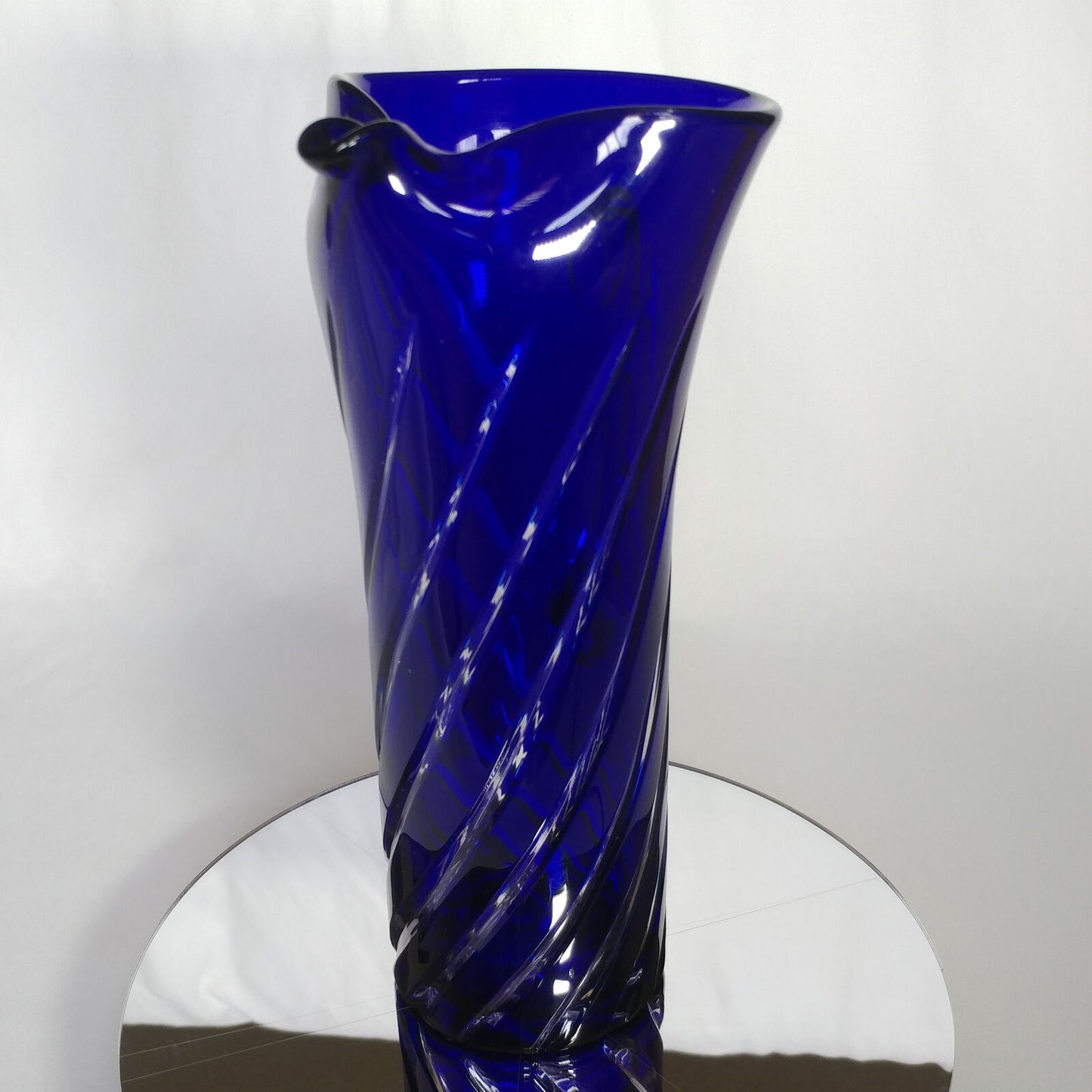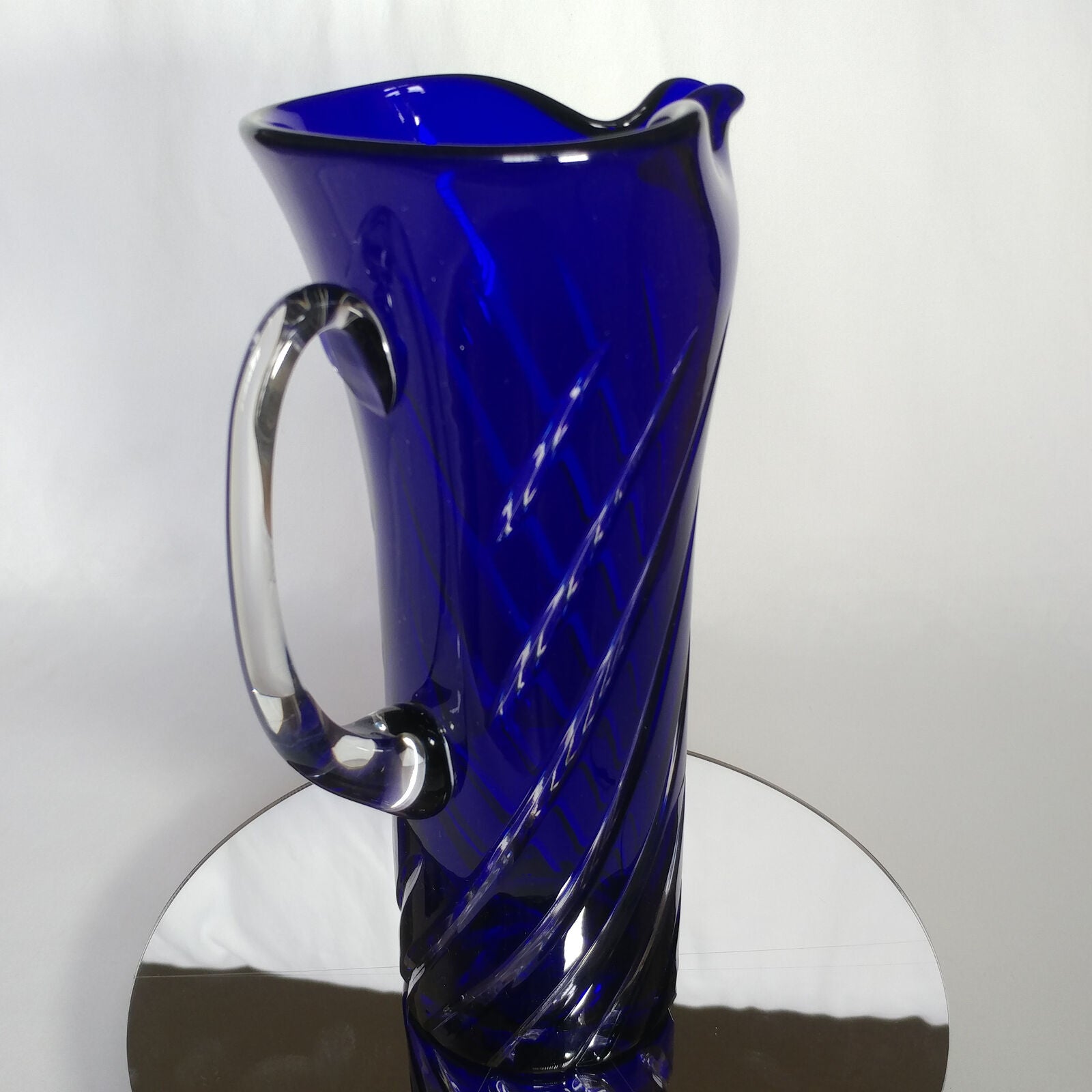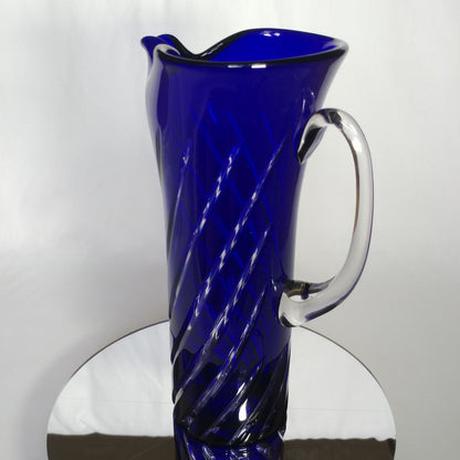 This is an 1878 Crystal Blue Glass Swirl Martini Pitcher.