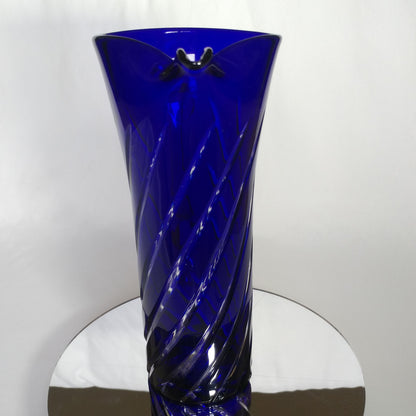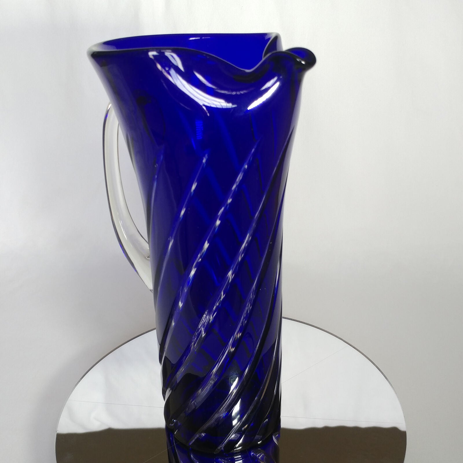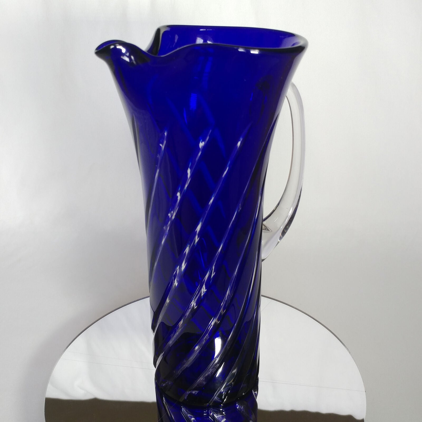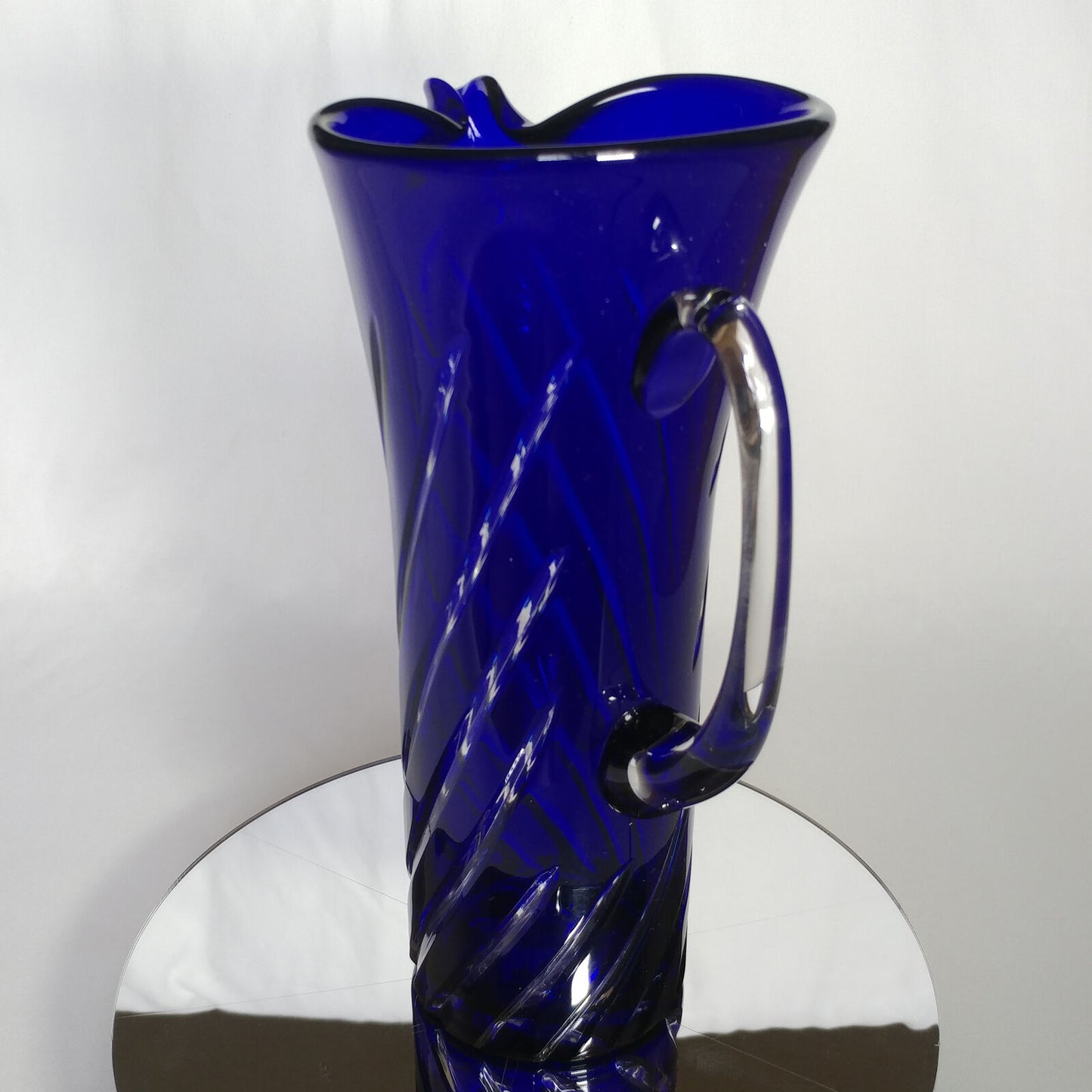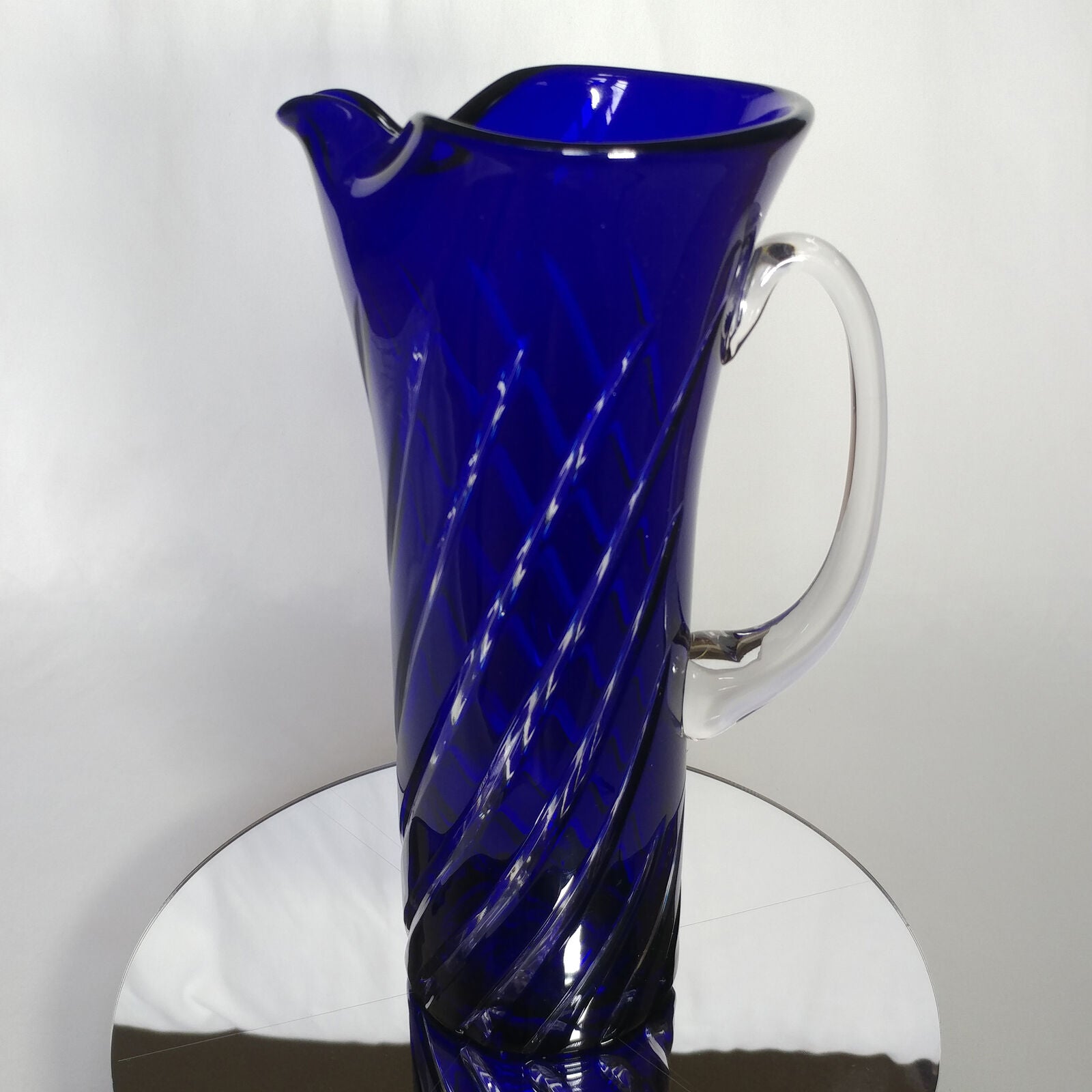This is an 1878 Crystal Blue Glass Swirl Martini Pitcher.