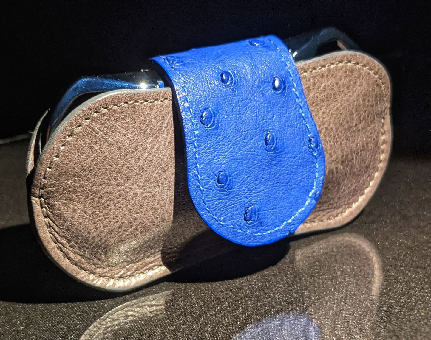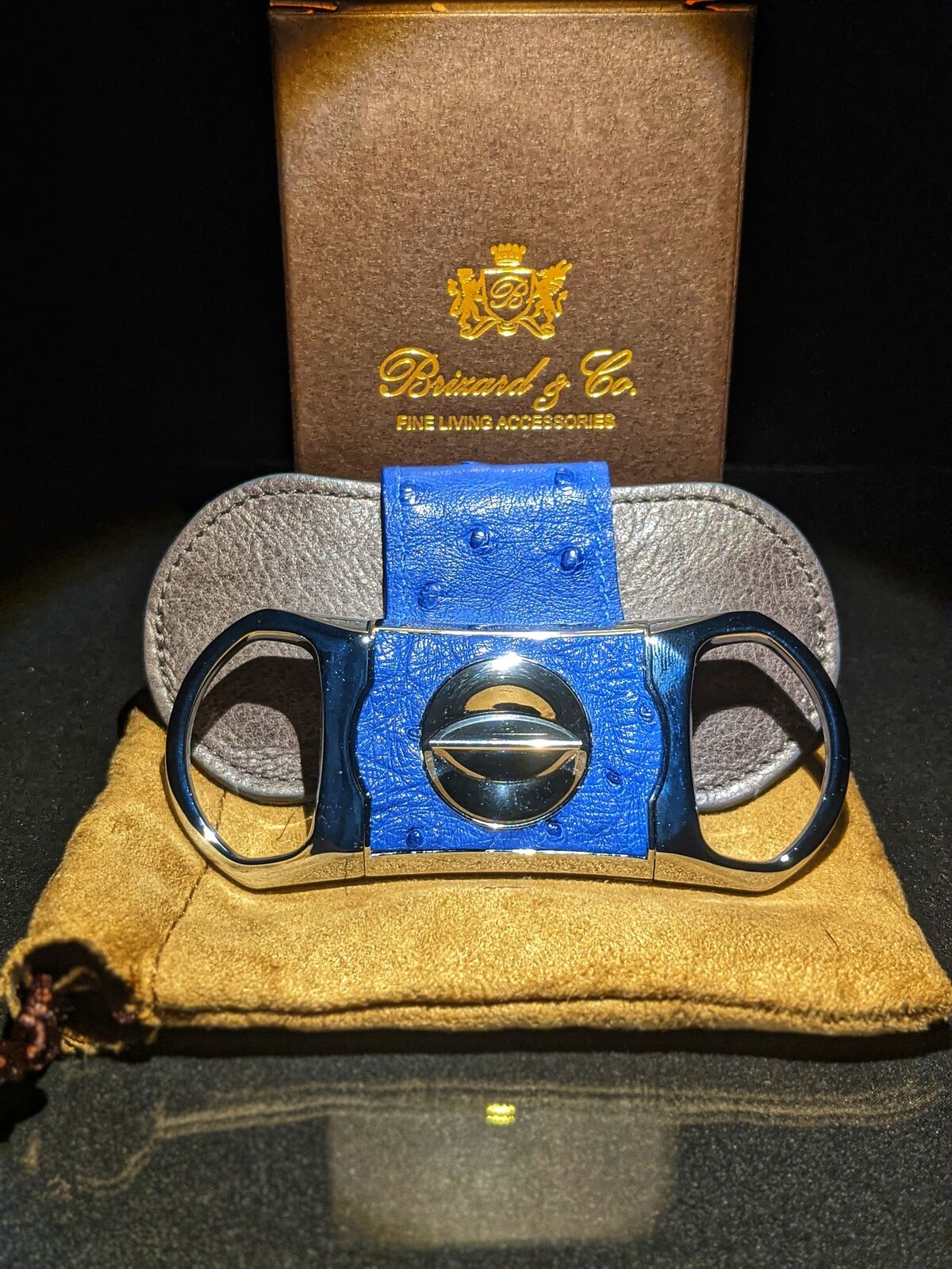This is a new Brizard and Co Blue Ostrich and Grey Leather carrying case, cutter and lighter combo, Handmade in USA . New in the original boxes with suede pouches. We ship Worldwide fully insured. Signature required upon delivery.