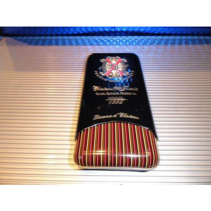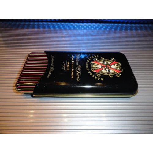 This is a pre-owned Chateau de la Fuente Rare Estate Rerserve MCMXC11 Empty cigar tin. Holds 3 cigars. Originally came with 3-Reserva de Chateau Churchill size cigars. Top cover slides to adjust to the length of your favorite cigars. These are good for carrying your cigars. We ship Worldwide fully insured. Thank you!