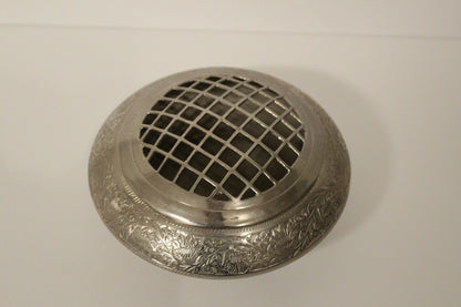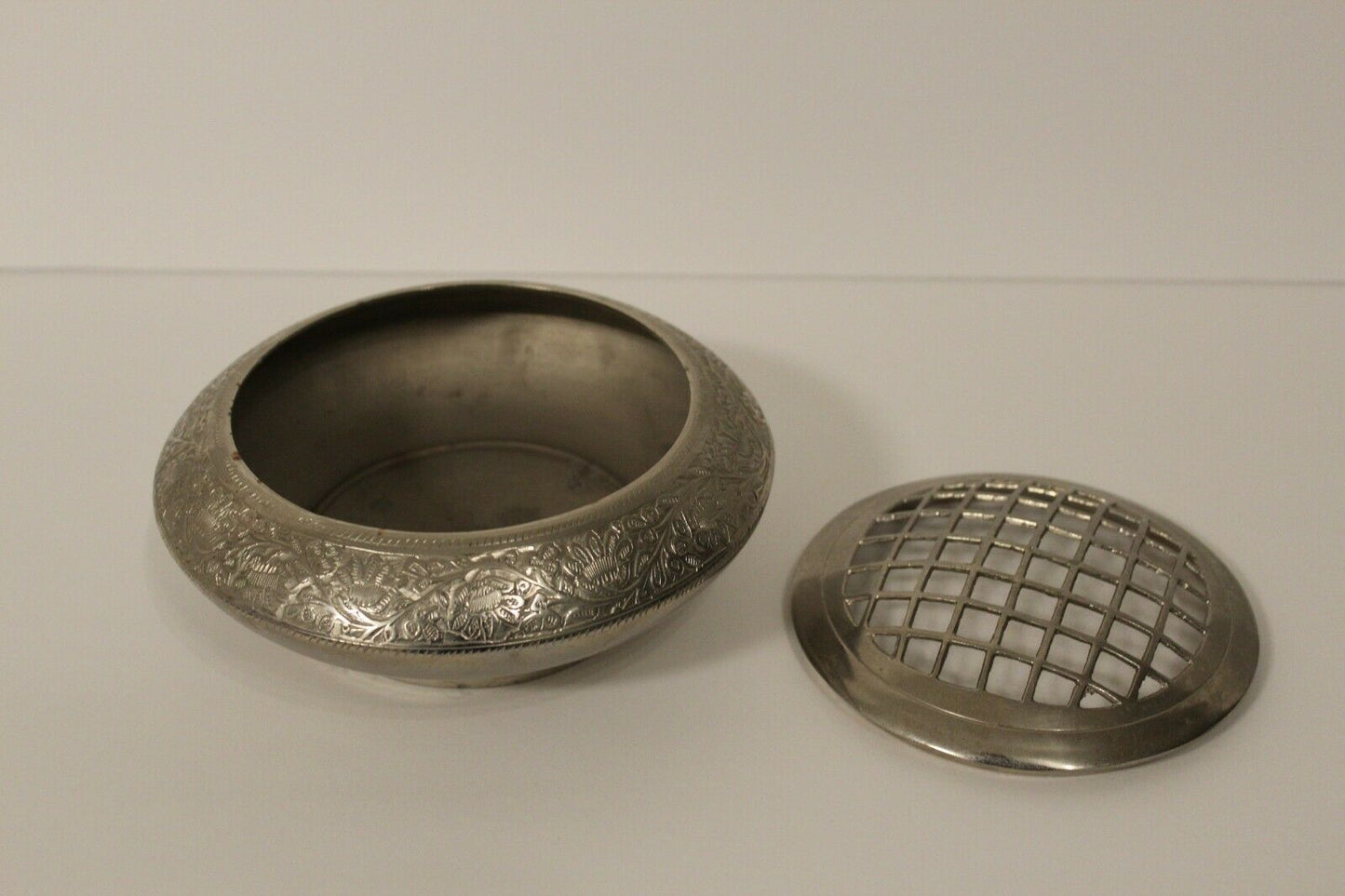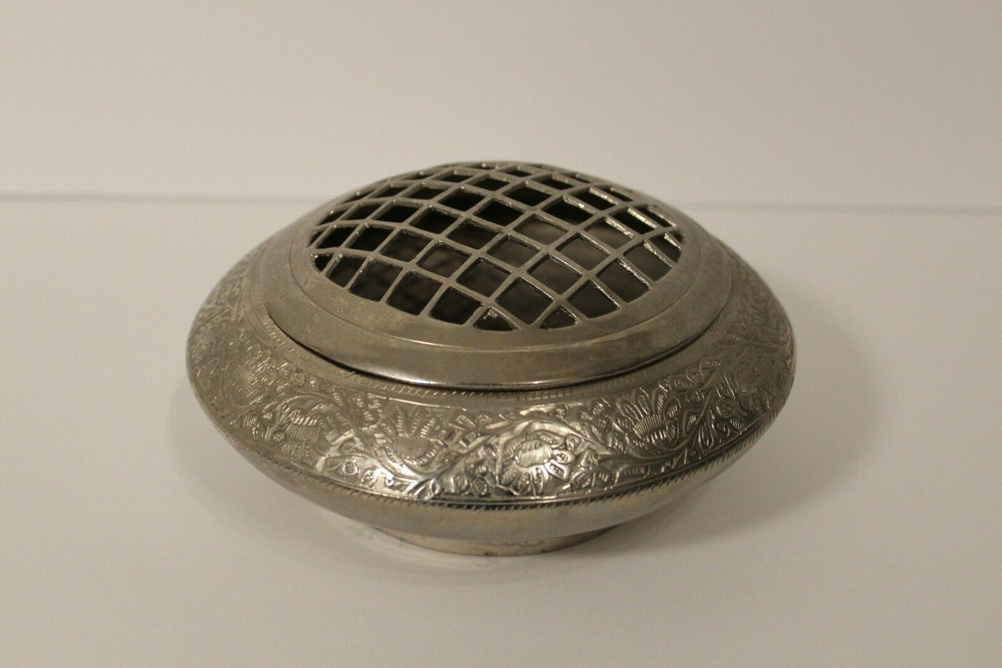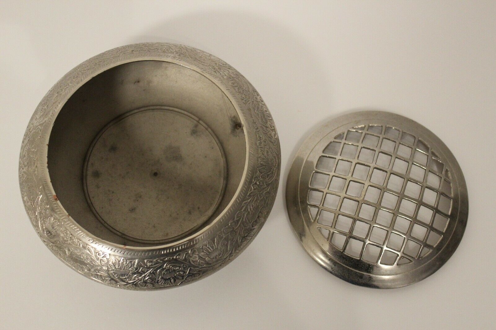 This is a Preowned Circular Metal ashtray with grated lid. In good condition. We ship worldwide fully insured