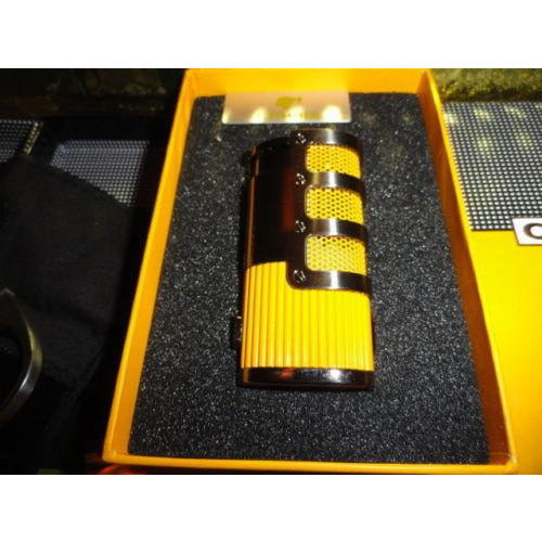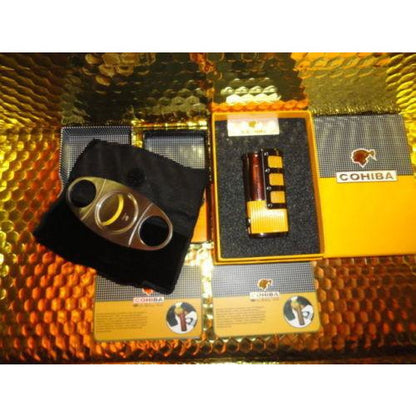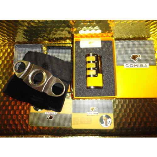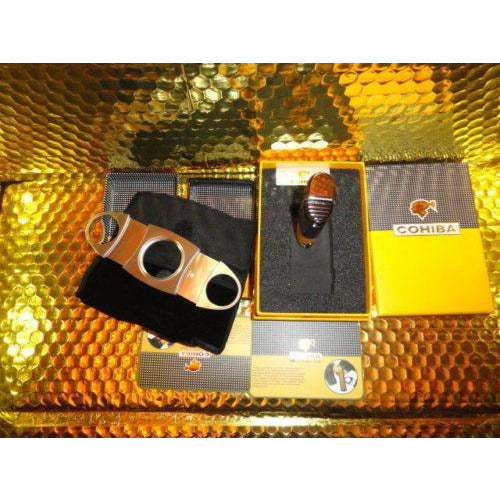 This is a new Stainless Steel double blade cigar cutter. Comes new in the box with black carrying pouch. Cutter measures approx 4" L x 1 3/4" W. Has a 1 1/4" opening to allow you to clip your largest ring gauge cigar. Also include is a Lighter new in the box. Made in China. We ship World wide .