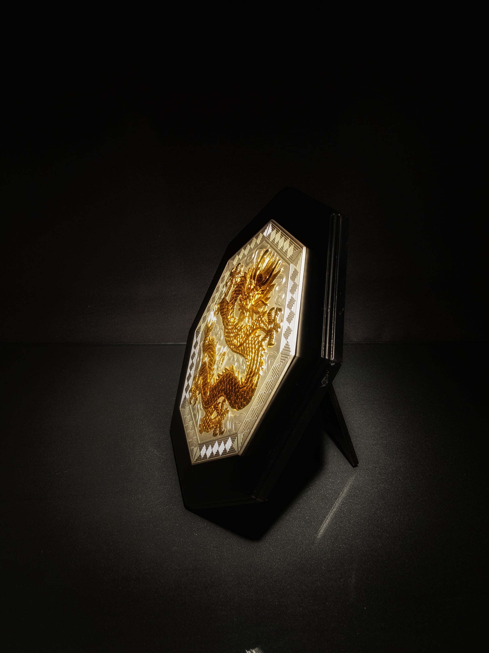 This is a Royal Selangor Dragon made of Pewter and Gold Plated. Made in Malaysia. Measures 14" x 14" . Has hanging slot or arm to stand up on shelf or table etc.