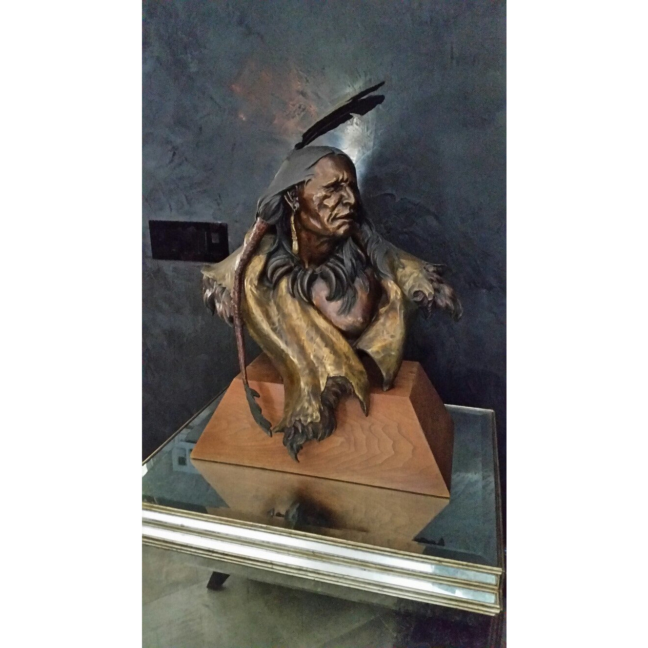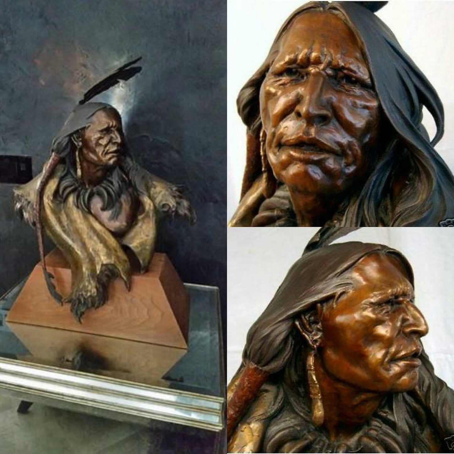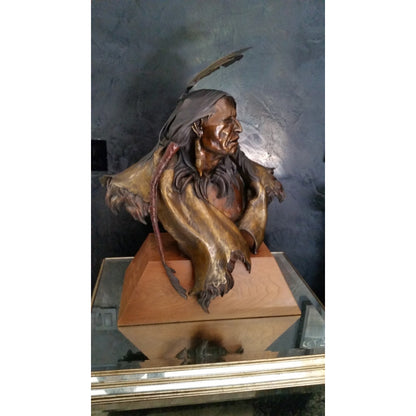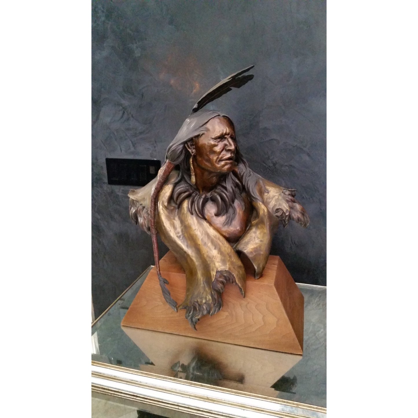 Years of research went into creating the historical accuracy of the clothes , splendid necklace and jewelry of this remarkable bronze sculpture. This sculpture exudes nobility, stoicism, and strength. It speaks eloquently of the pain and poignancy of the Native American experience. His sensitivity to Native Americana, anatomical mastery, and the unusual delicacy of the patina are Dan Garrett's hallmarks.