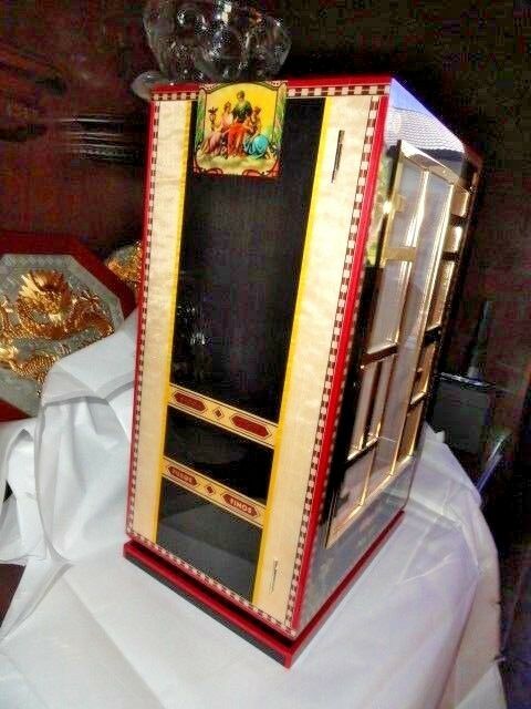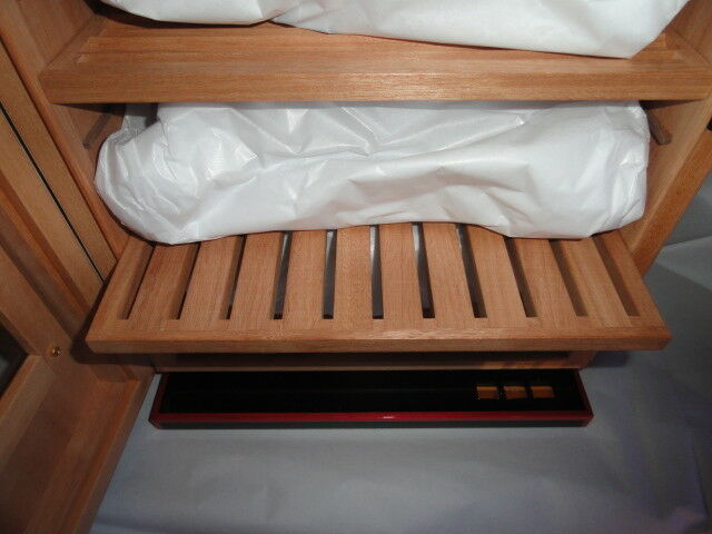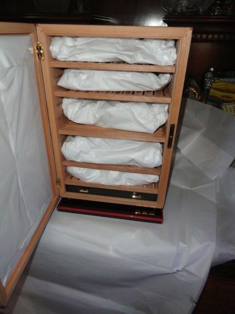 This is a new Elie Bleu Alba Black Sycamore Cabinet 150 count Humidor. Made in France. Comes with shelfs for single cigars or boxes that are all adjustable or can be pulled out of grooved slots as needed. Also has one drawer to hold accessories . Comes with lock and key to keep your fine cigars safe. Measure approx : 450 mm x 310 mm x 22o mm or 17.716 " H x 12.204" W x 8.661" D . Comes in Elie Bleu Factory packed box . Has 2 -Elie Bleu Humidifiers , multiple slide out trays for storing your favorite boxes. These are photos of a previous cabinet we sold. This new one is being completed at the factory and should be here and ready to ship in late November. We Ship fully insured to your door. Signature is required upon delivery. Thank you!