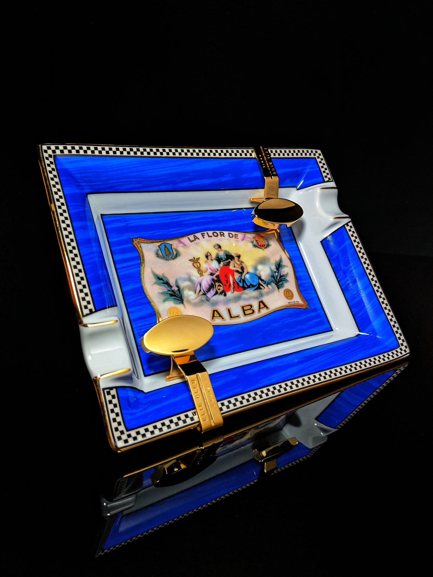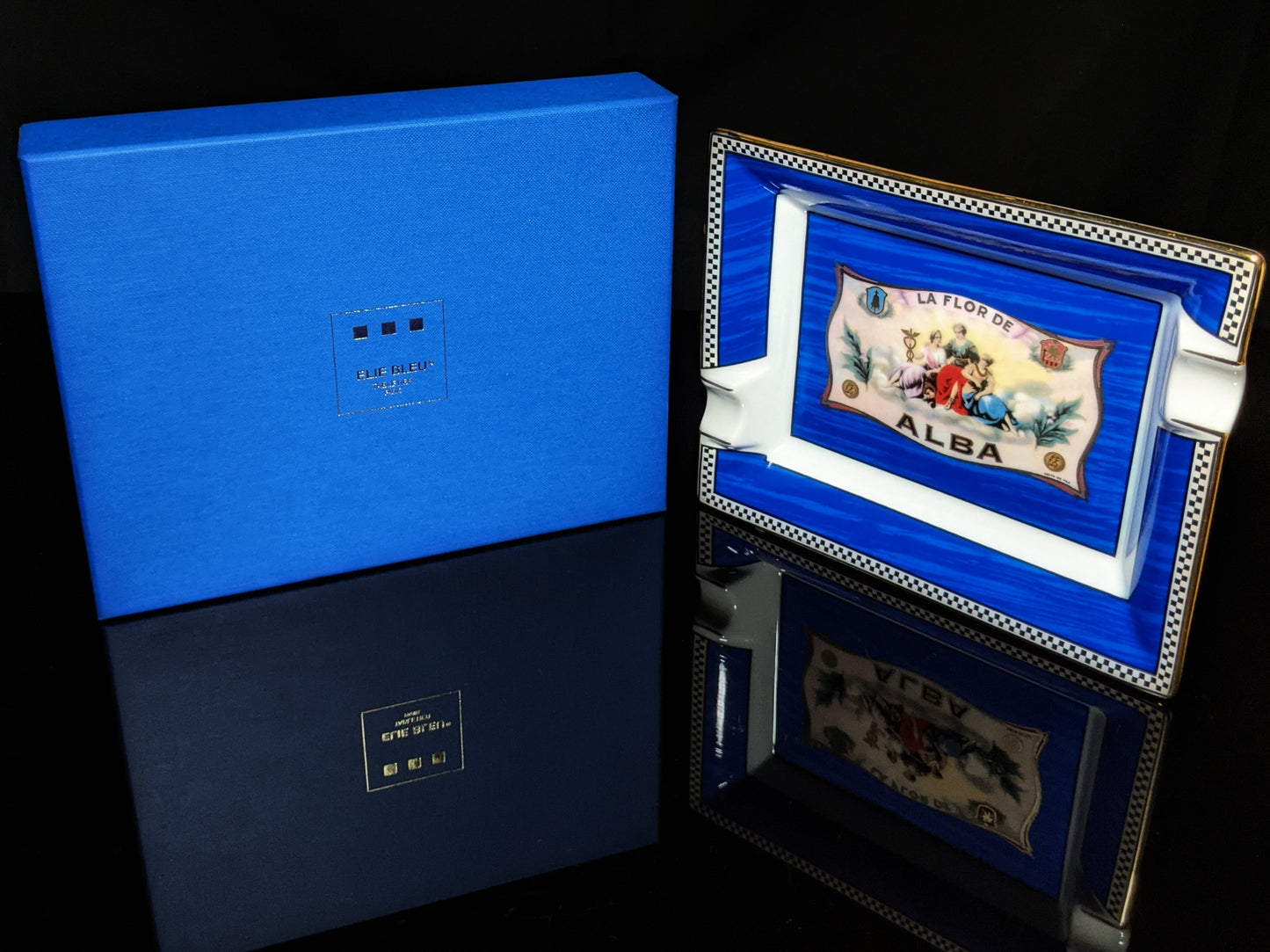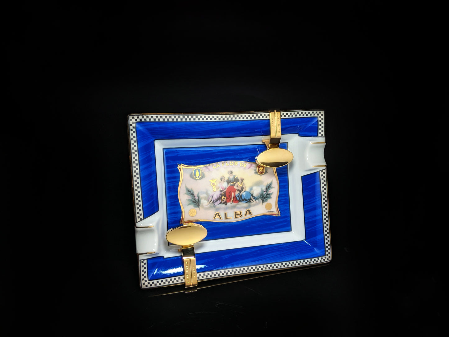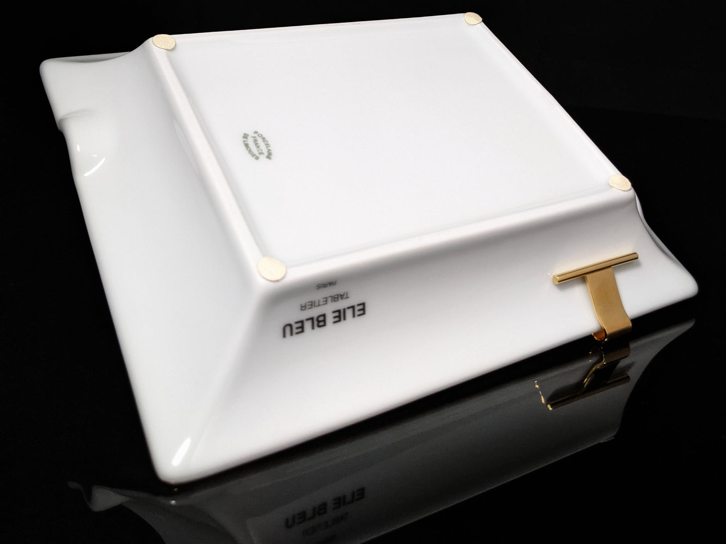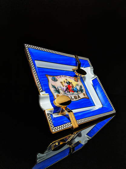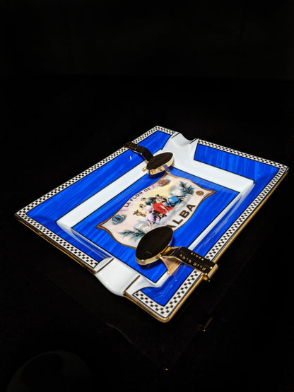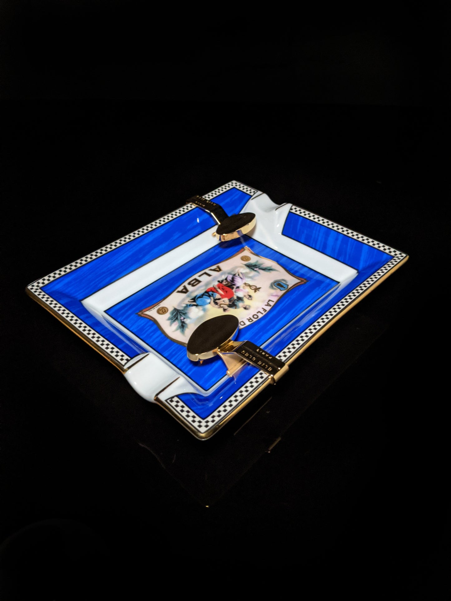 Elie Bleu Alba Porcelain Blue Ashtray with Gold Plated Rests NIB