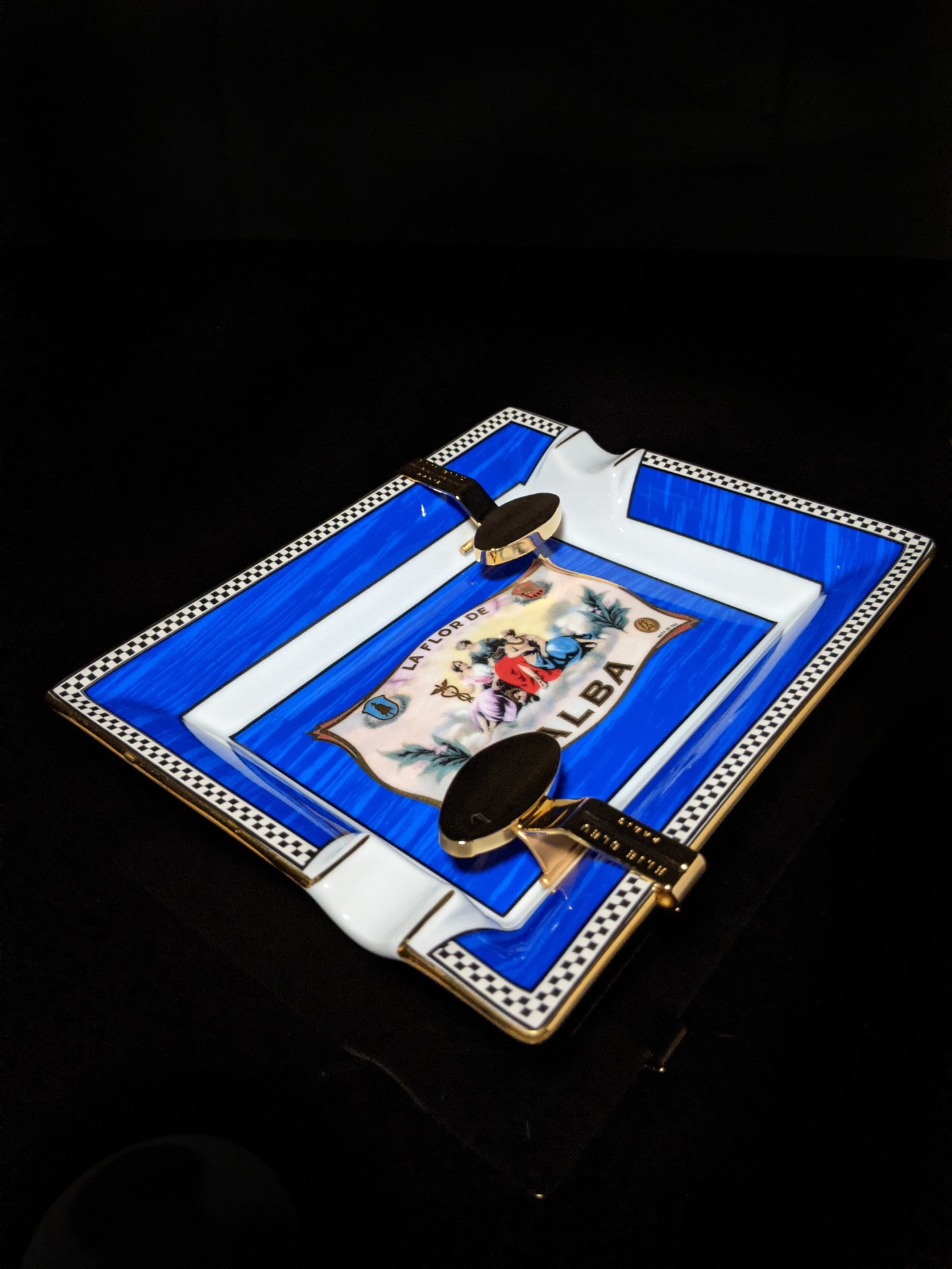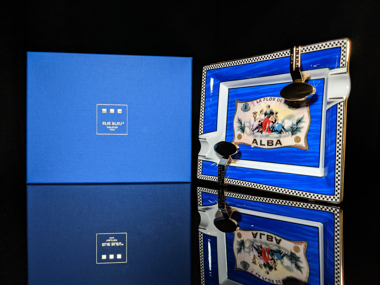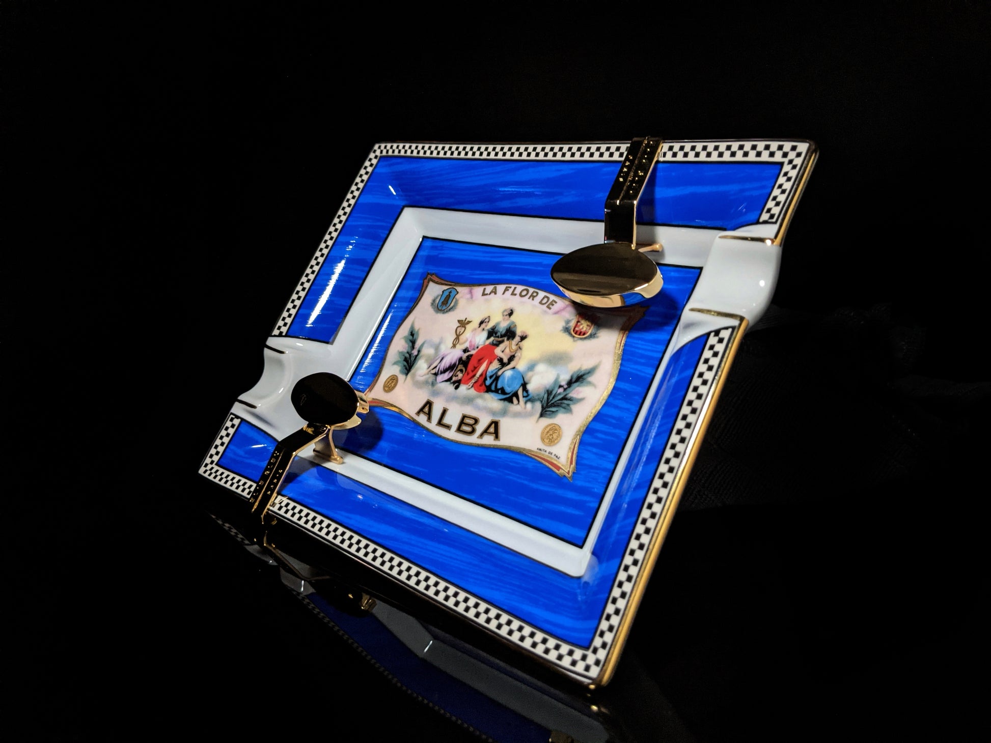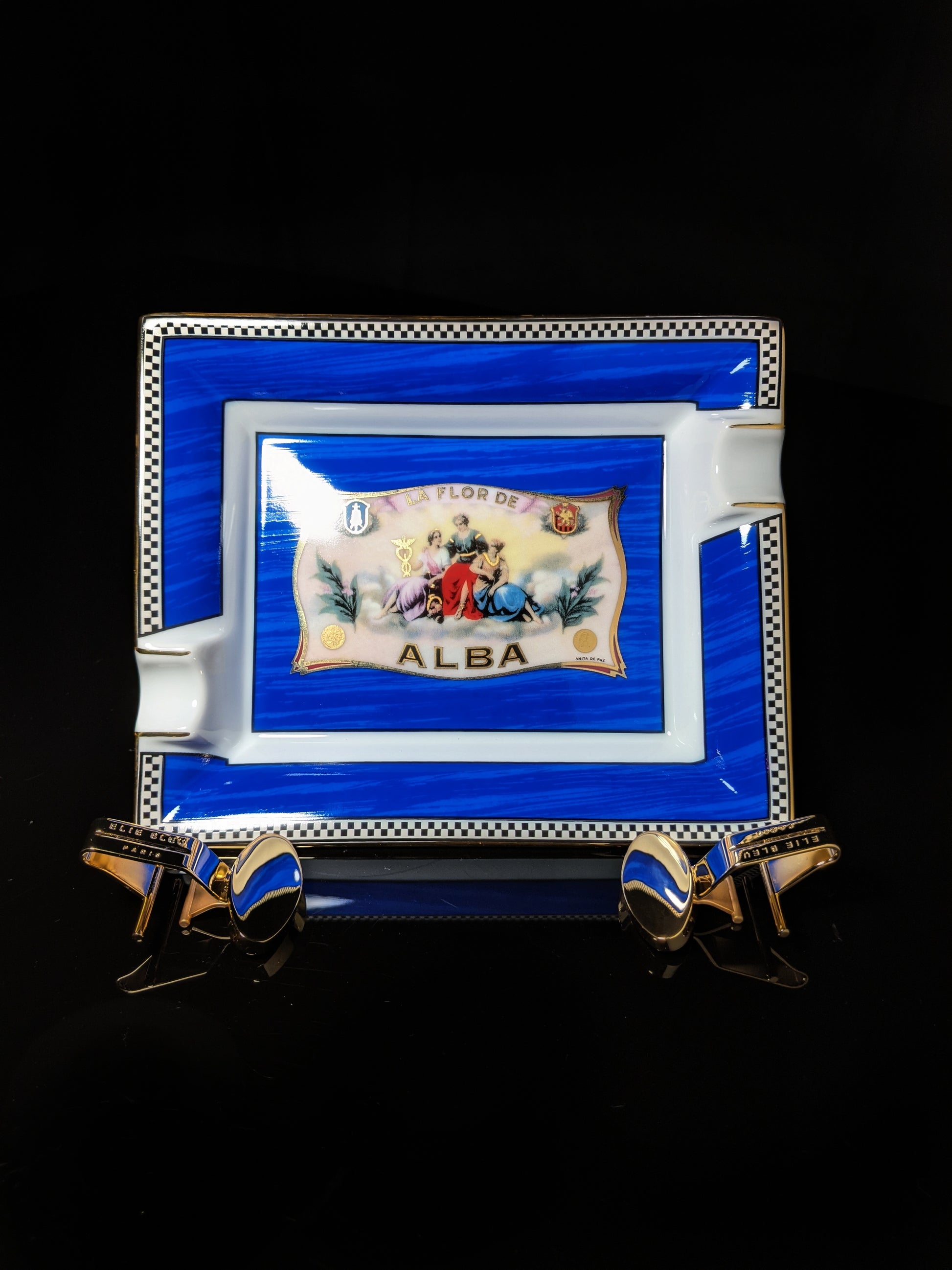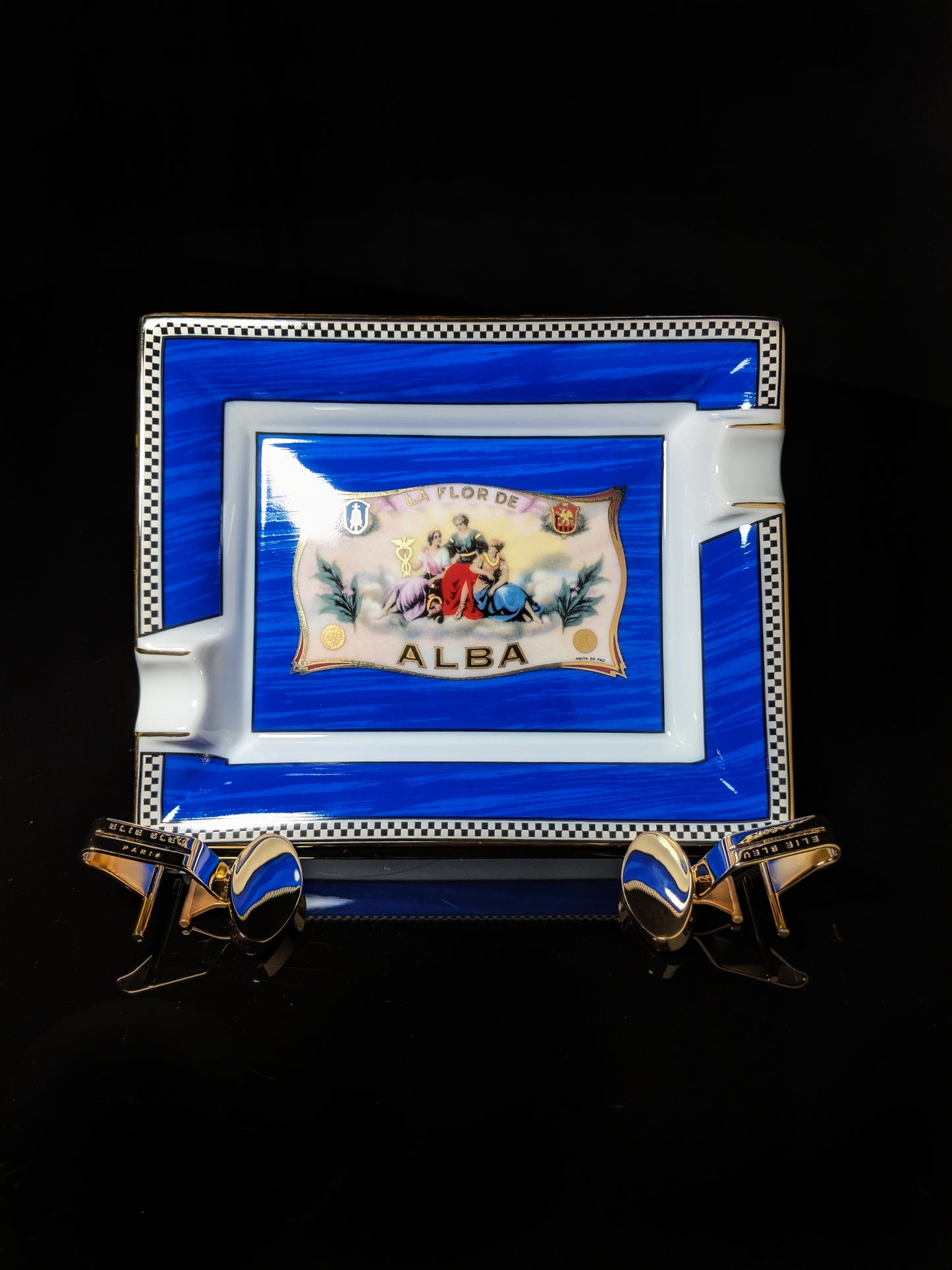 Elie Bleu Alba Porcelain Blue Ashtray with Gold Plated Rests NIB
