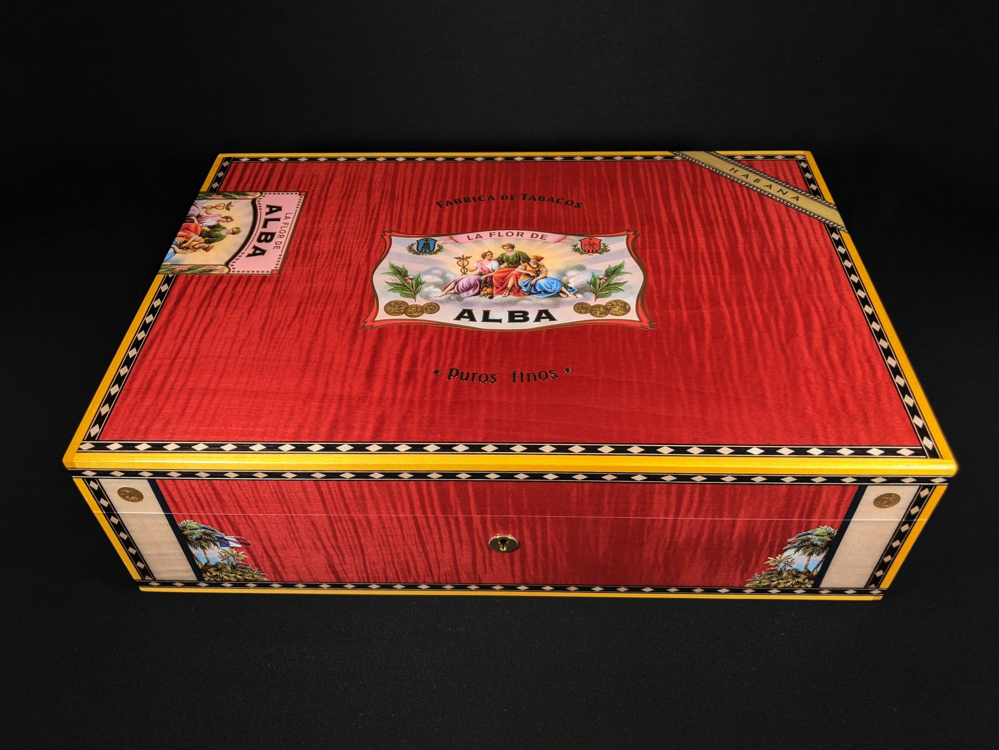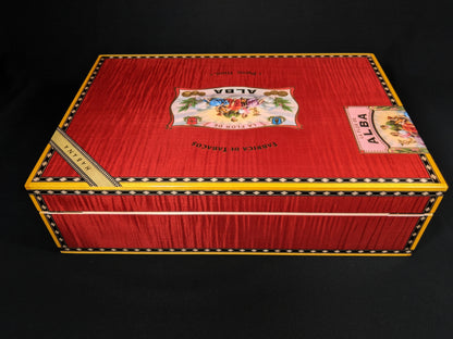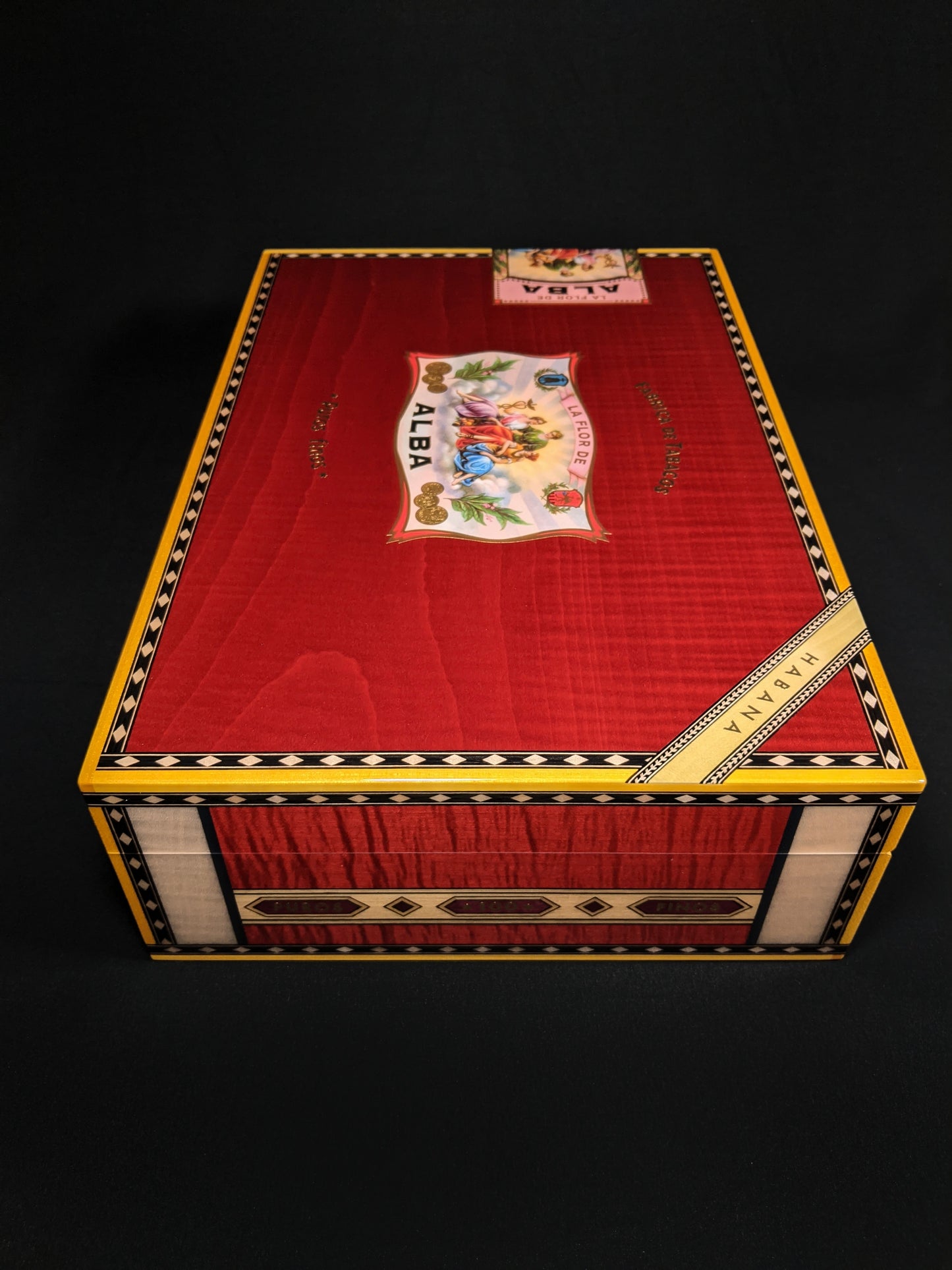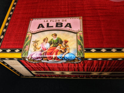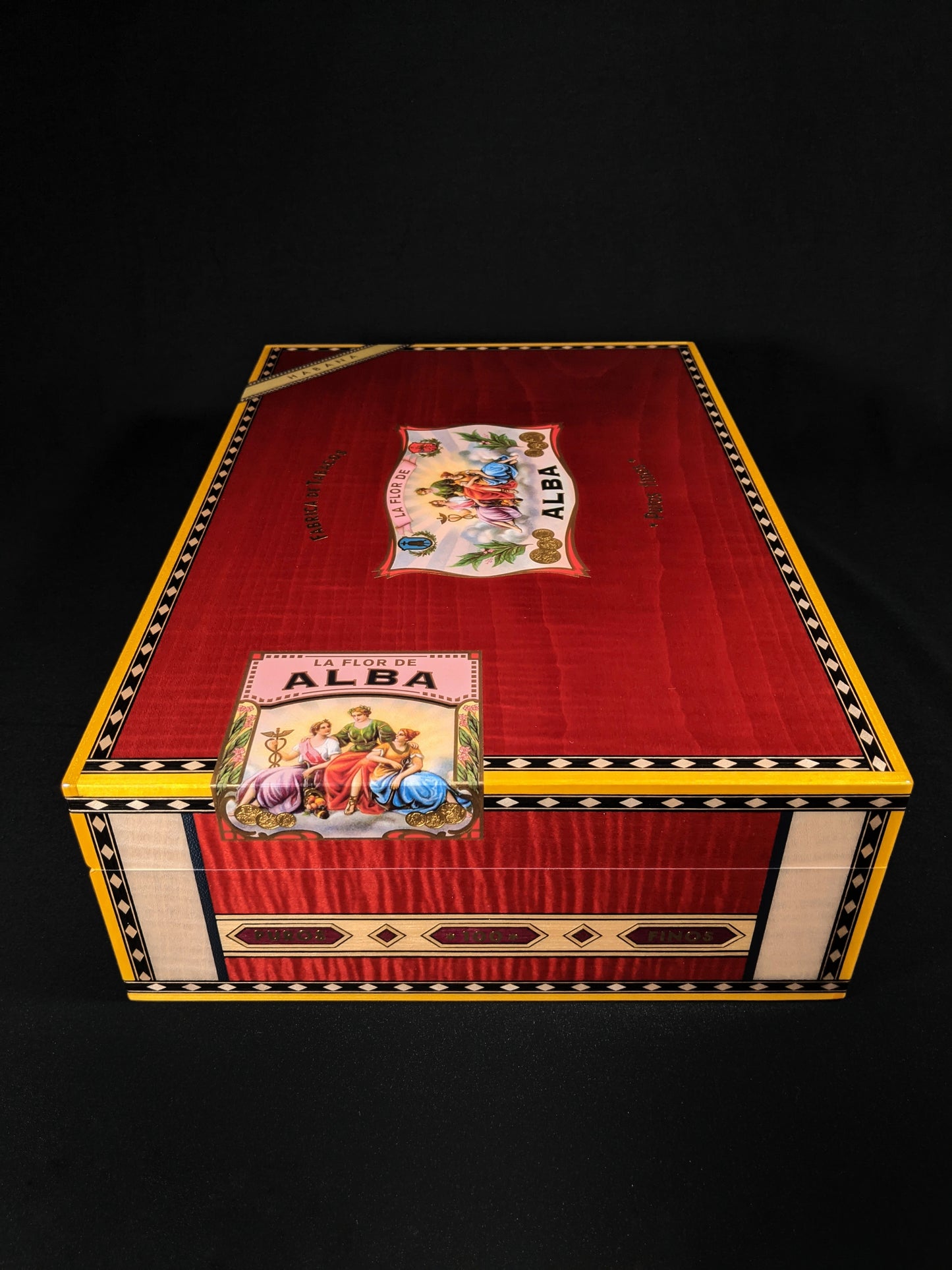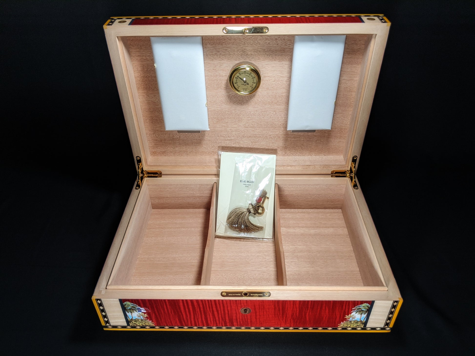This is a Brand new pristine Elie Bleu Flor De Alba Red 110 count  Humidor. Measures 14 " L x 9" W x 2 7/8" H.  Comes in the original Elie Bleu Presentation Box . Has 2 -Elie Bleu Humidifiers ,  2 dividers and  locking lid with key . We Ship Worldwide fully insured. We are using photos of a 200 count . We have the Elie Bleu 110 Red Sycamore humidor in stock in the sealed factory presentation box. Ready to ship.  Signature required upon delivery