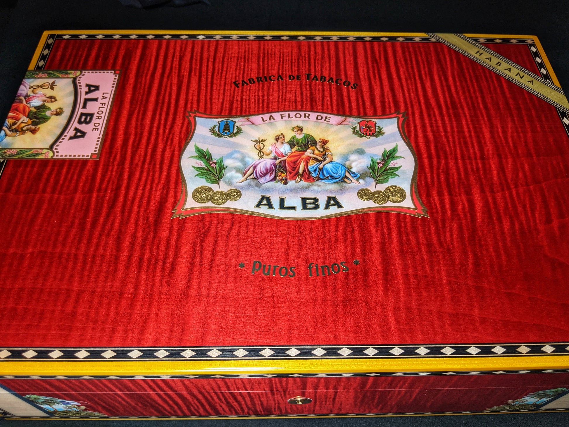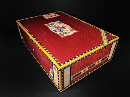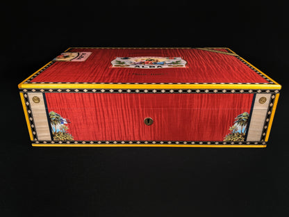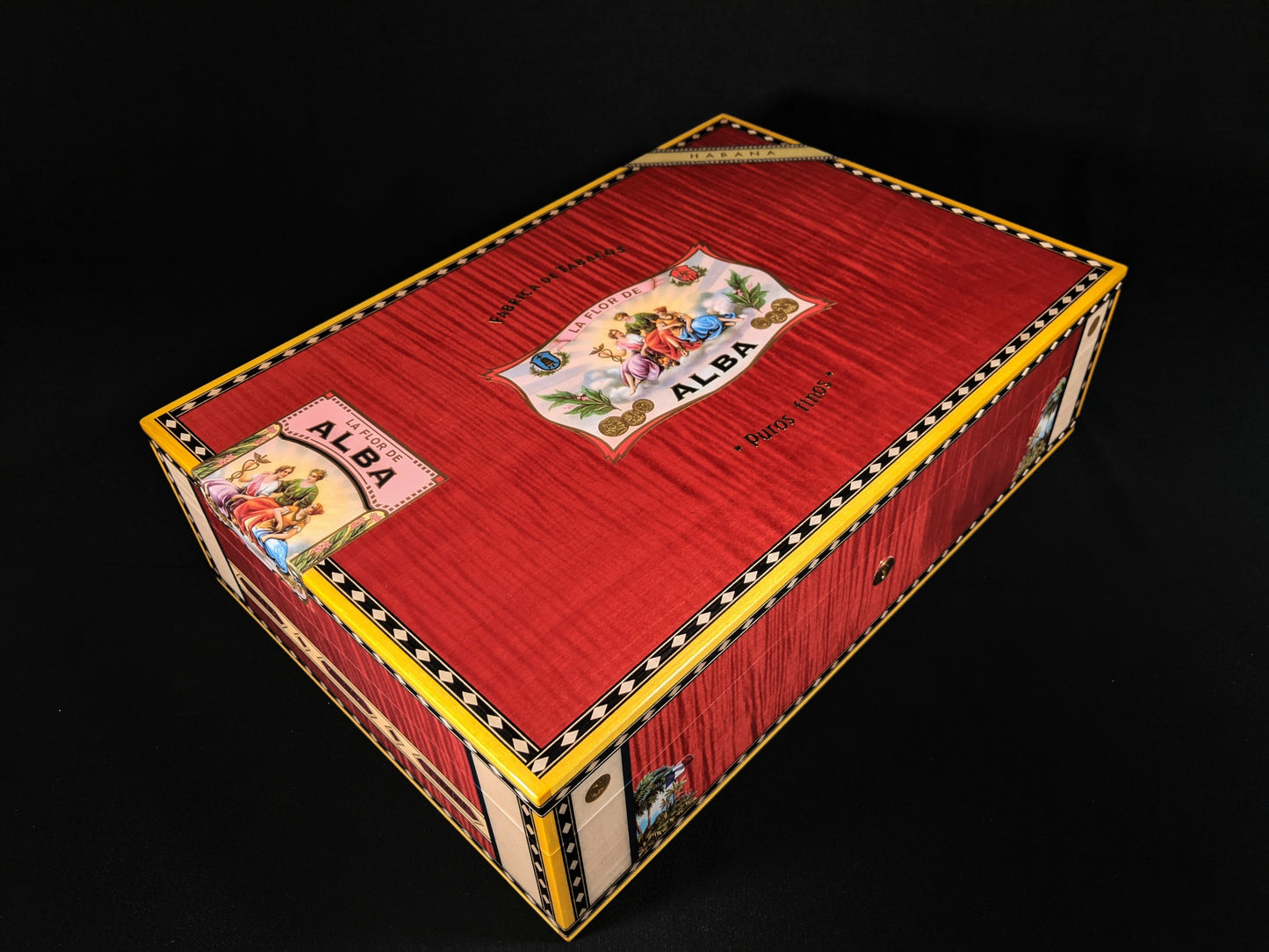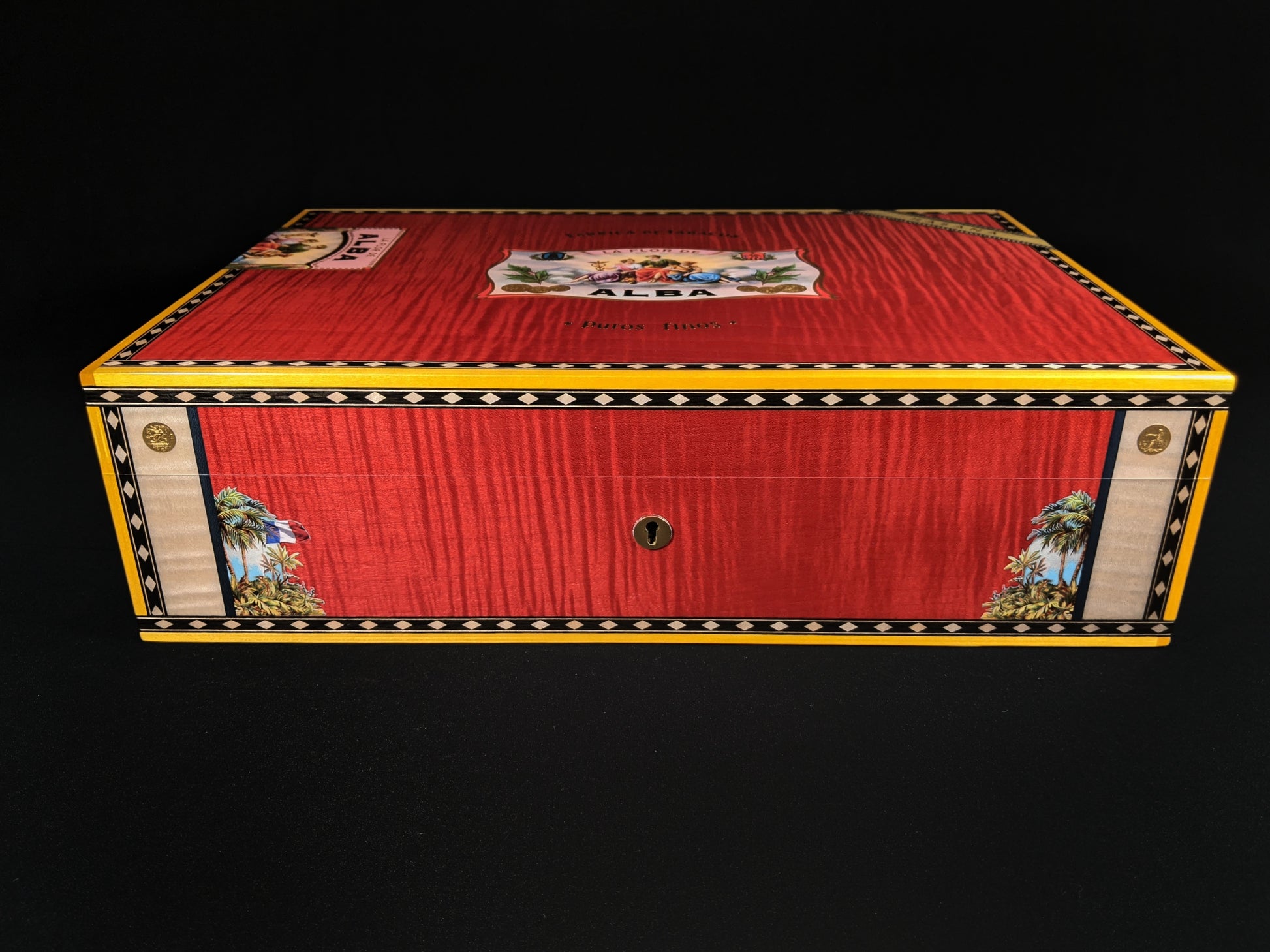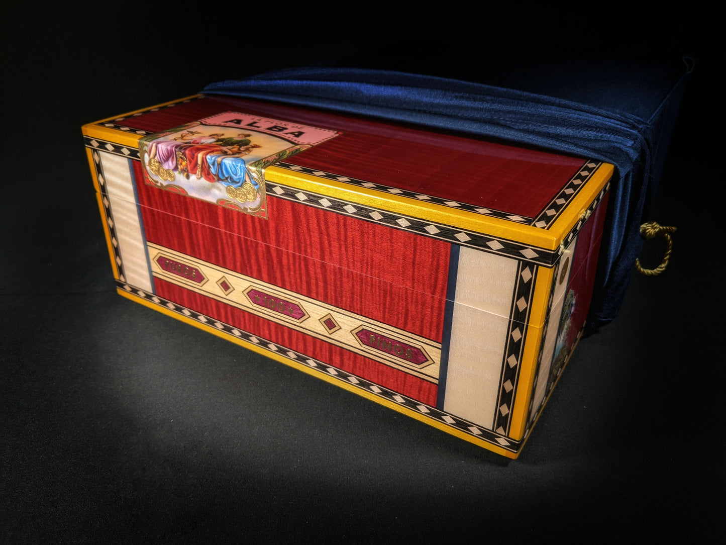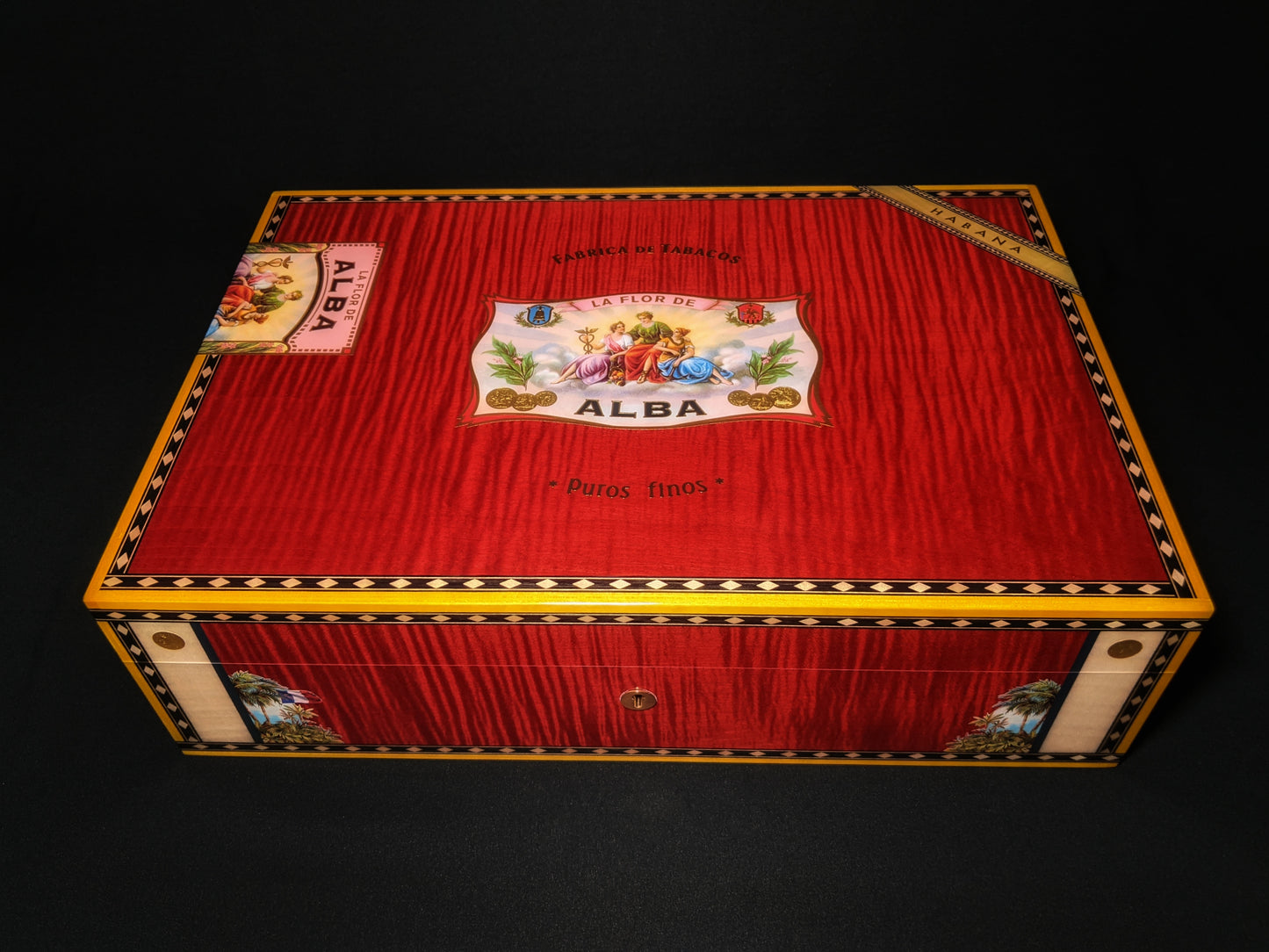 This is a Brand new pristine Elie Bleu Flor De Alba Red 110 count  Humidor. Measures 14 " L x 9" W x 2 7/8" H.  Comes in the original Elie Bleu Presentation Box . Has 2 -Elie Bleu Humidifiers ,  2 dividers and  locking lid with key . We Ship Worldwide fully insured. We are using photos of a 200 count . We have the Elie Bleu 110 Red Sycamore humidor in stock in the sealed factory presentation box. Ready to ship.  Signature required upon delivery