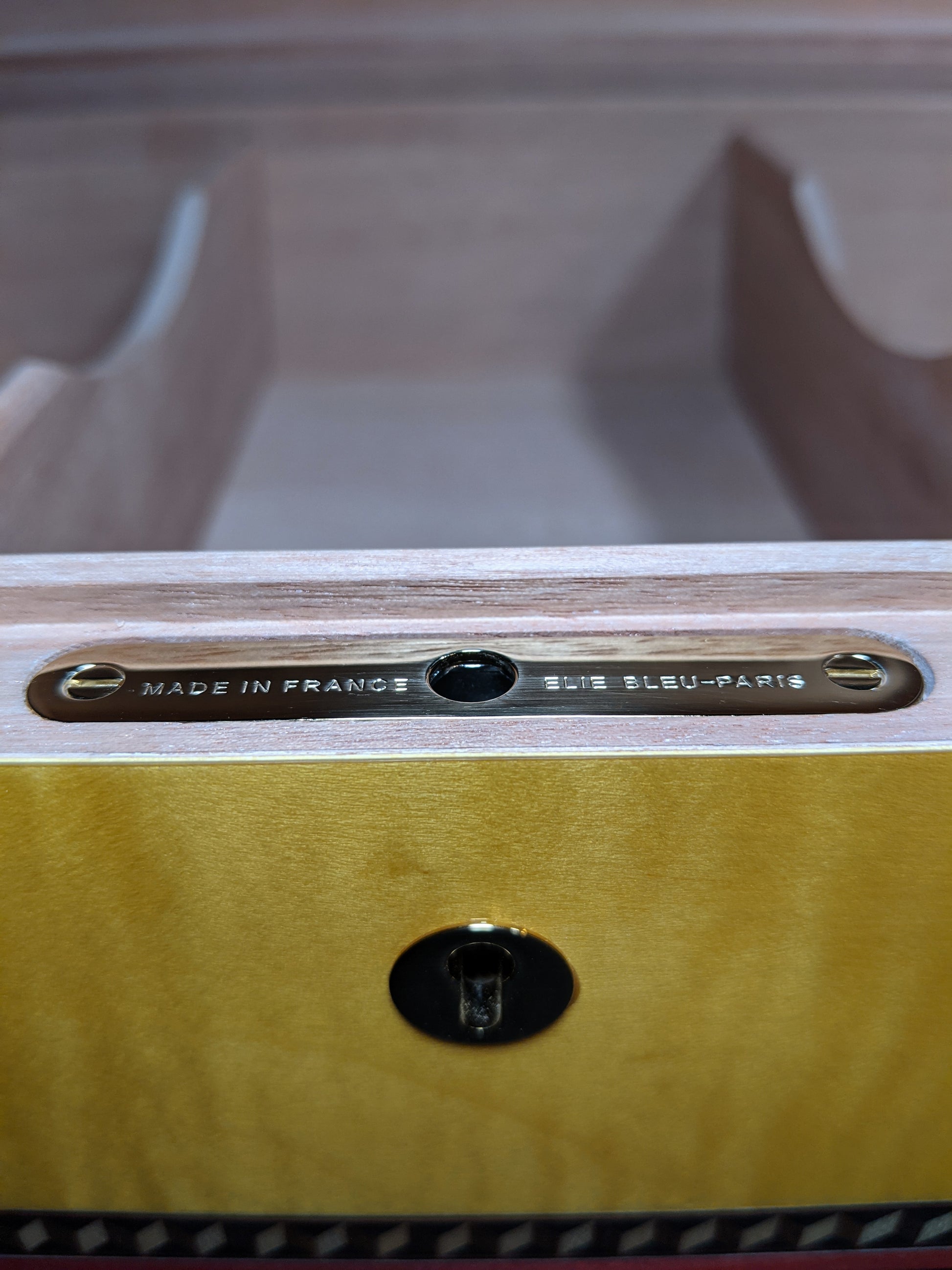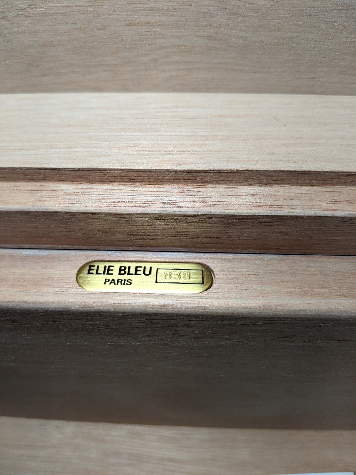 This is a new  Elie Bleu Alba Yellow Sycamore Wood 110 count  Humidor. Measures 14  " L x 9" W x 2 7/8" H.  Comes in the original Elie Bleu Presentation Box . Has 2 -Elie Bleu Humidifiers , dividers and  locking lid with key . Made in France. This humidor is in stock and ready to ship.  We Ship fully insured. Signature is required upon delivery. Thank you!