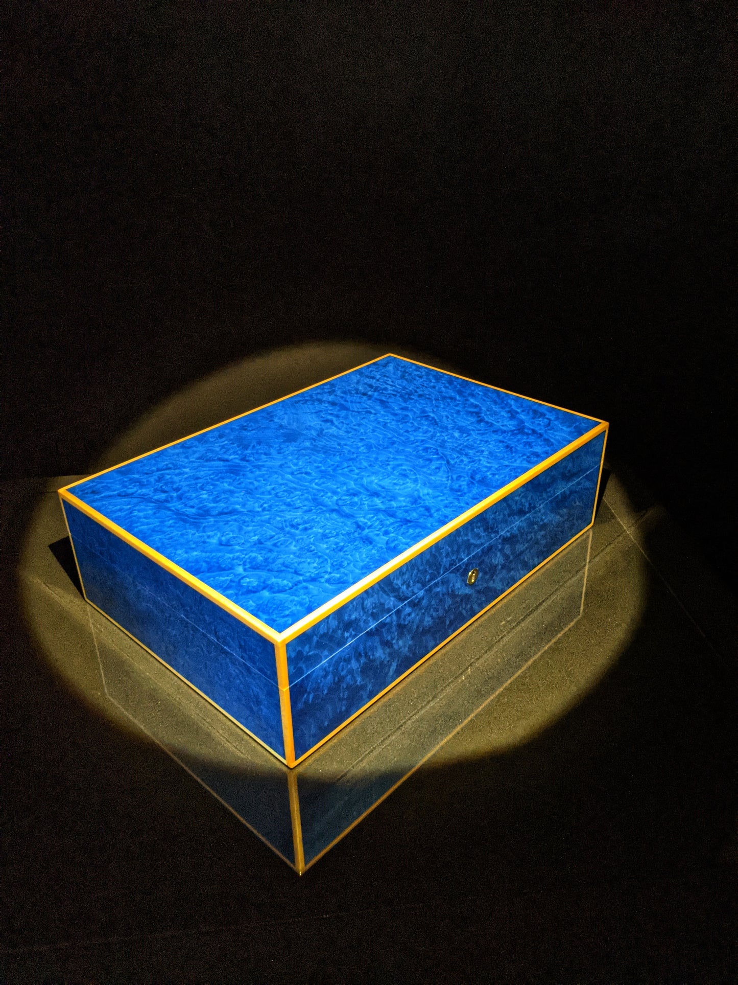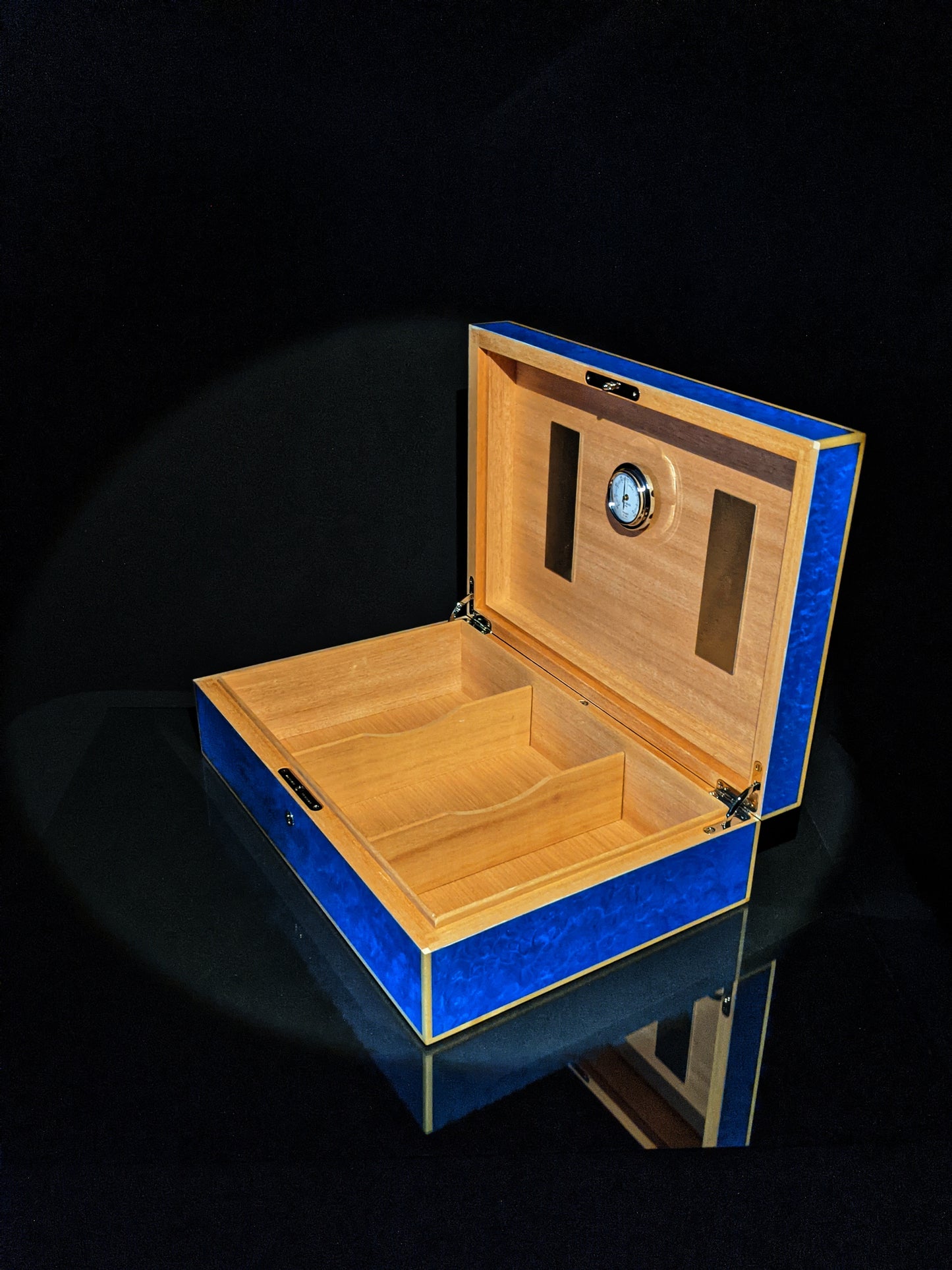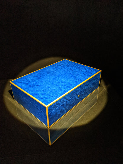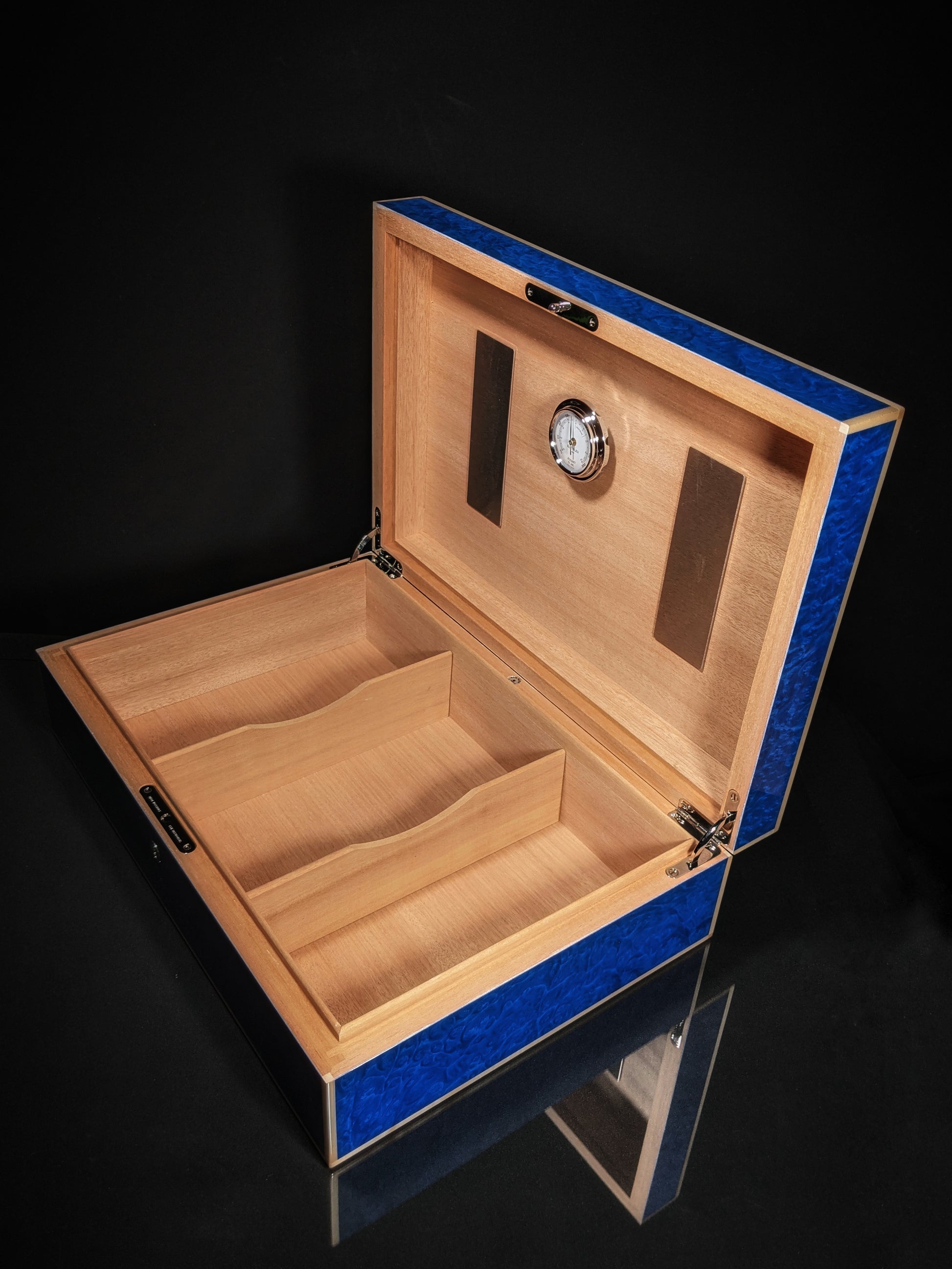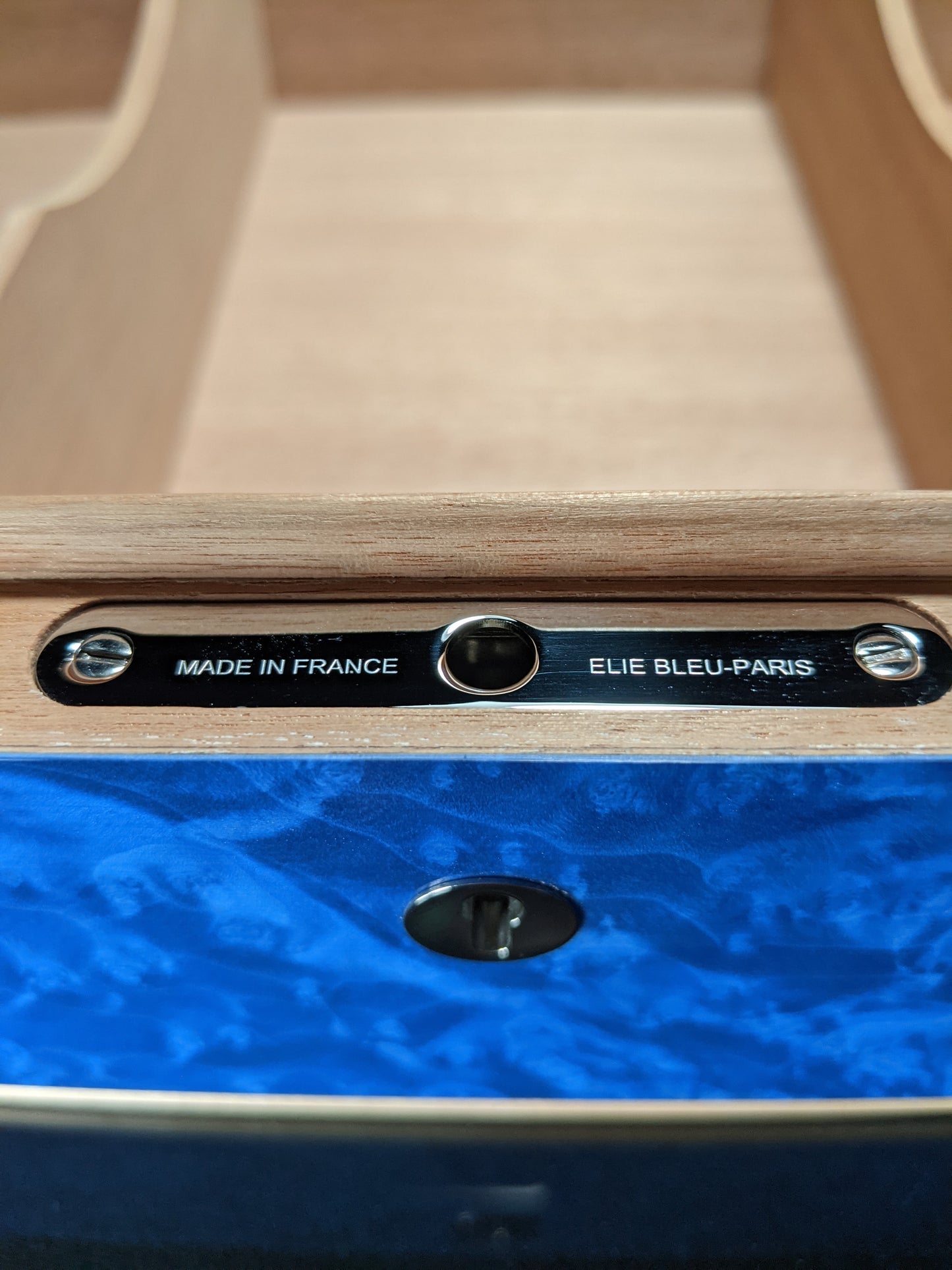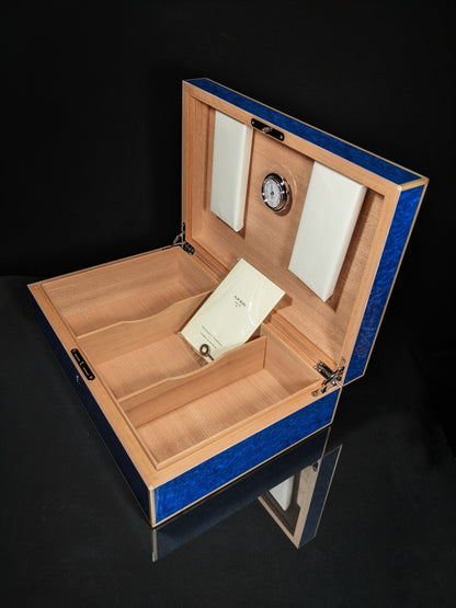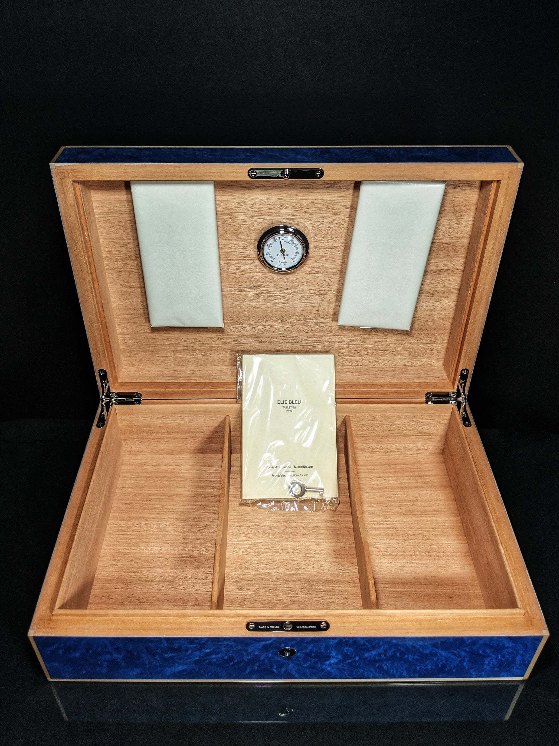 This is a new Elie Bleu Madrona Blue Sycamore Humidor 110 count. Made in France. Comes in the original presentation box complete with all contents. Measures 15.75" L x 10.63" W x 4.41 H " We ship worldwide fully insured with signature required upon delivery.