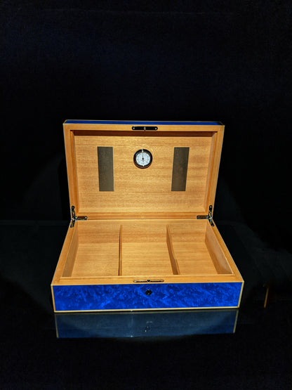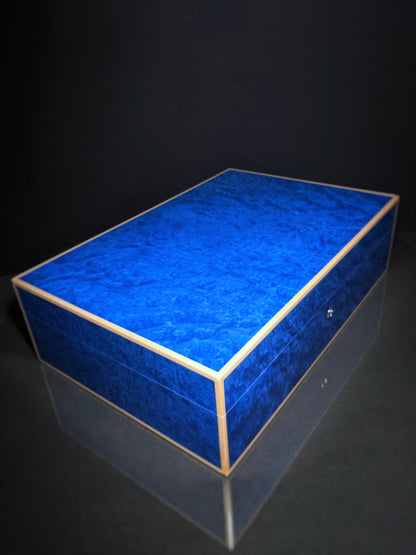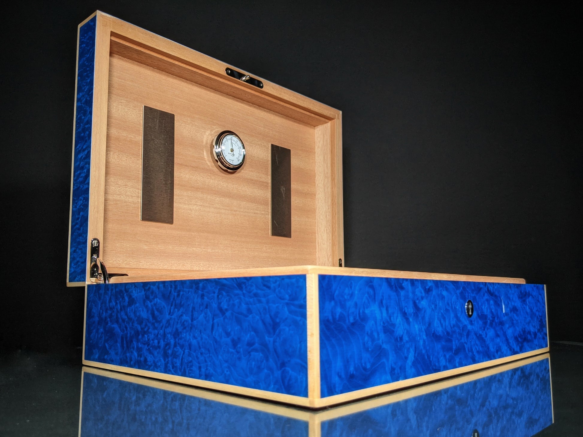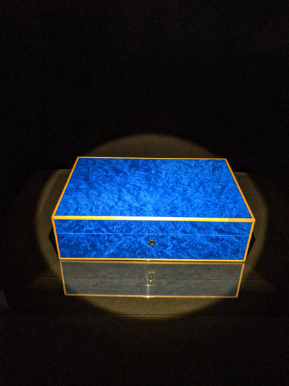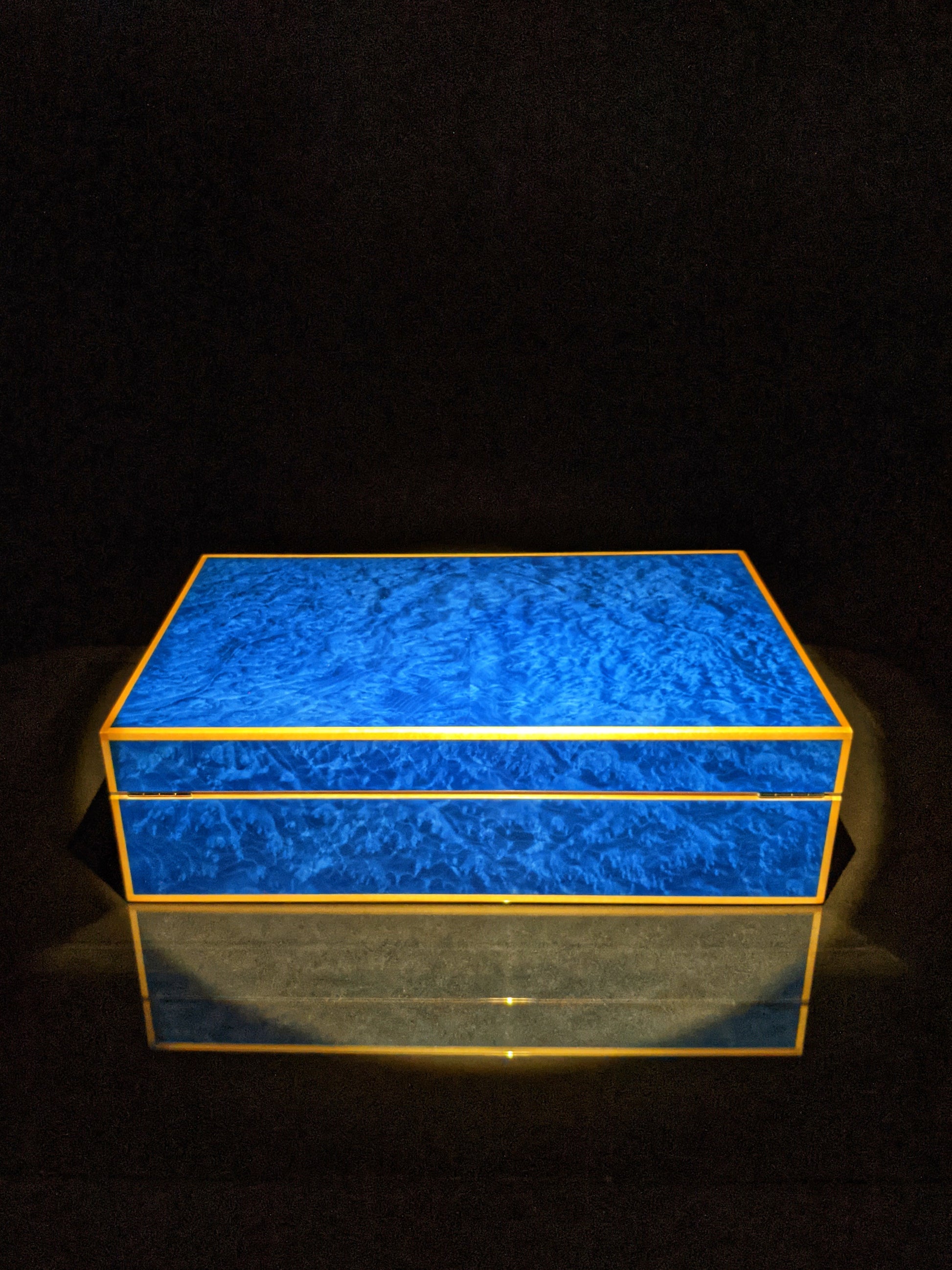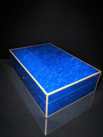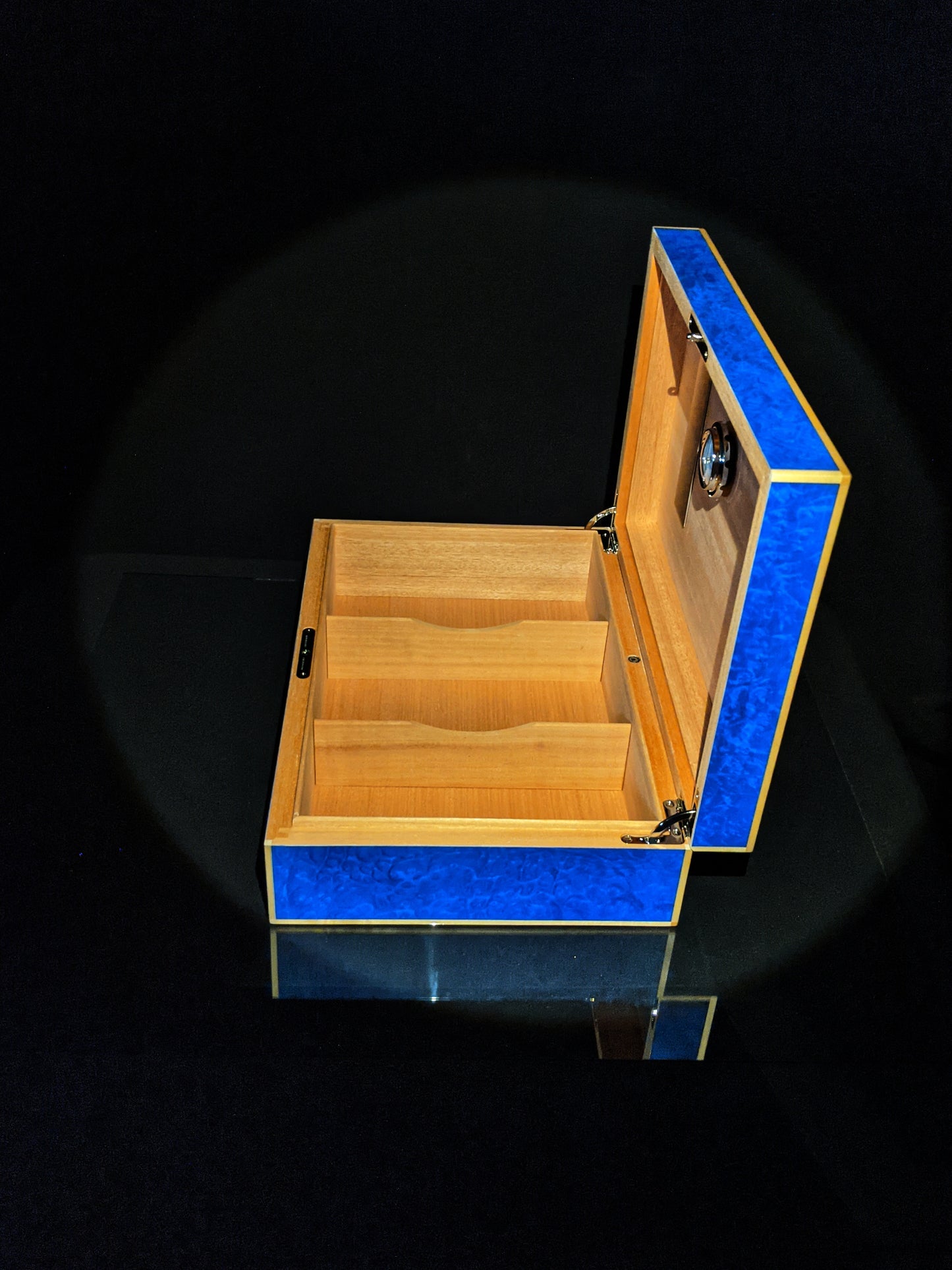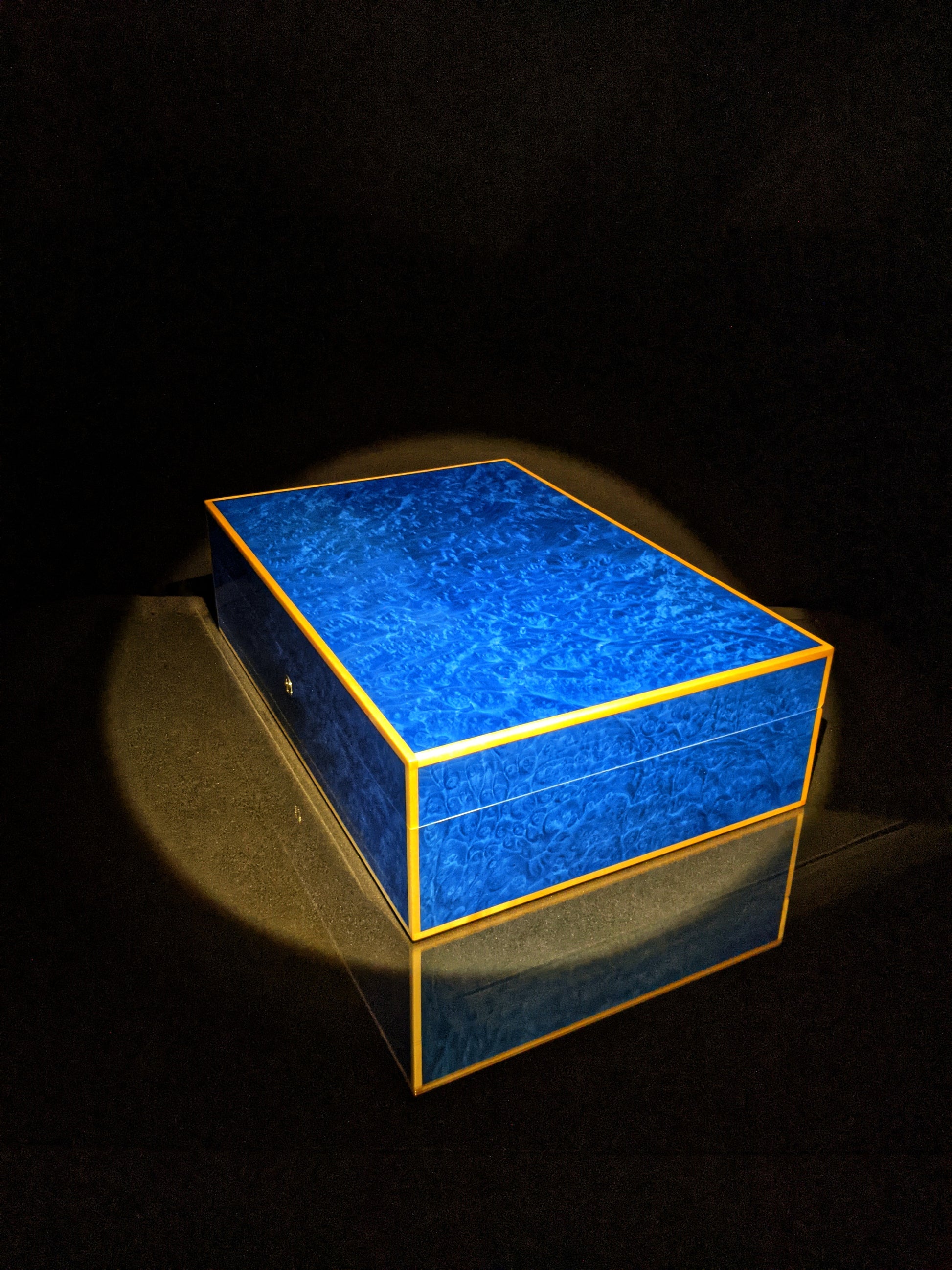This is a new Elie Bleu Madrona Blue Sycamore Humidor 110 count. Made in France. Comes in the original presentation box complete with all contents. Measures 15.75" L x 10.63" W x 4.41 H " We ship worldwide fully insured with signature required upon delivery.