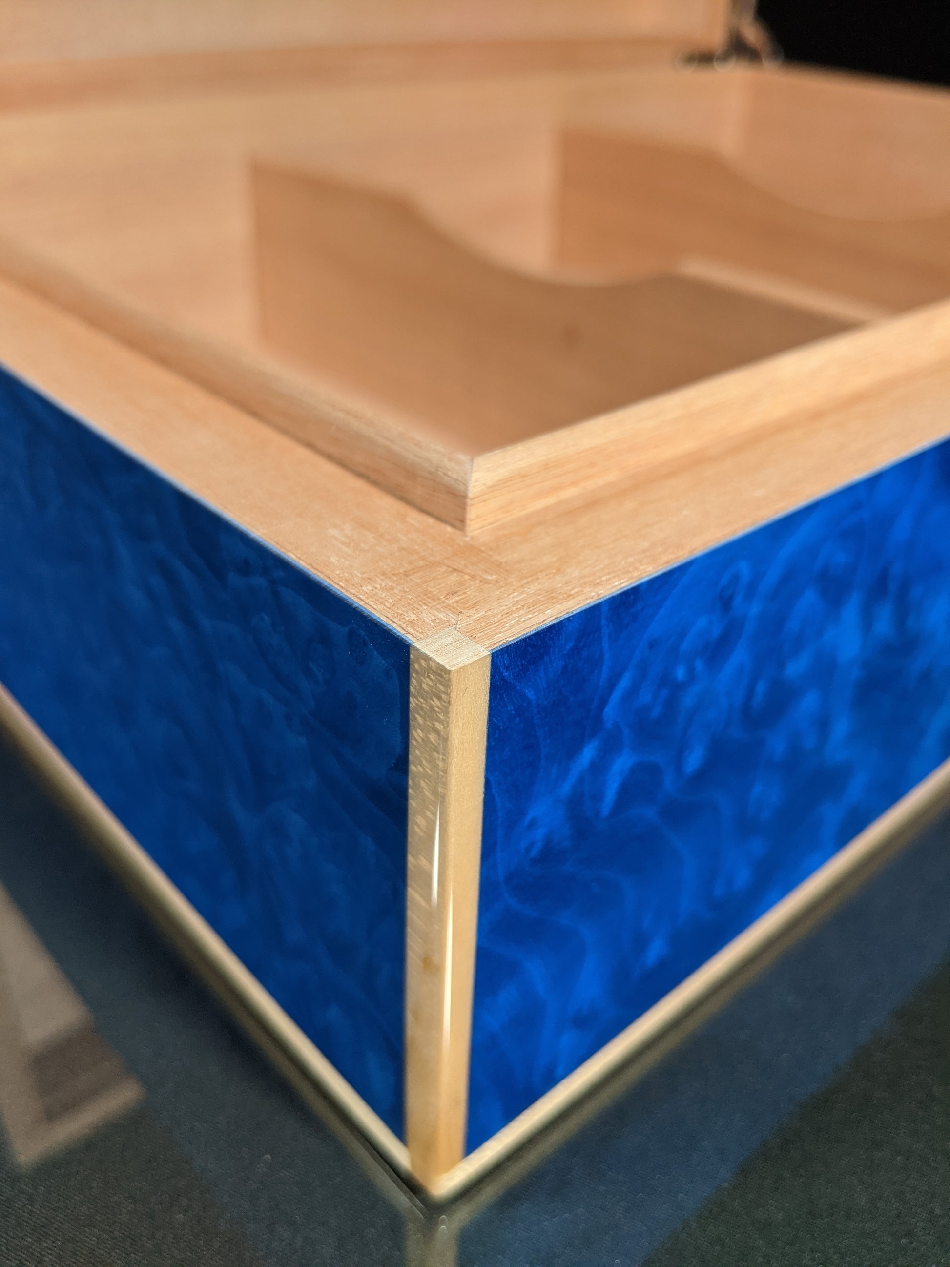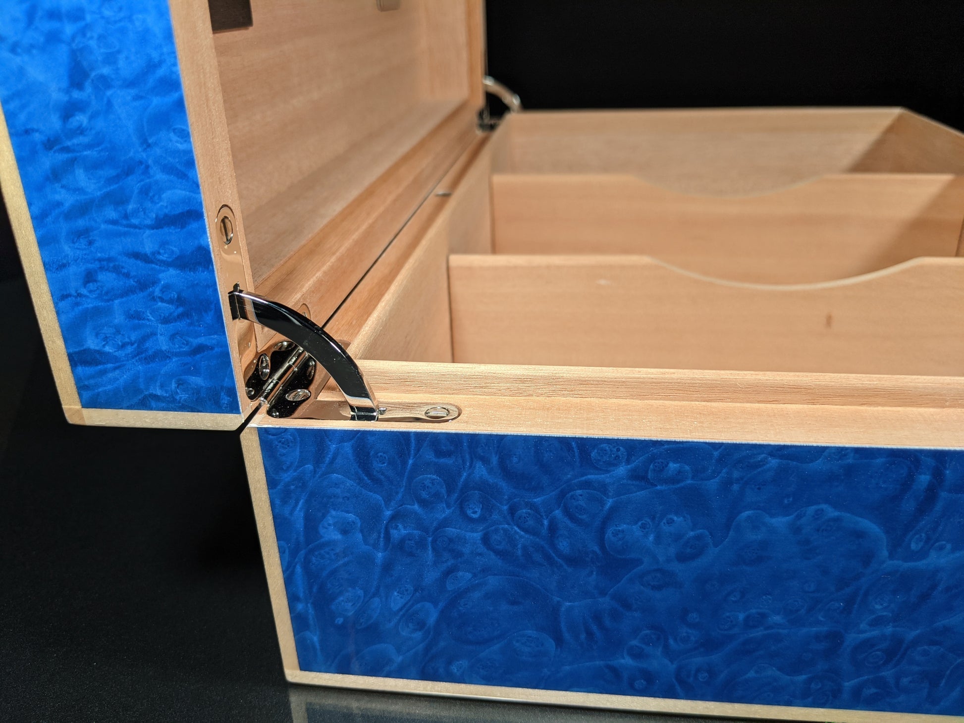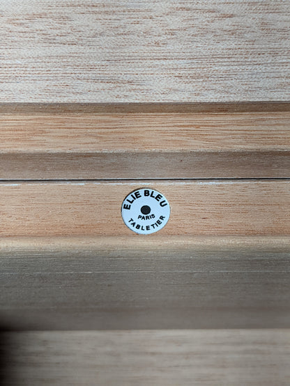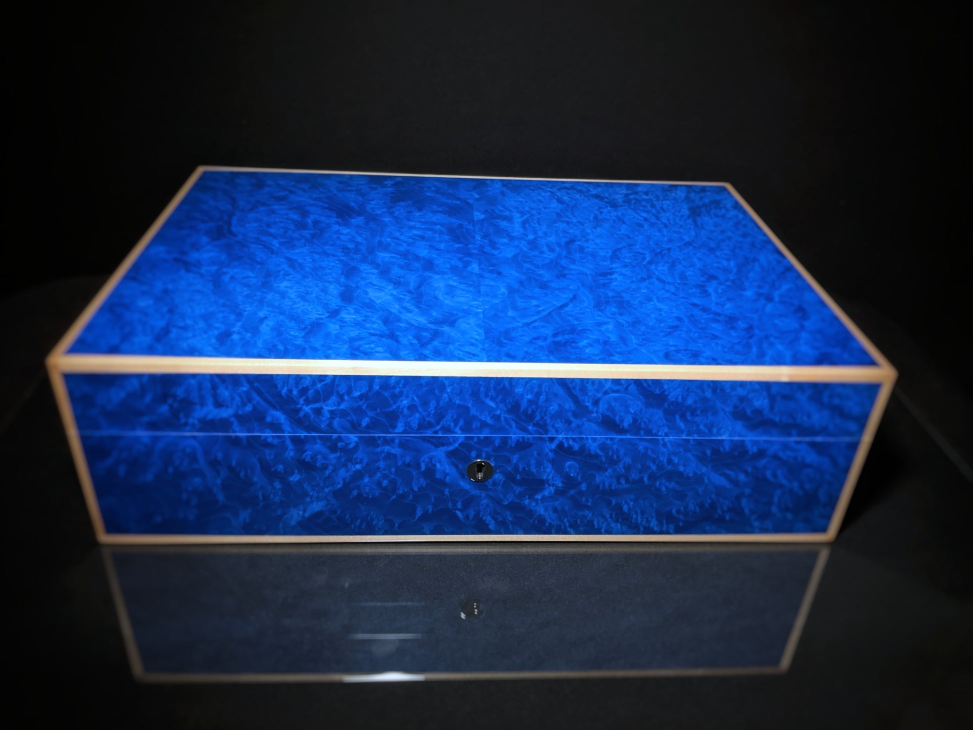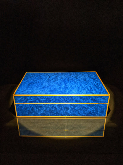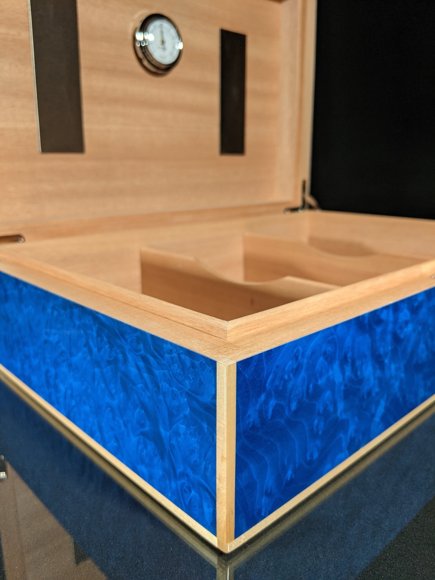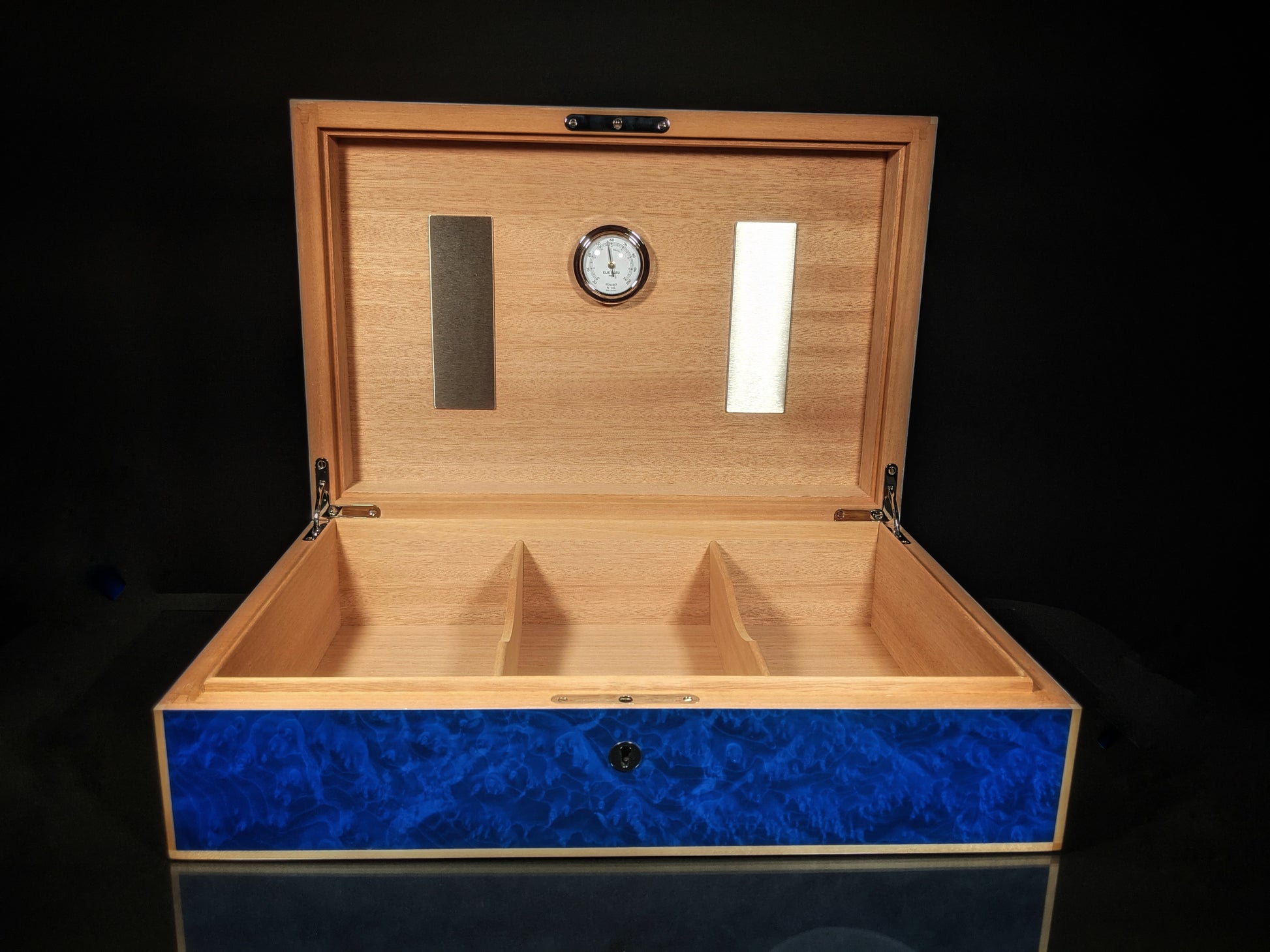 This is a new Elie Bleu Madrona Blue Sycamore Humidor 110 count. Made in France. Comes in the original presentation box complete with all contents. Measures 15.75" L x 10.63" W x 4.41 H " We ship worldwide fully insured with signature required upon delivery.