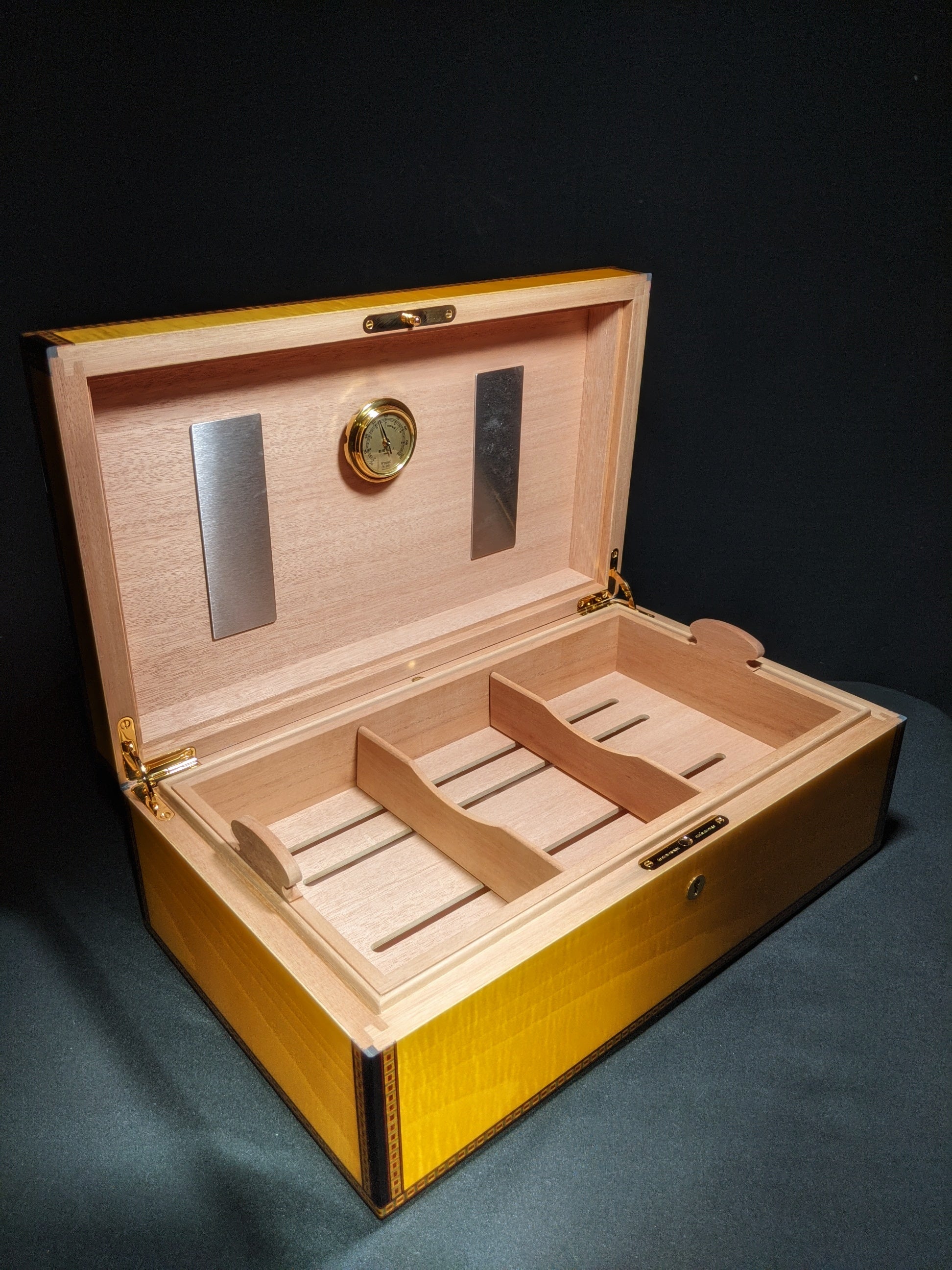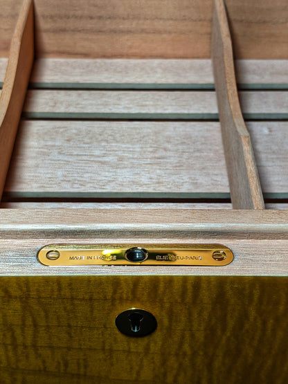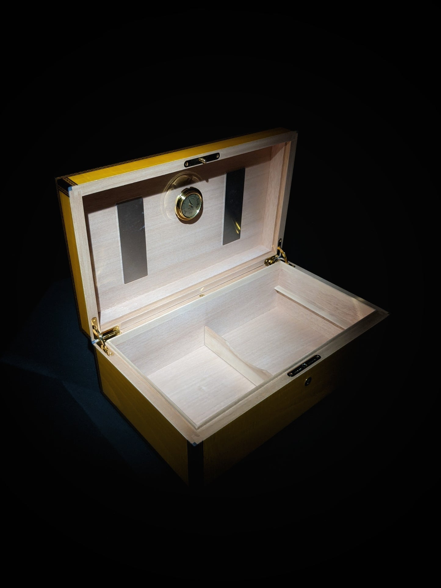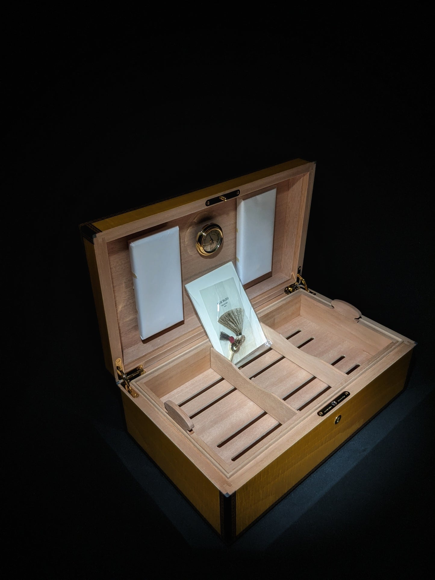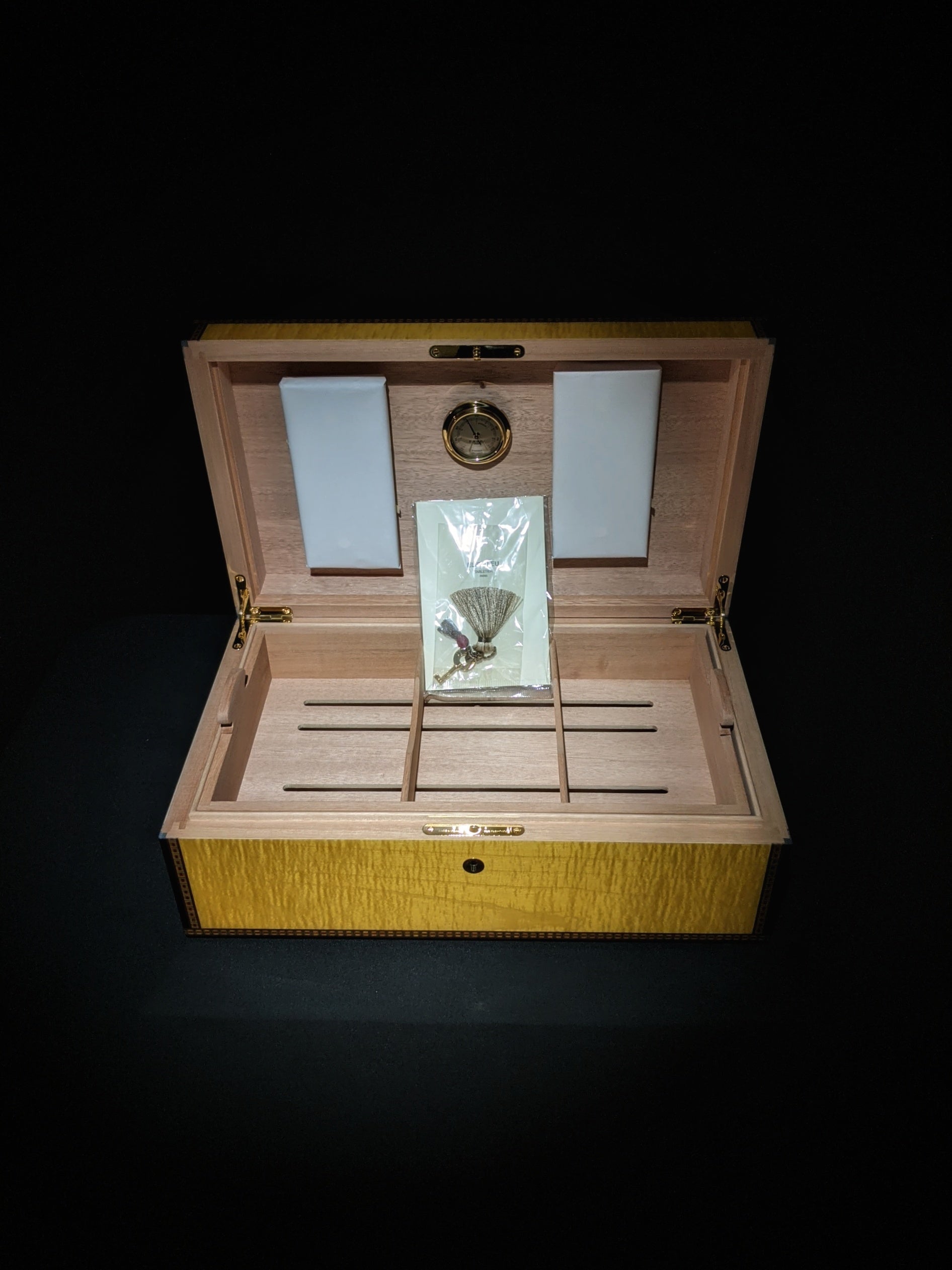 This is a new Elie Bleu Medals Yellow Sycamore Wood Humidor 120 count. Made in France. Comes in the factory presentation box complete with all contents. We ship fully insured with signature required.