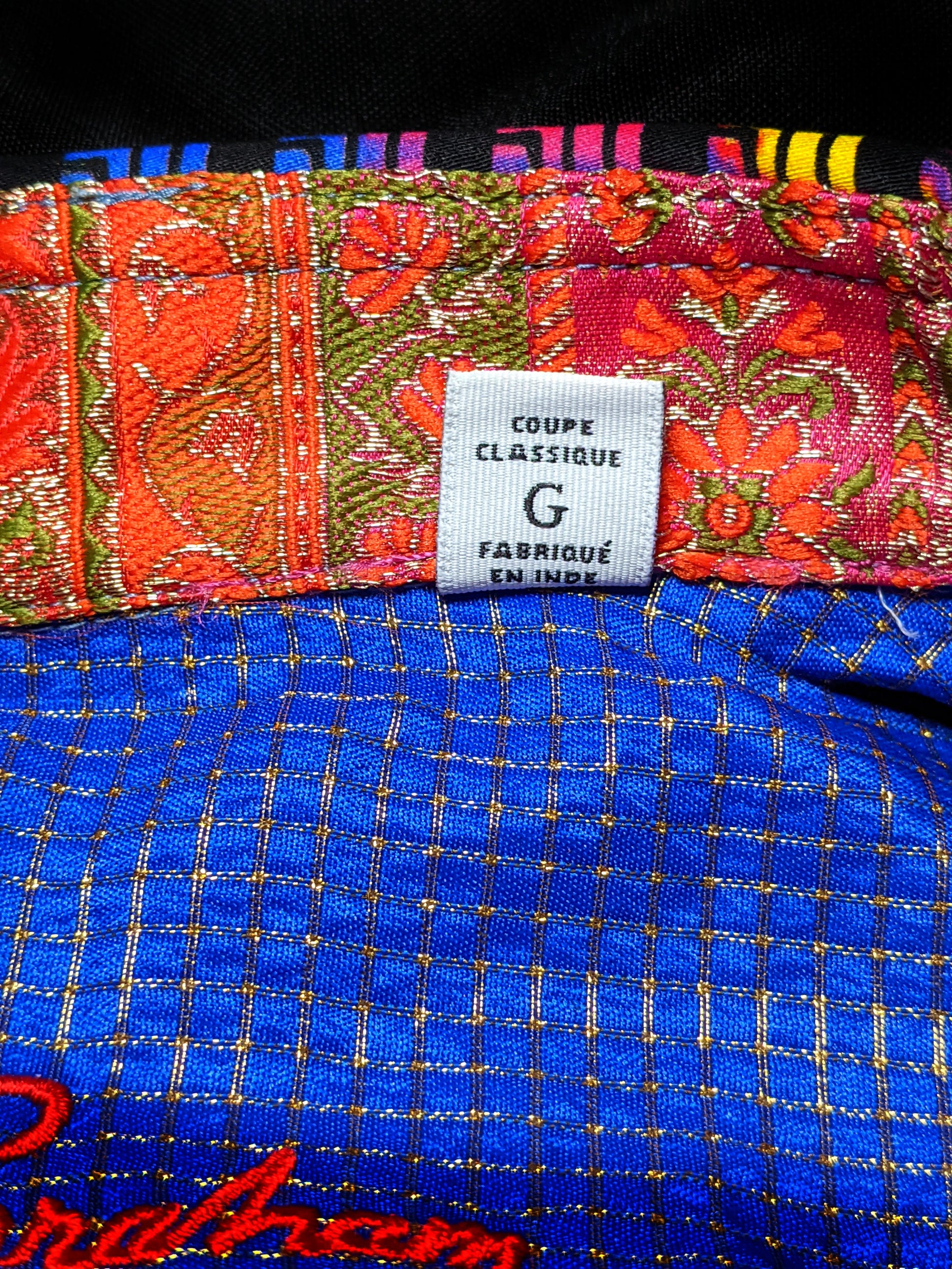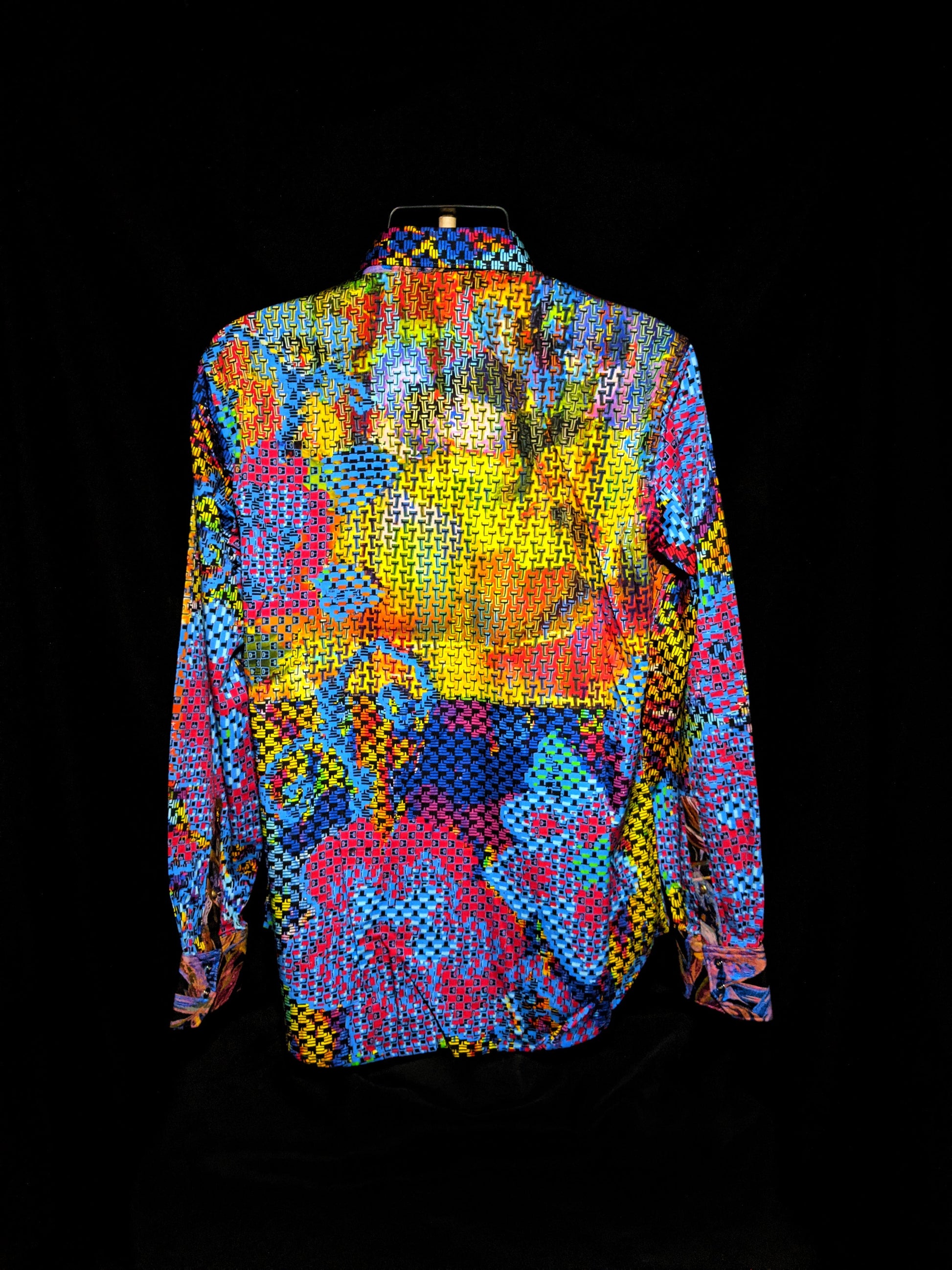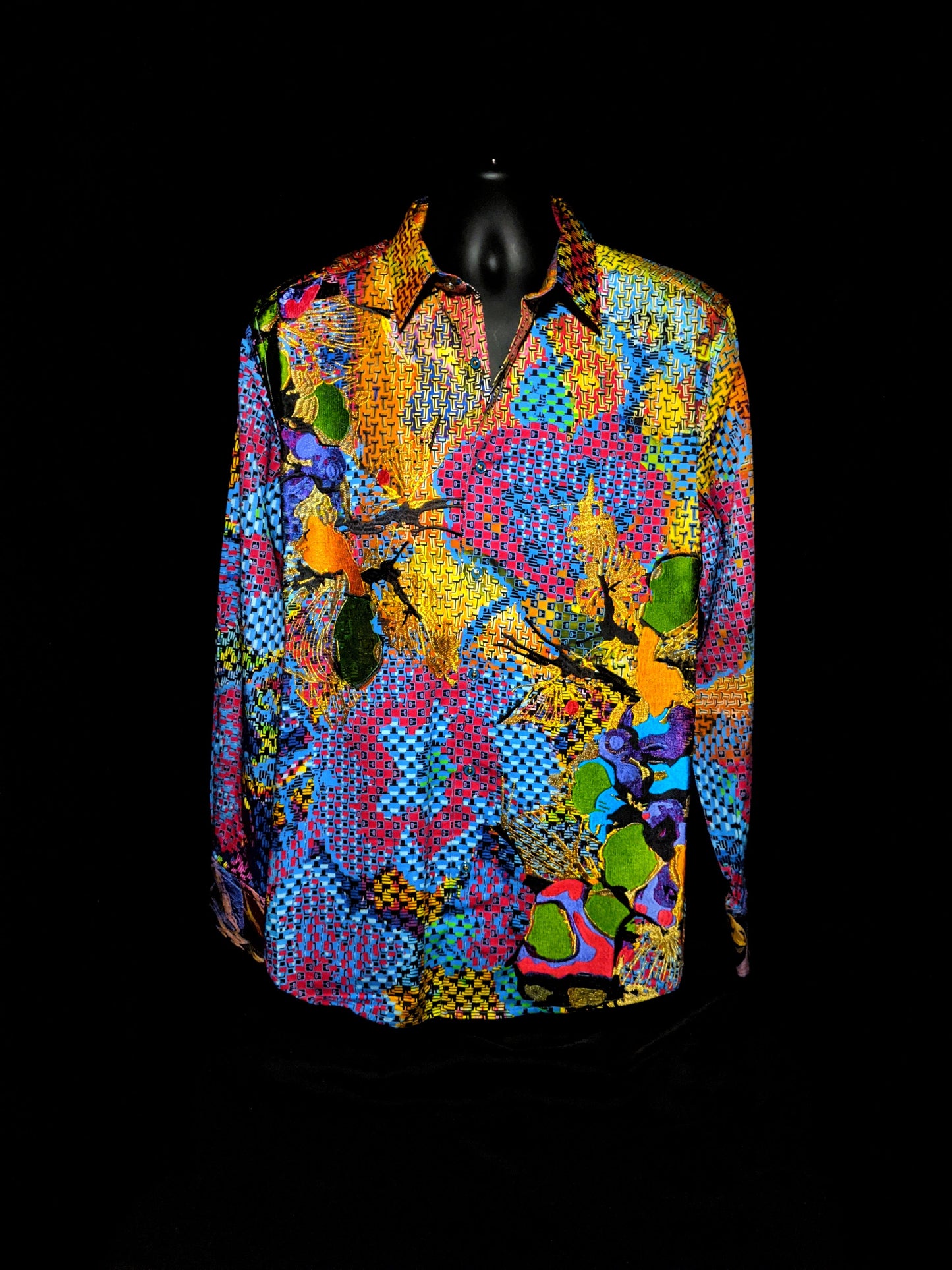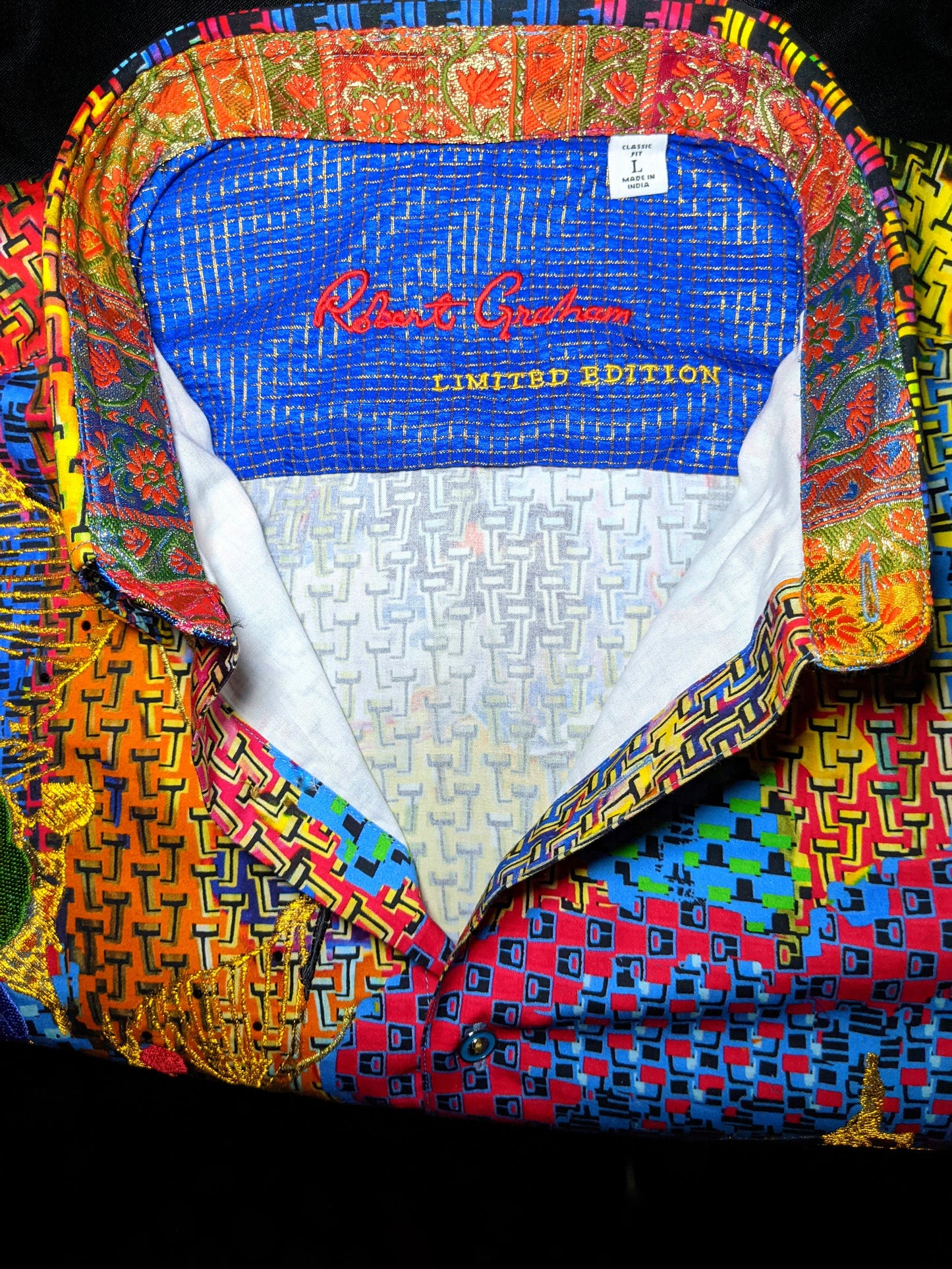 This is a pre-owned Robert Graham Hot Shot embroidered limited edition long sleeve large shirt. Made in India. This shirt is in excellent condition and has always been dry cleaned and worn a few times. Comes freshly dry cleaned. Signature required upon delivery with signature required upon delivery.