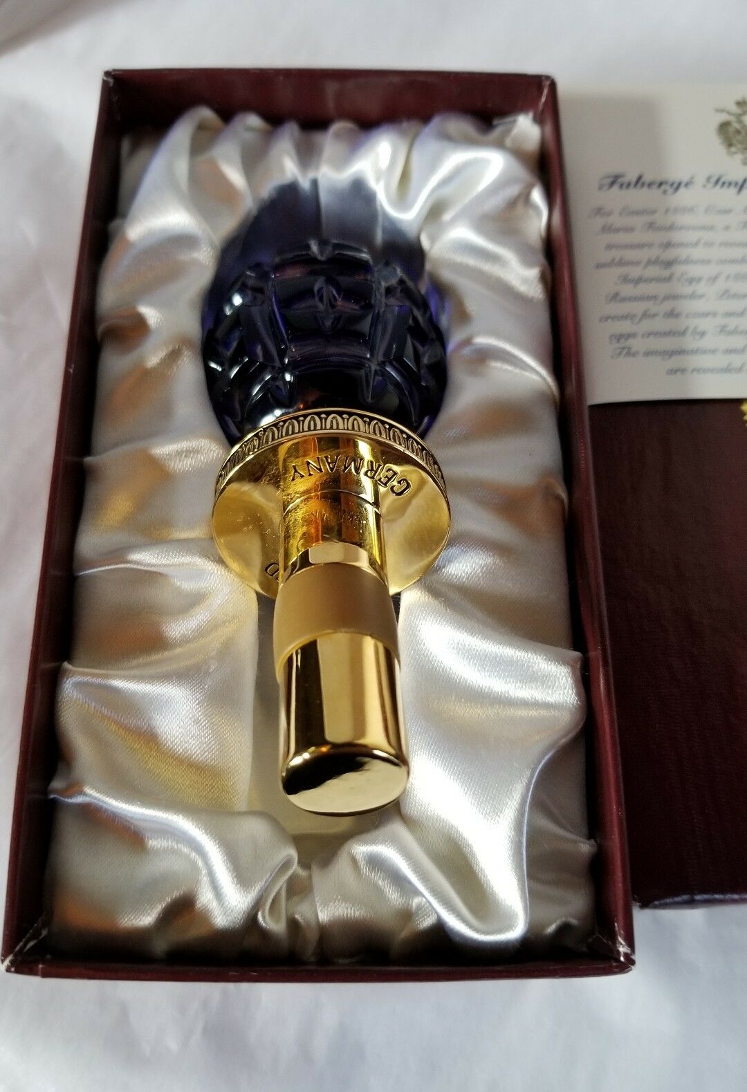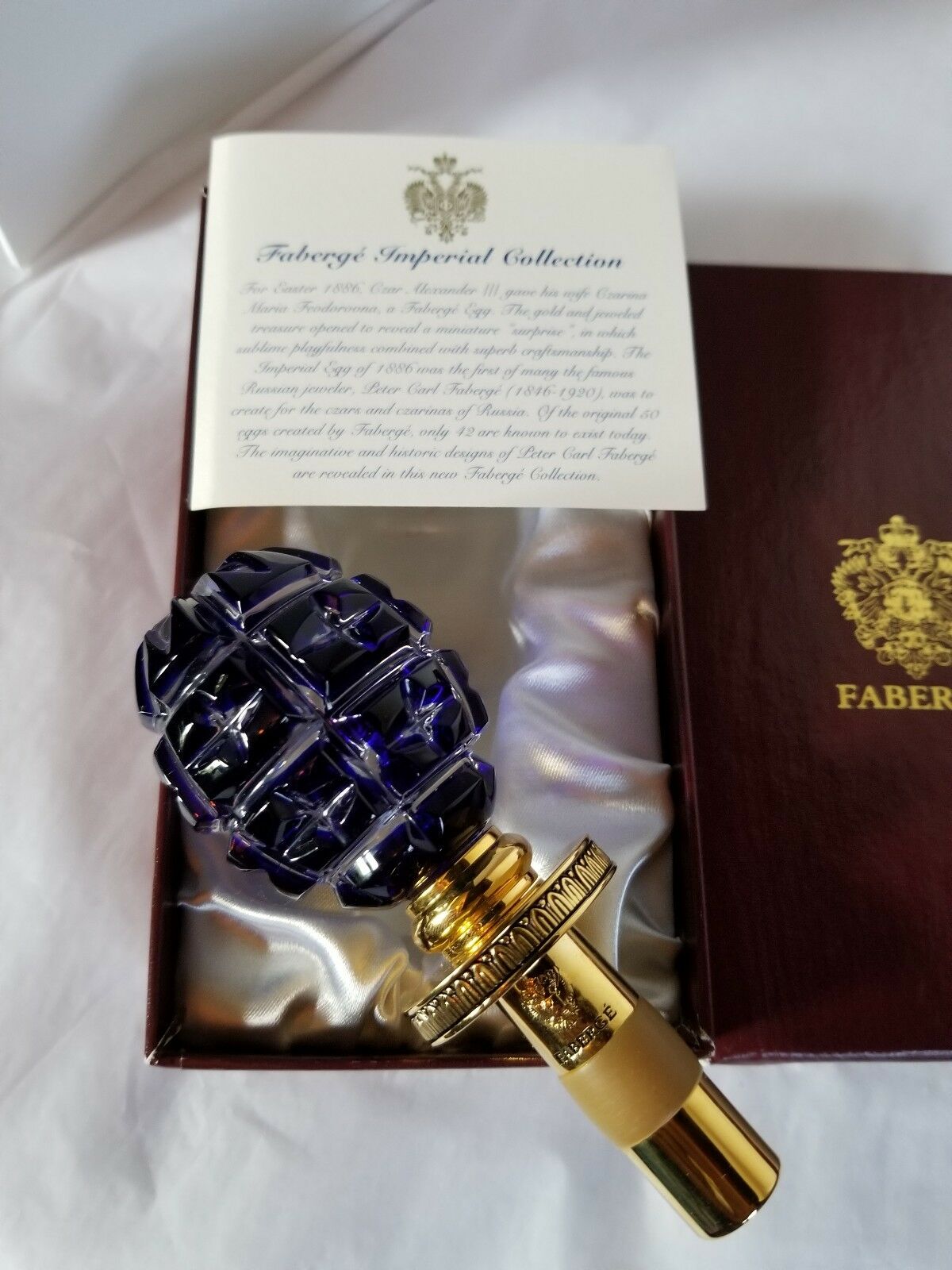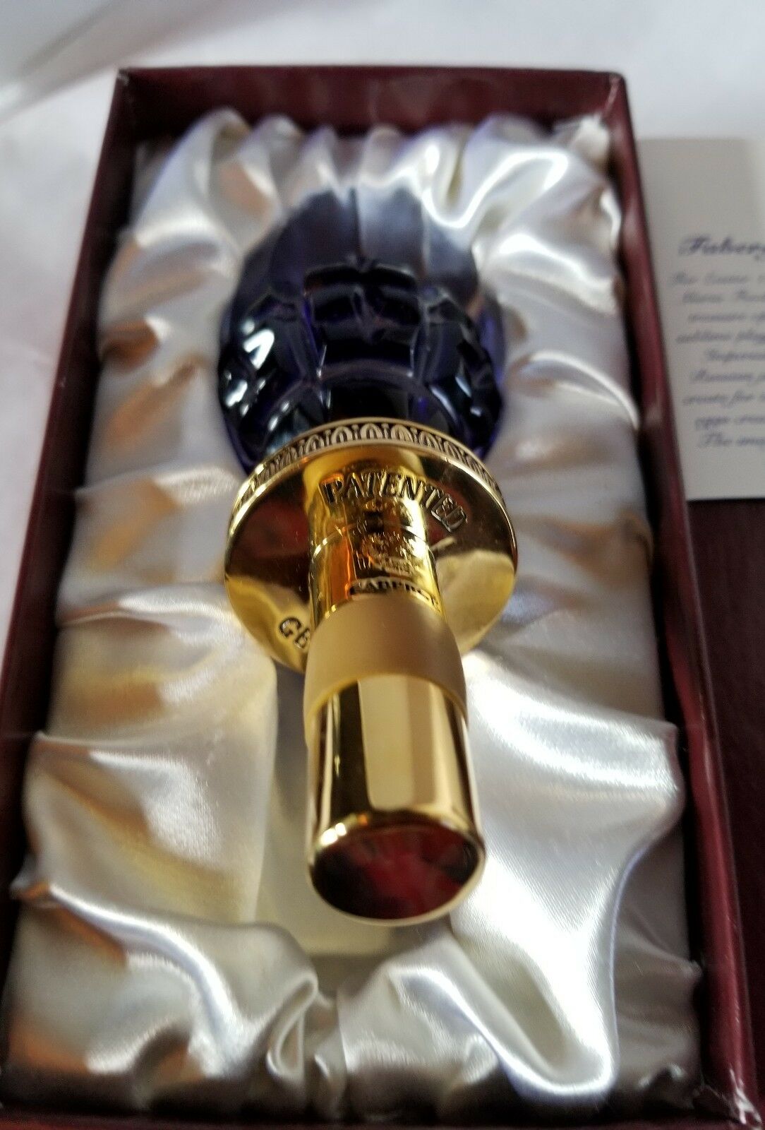 This is a pristine Faberge Blue Crystal  Bottle Stopper new in the original box with booklets.  Made in Germany. These stoppers are mounted on a patented expandable and adjustable bottle stopper that fits any size wine bottle and creates a airtight seal. We Ship Worldwide fully insured. Signature is required upon delivery.  Thank you!