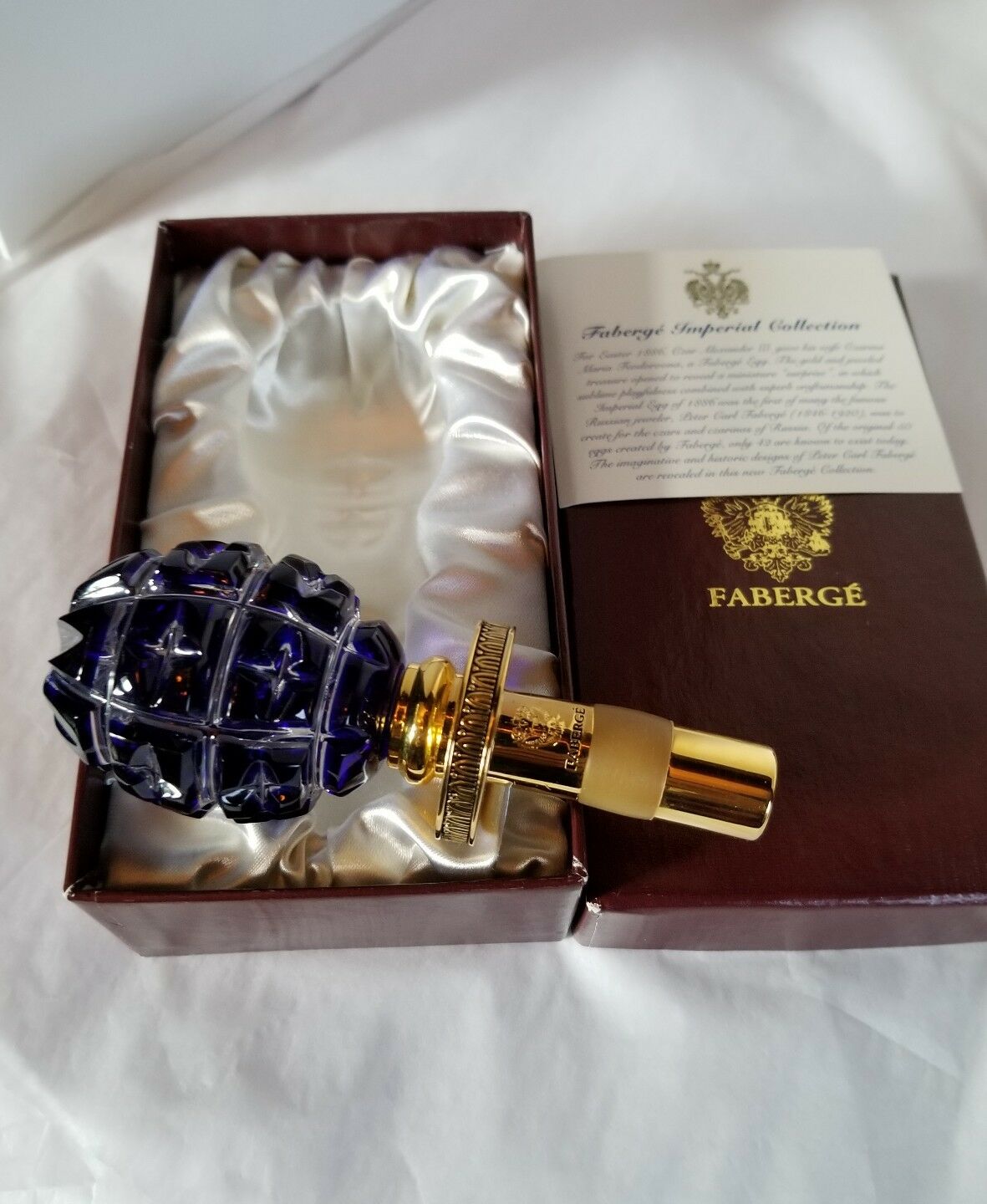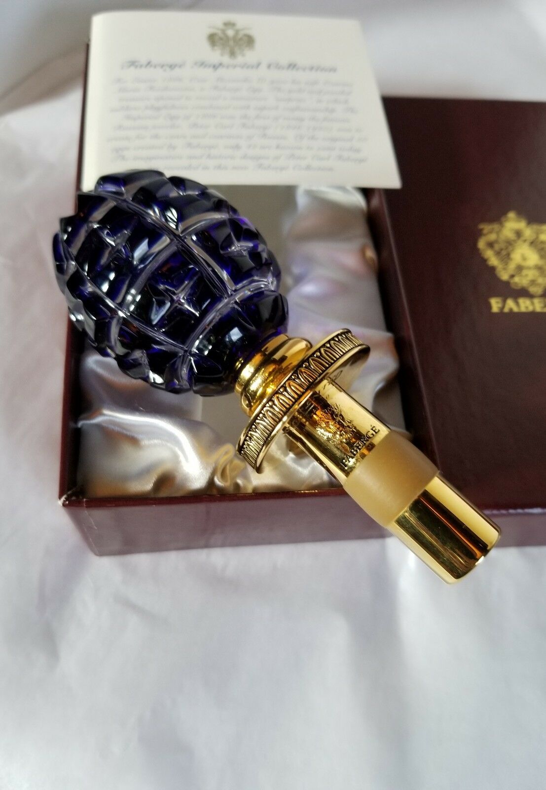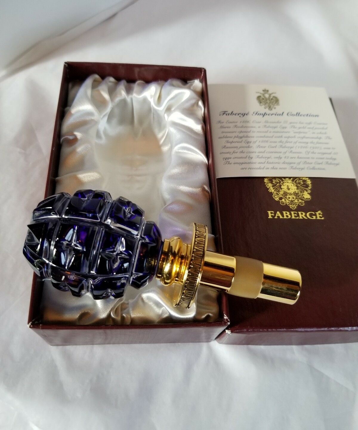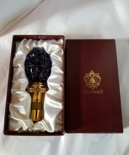This is a pristine Faberge Blue Crystal  Bottle Stopper new in the original box with booklets.  Made in Germany. These stoppers are mounted on a patented expandable and adjustable bottle stopper that fits any size wine bottle and creates a airtight seal. We Ship Worldwide fully insured. Signature is required upon delivery.  Thank you!