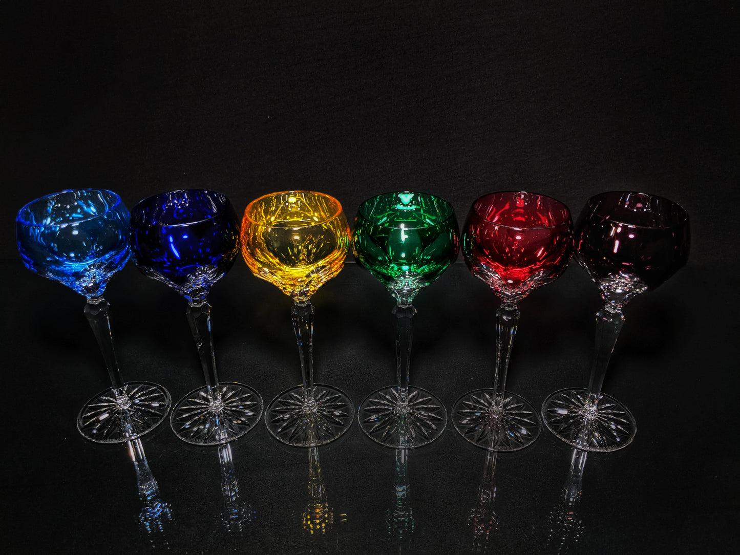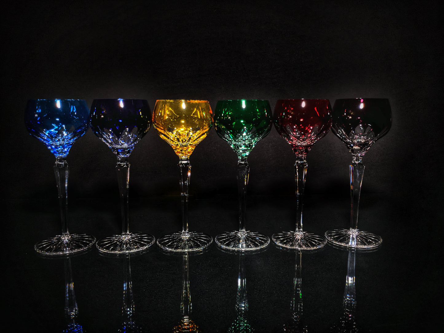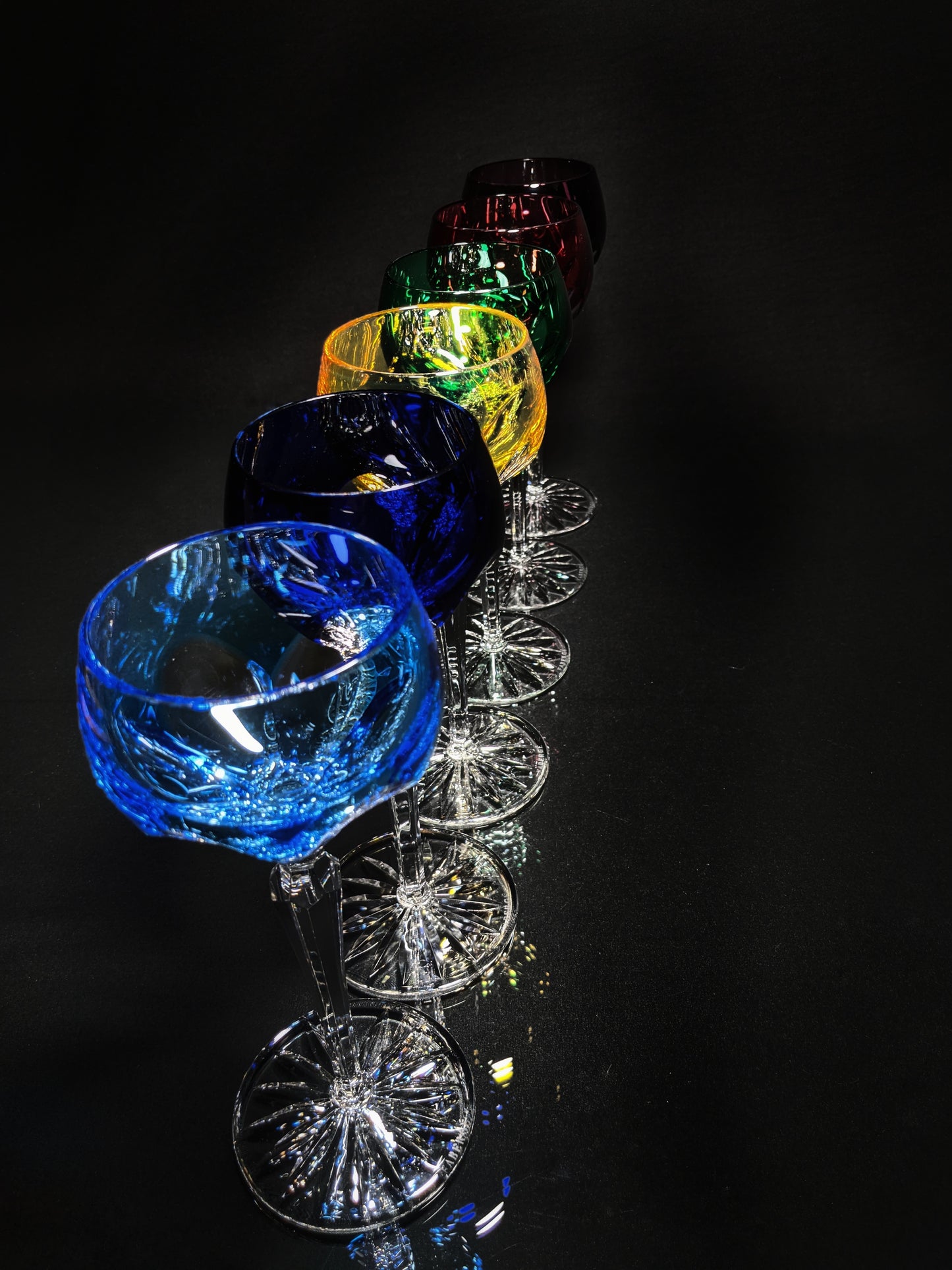 Faberge Colored Crystal Lausanne Hock Glasses. 8 1/2" H x 3 1/4" W