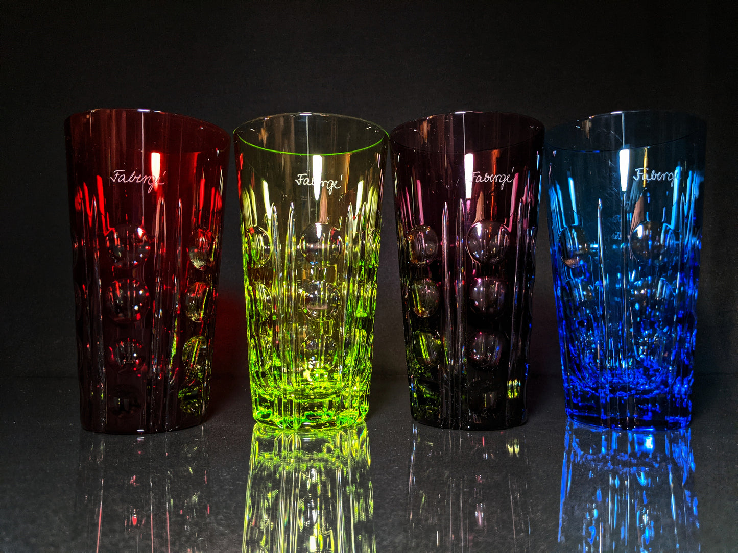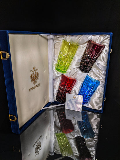 This is a set 4 Faberge Tall Crystal Colored Bubble Glasses. Preowned in excellent condition. Appear to never been used. Made in Slovenia. These come in the Faberge presentation case with certificate. We ship Worldwide fully insured. Signature is required upon delivery.