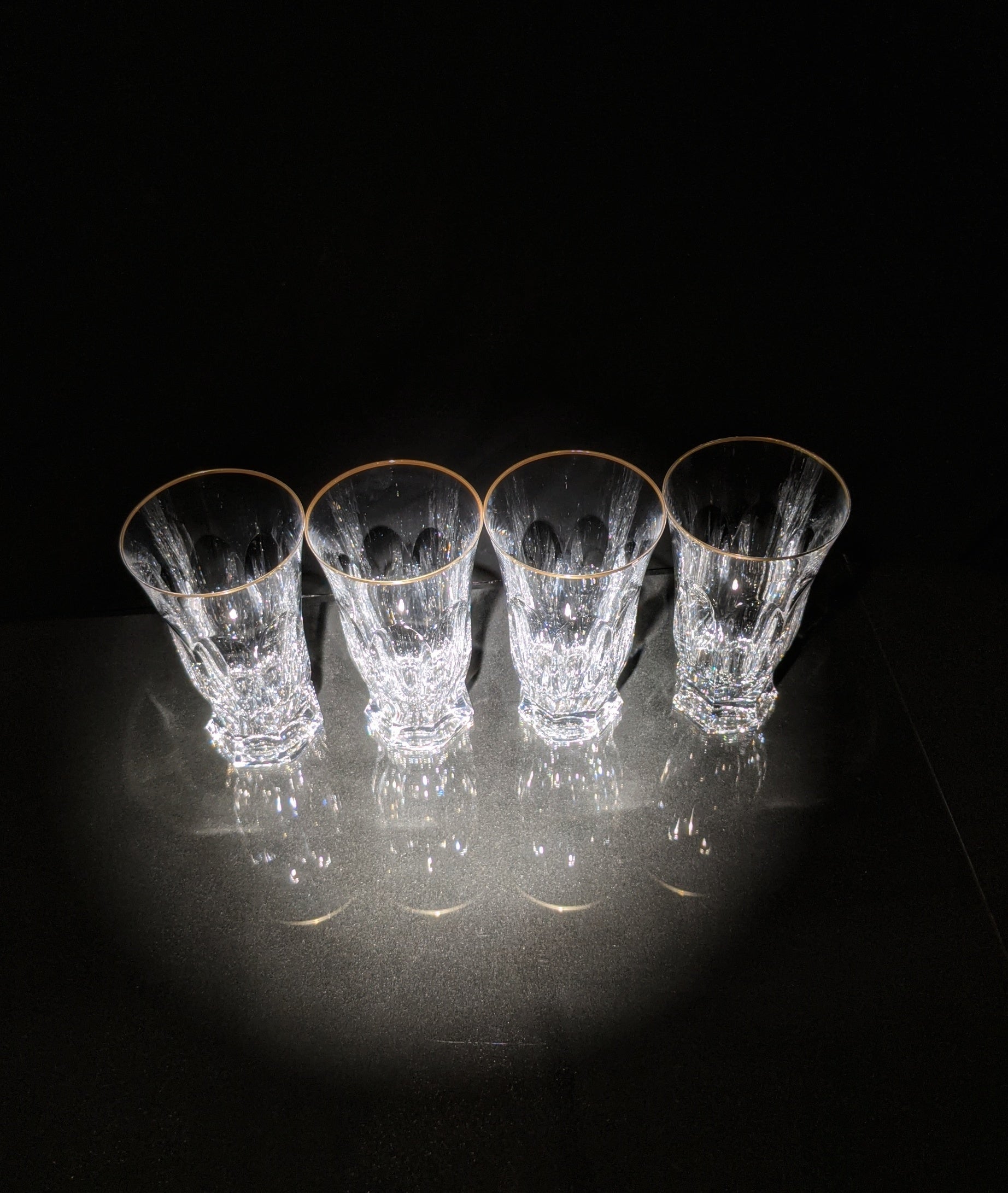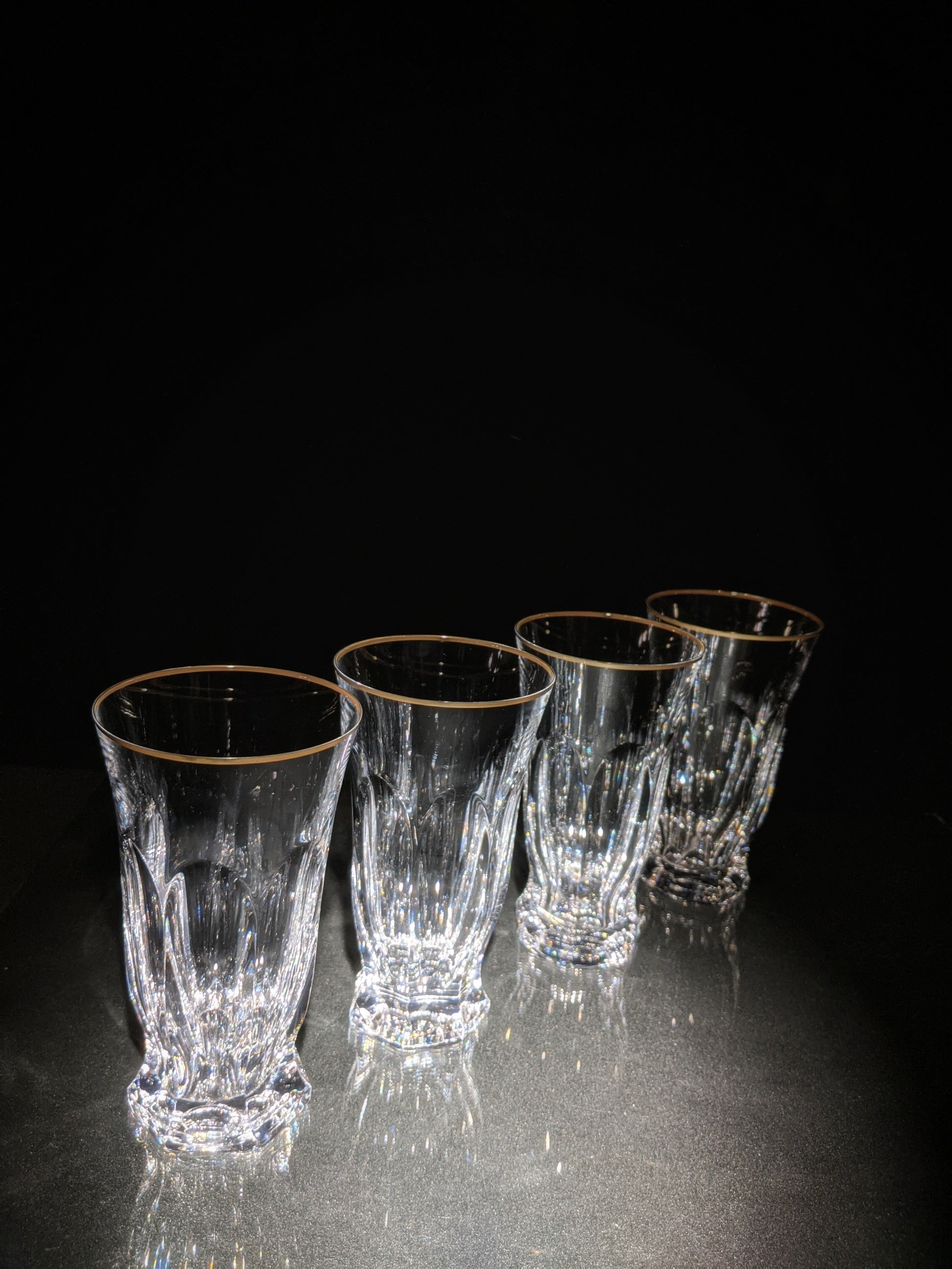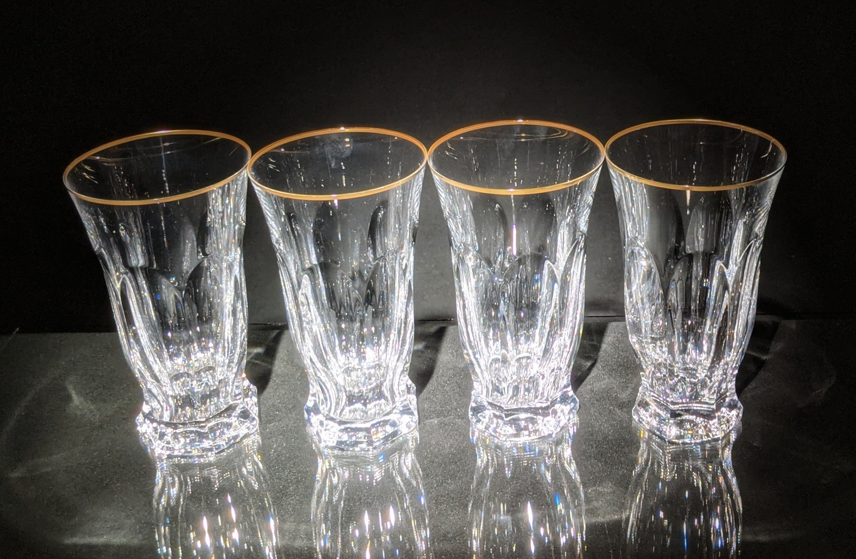 This is a new set of 4 Faberge Clear Crystal glasses with Gold rims. Made in Slovenia. These come in the original faberge presentation box. We ship worldwide fully insured. Signature is required upon delivery.