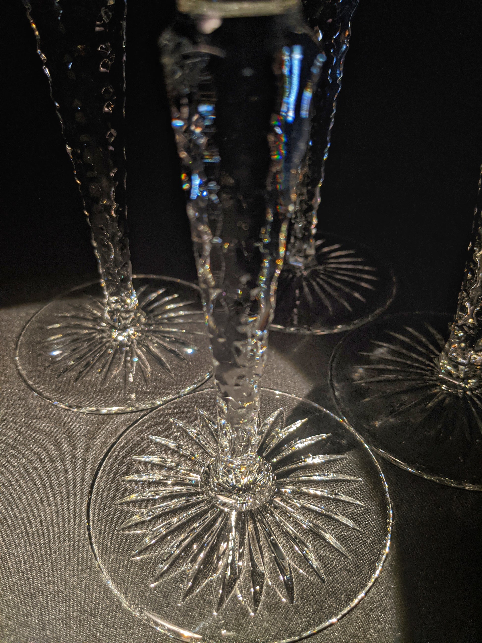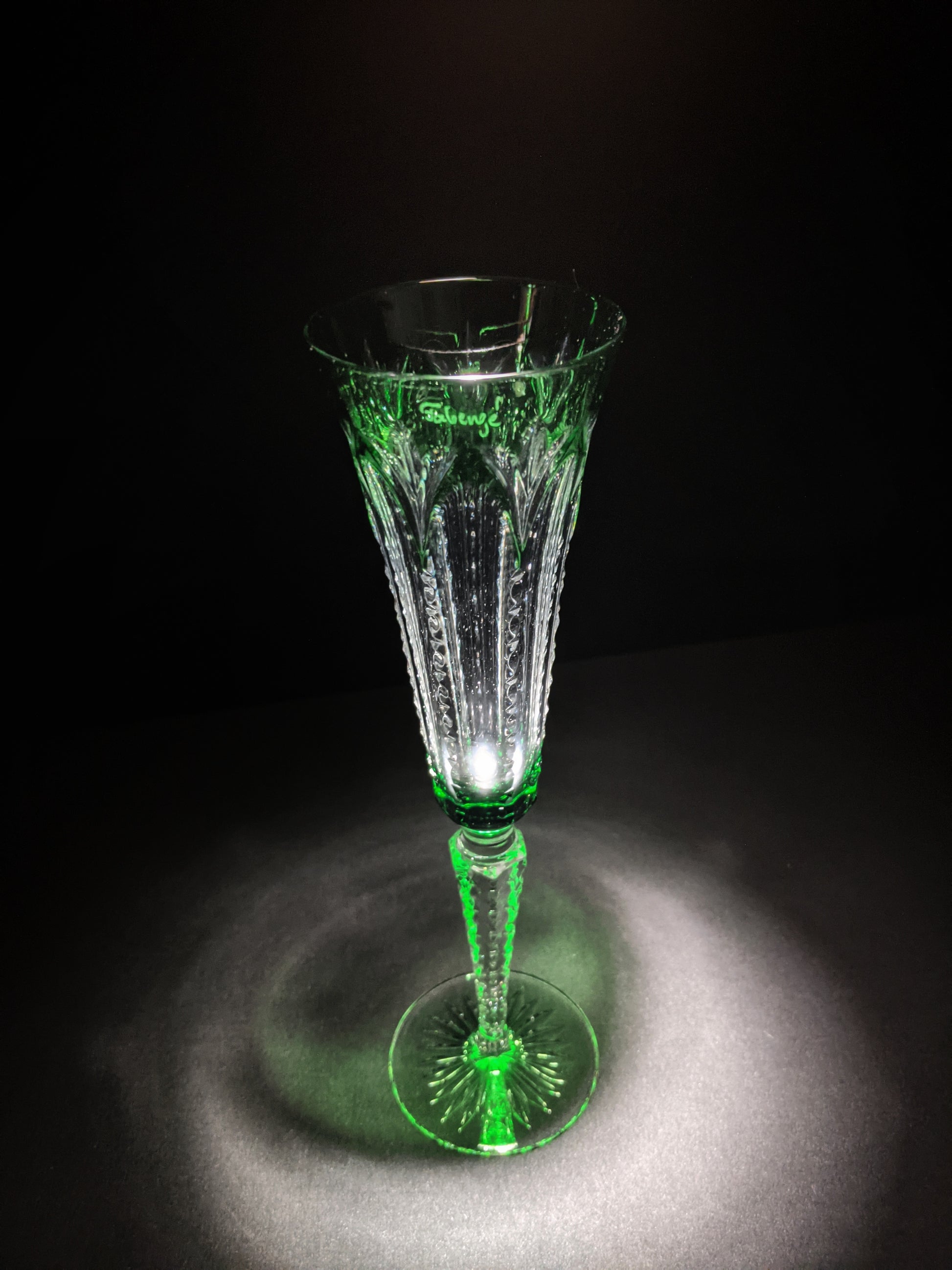 This is a set of 4 Faberge Grand Palais Crystal Colored Flutes in the original box. Made in Slovenia. We ship Worldwide fully insured. Signature is required upon delivery.