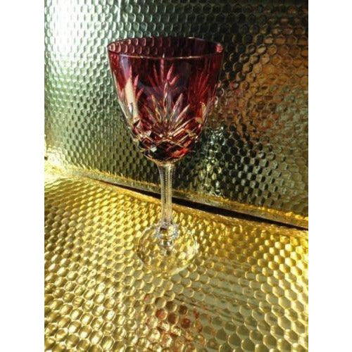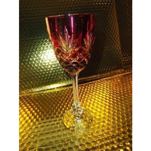 This is a Faberge Cranberry Odessa Hock Glass . New without box. Stand 8.25" Tall and with 3 " diameter at rim . This has the plain base without cuts. Has the Faberge name etched on base. Wrapped in bubble wrap to keep safe. We ship Worldwide fully insured. Thank you!