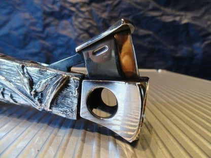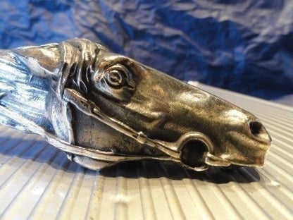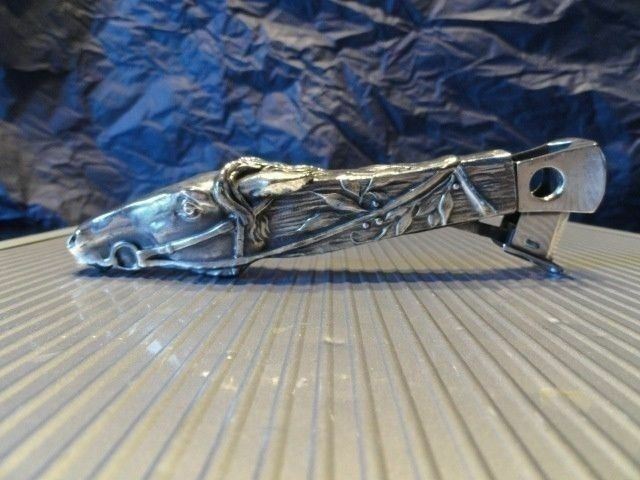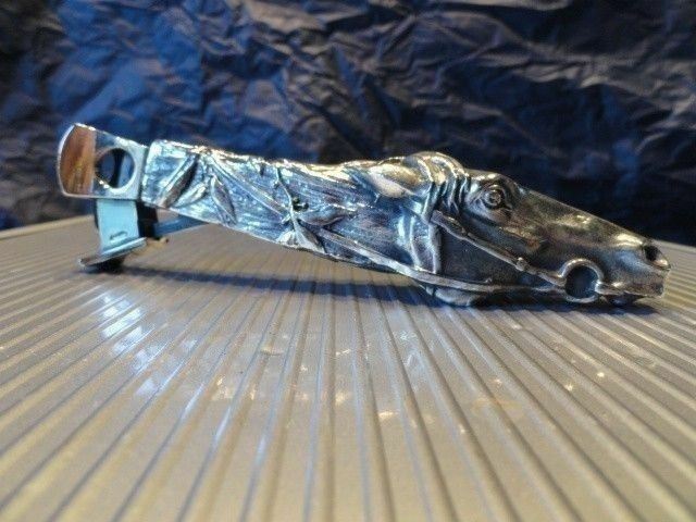 This is a rare pre-owned Cigar cutter with Horse Head design. Mint condition. Measures approx : 5.75" Long by 1.50" Wide. Appears to be Nickel Plated. Small size cutter for corona cigars. We Ship Worldwide fully insured. Signature is required upon delivery. Thank you!