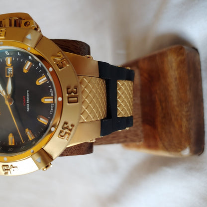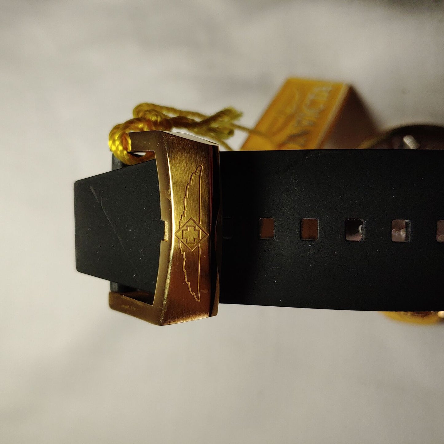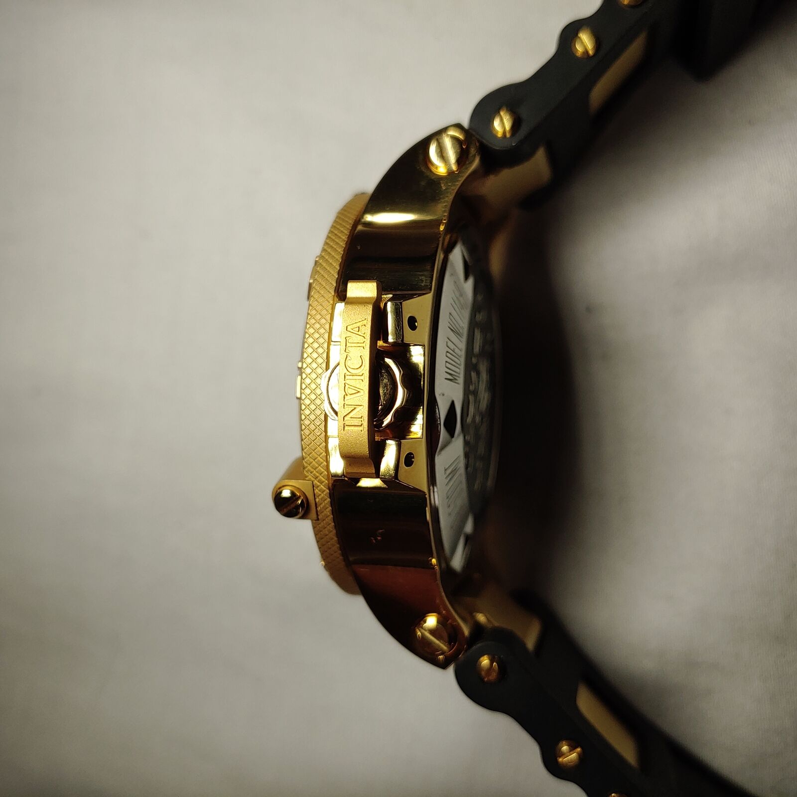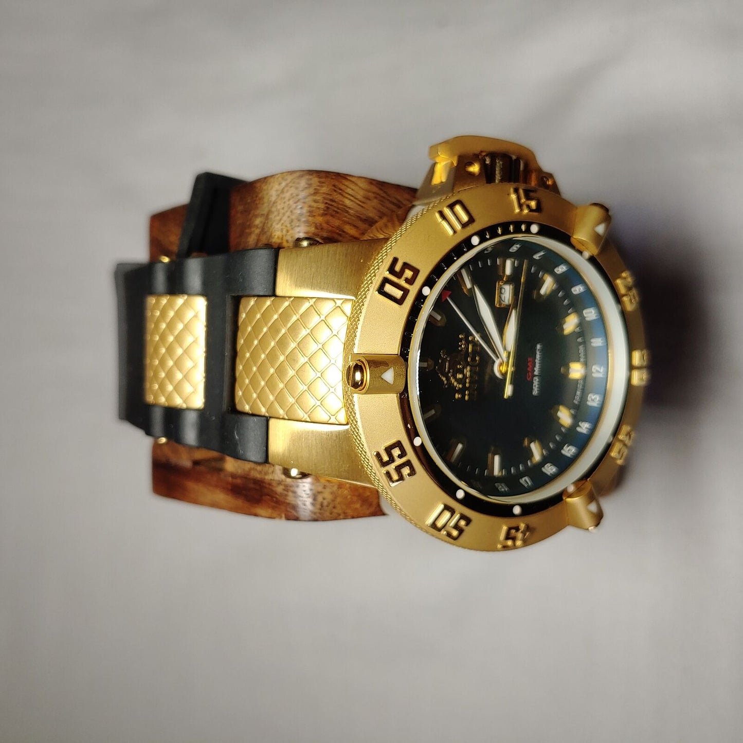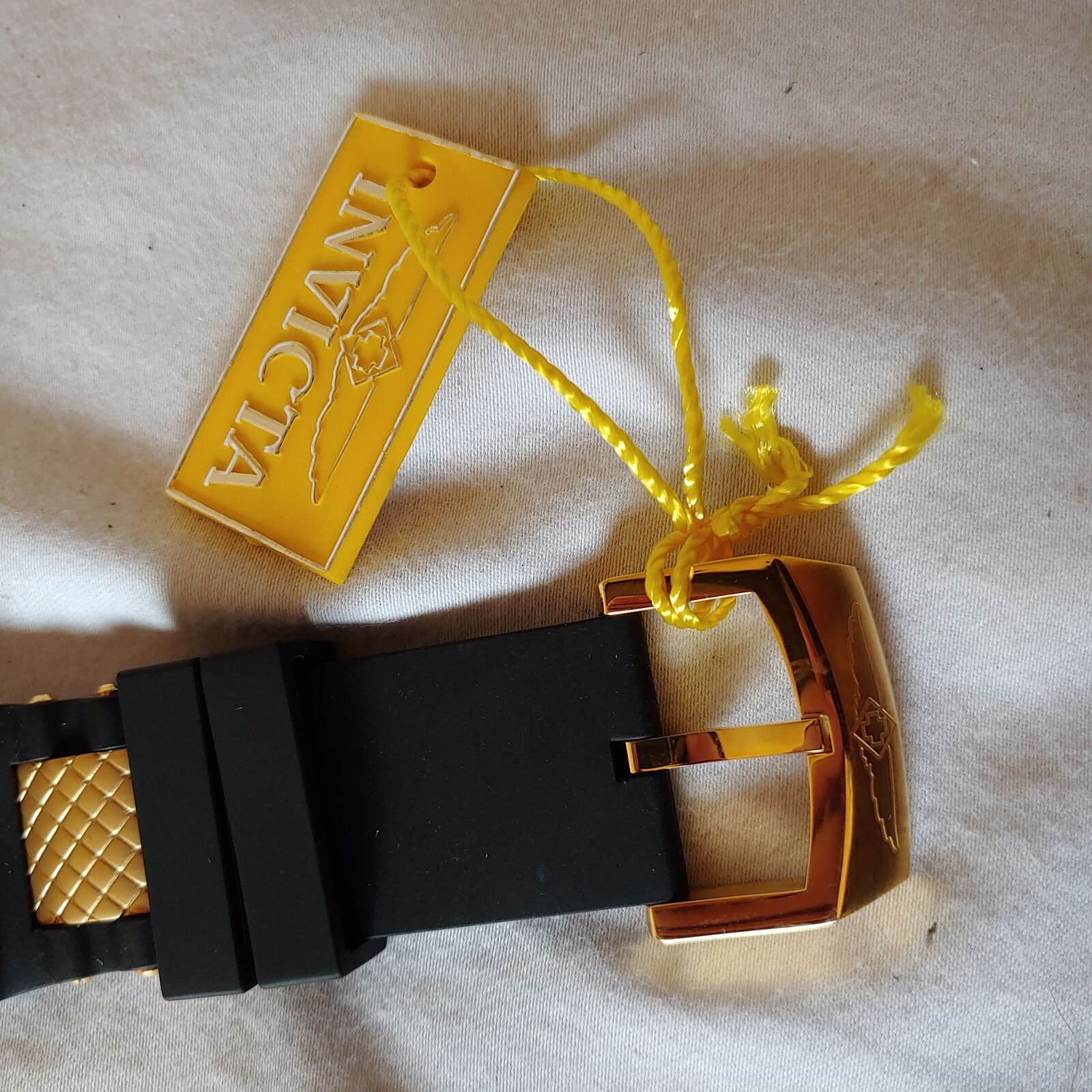 From the renowned Subaqua collection by Invicta, this stylish timepiece is powered by a finely crafted Swiss Quartz movement. Featuring a stunning 50 millimeter Gold case accented by a Gold, Black tone Stainless Steel, Polyurethane band, it is the perfect accessory for function and style. Protected by a Flame Fusion crystal and water resistant up to 500 meters, Invicta model number 1149 also comes with a five year warranty from InvictaStores.com, the official online source for Invicta watches.