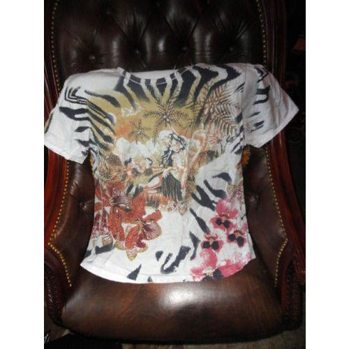 This is a Just Cavalli Designer T-Shirt in multicolored pattern. Good condition. Selling as is . We Ship Worldwide fully insured.