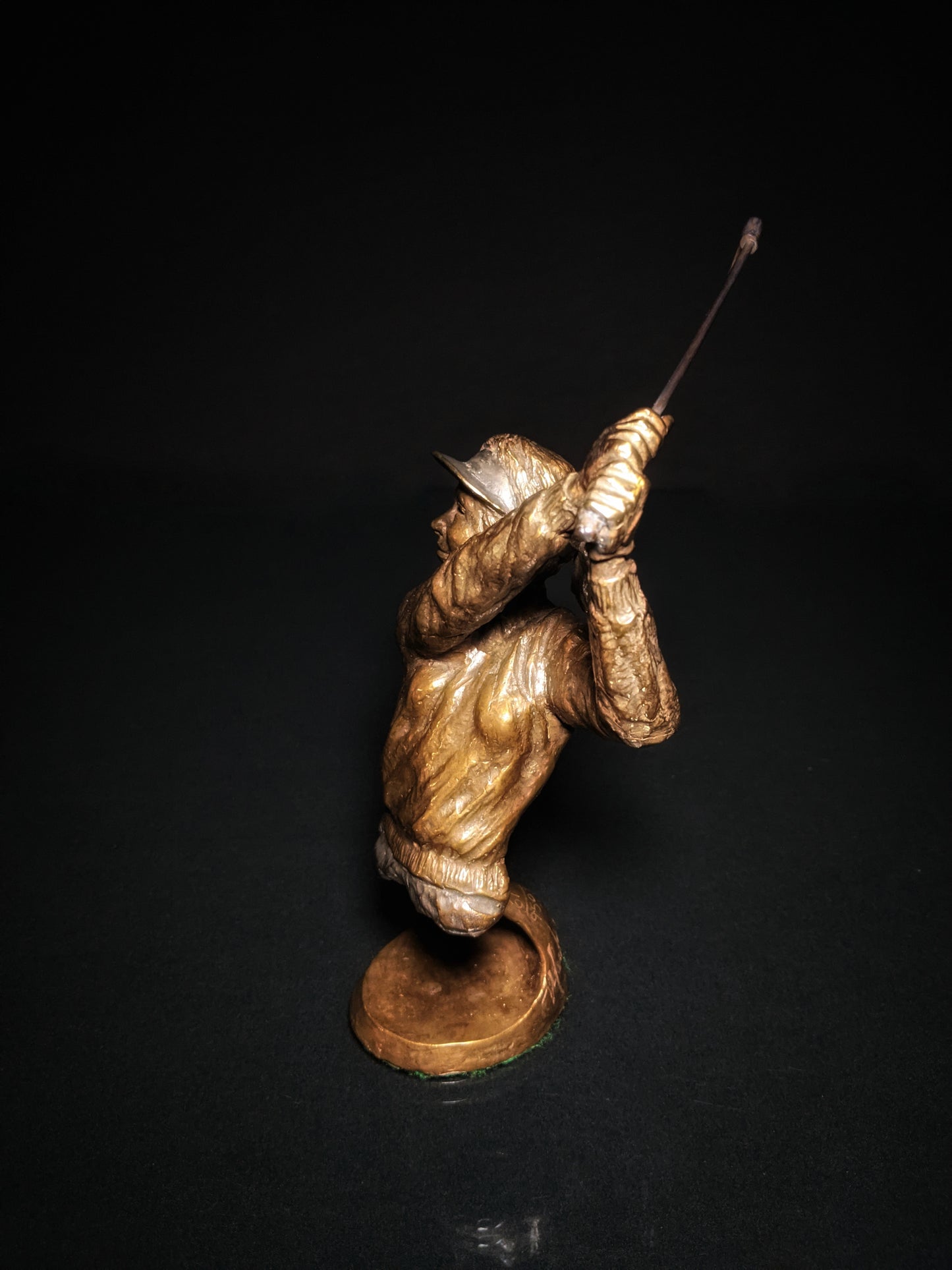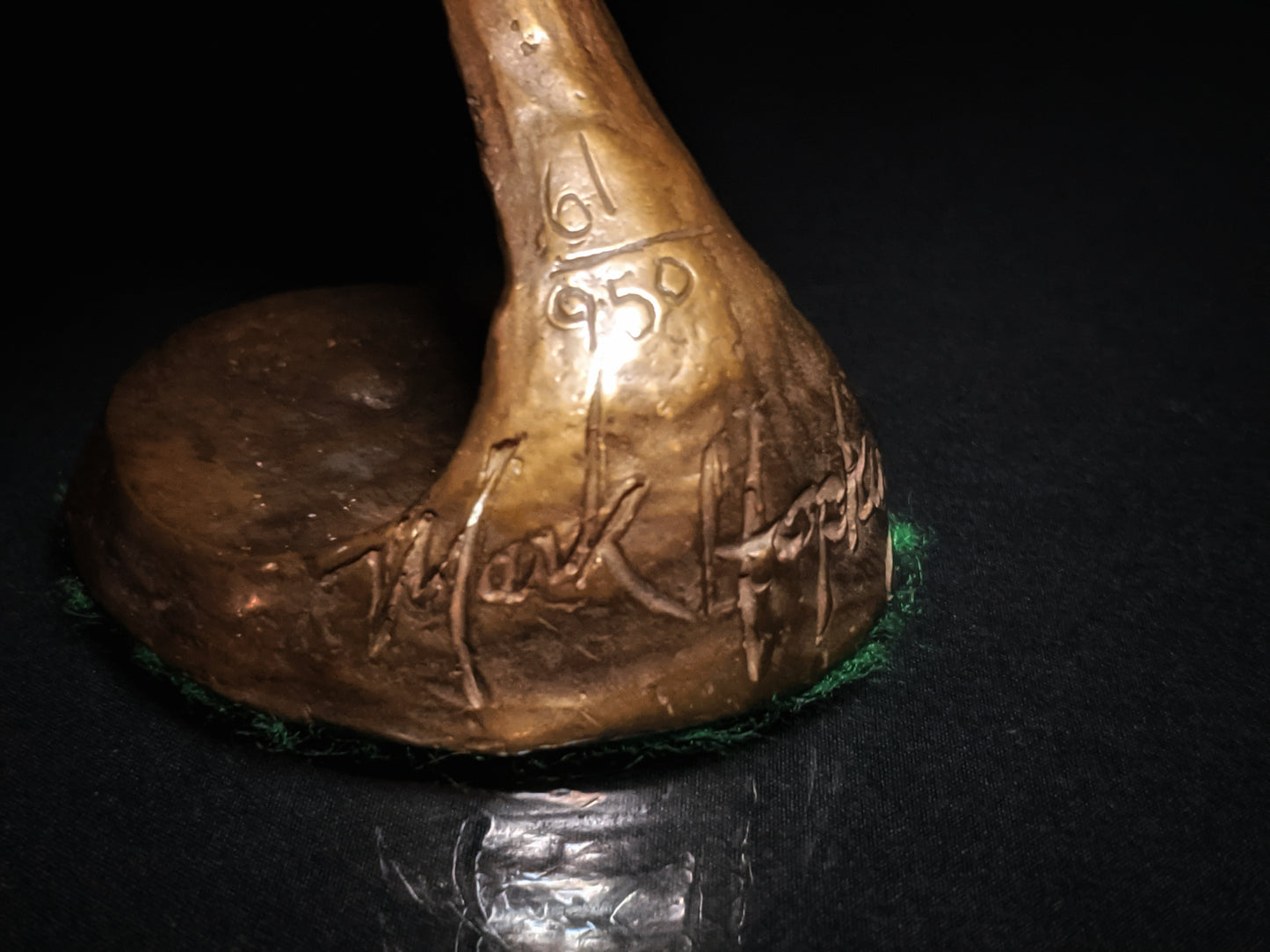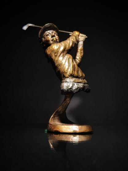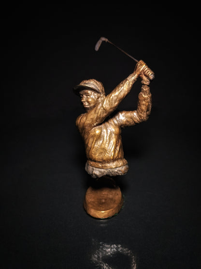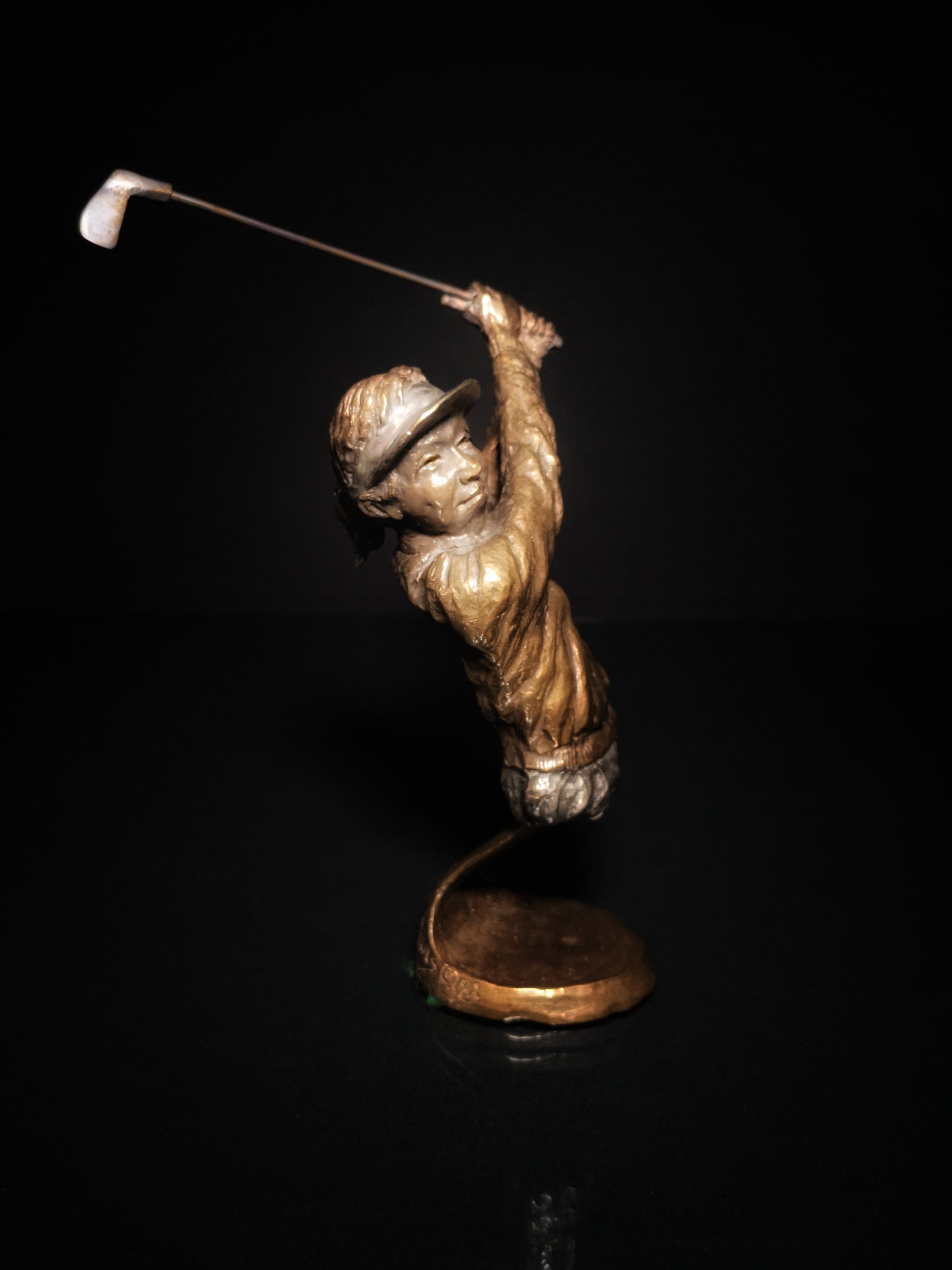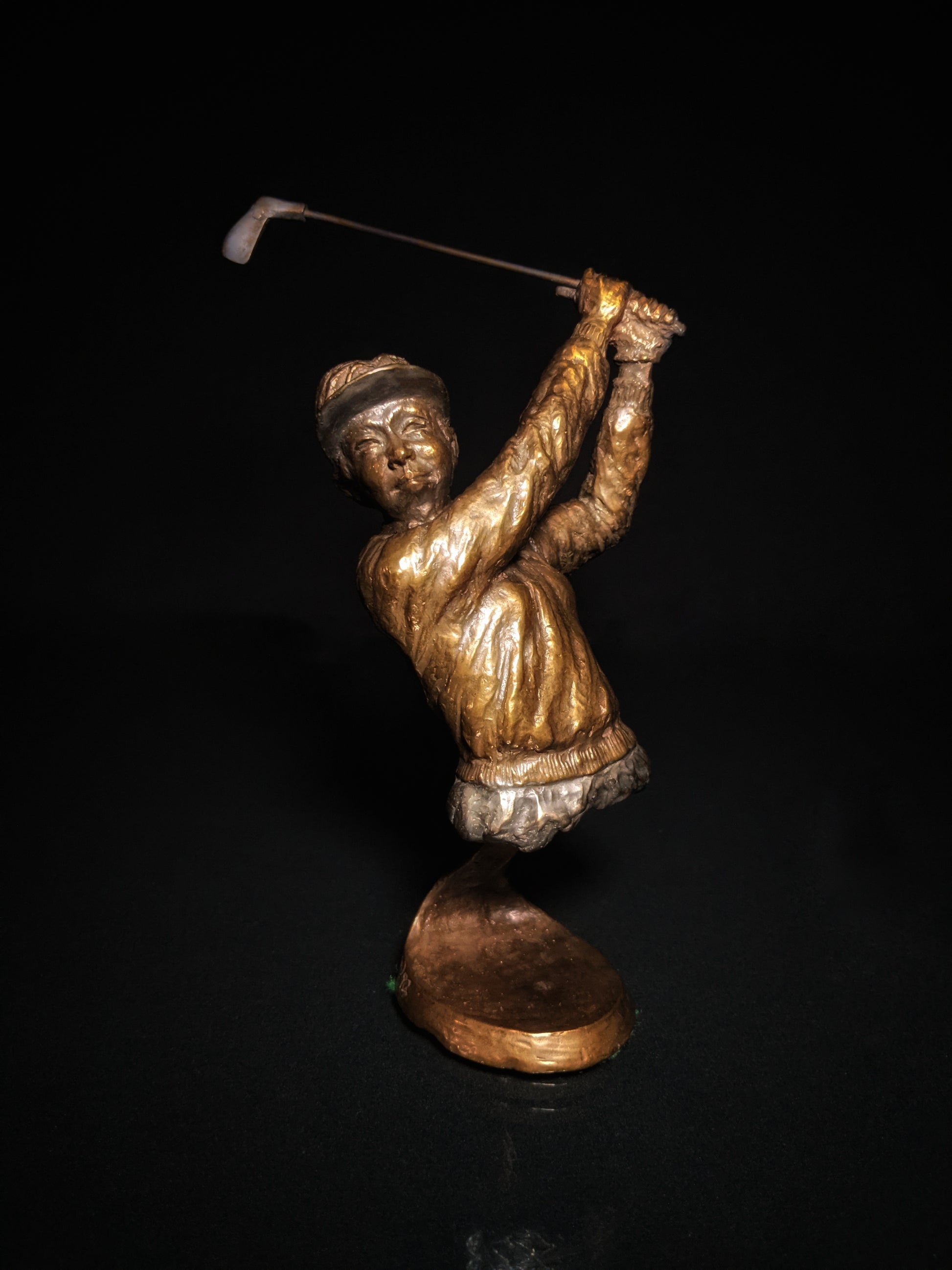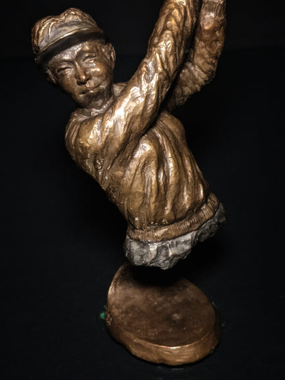 This is a Mark Hopkins Bronze of a Lady Golfer swinging a golf club. It captures the spirit of golfers after making a long putt.The view of golf clubs is created in hot cast bronze and is limited to an edition of 950 pieces. This impressive and timely detailed bronze golf sculpture is one that will be treasured for generations to come. Numbered xx / 950. Comes with original box and without coa. Good condition. Measures approx 8 1/4" H x 5 1/2 " W. We ship Worldwide fully insured.