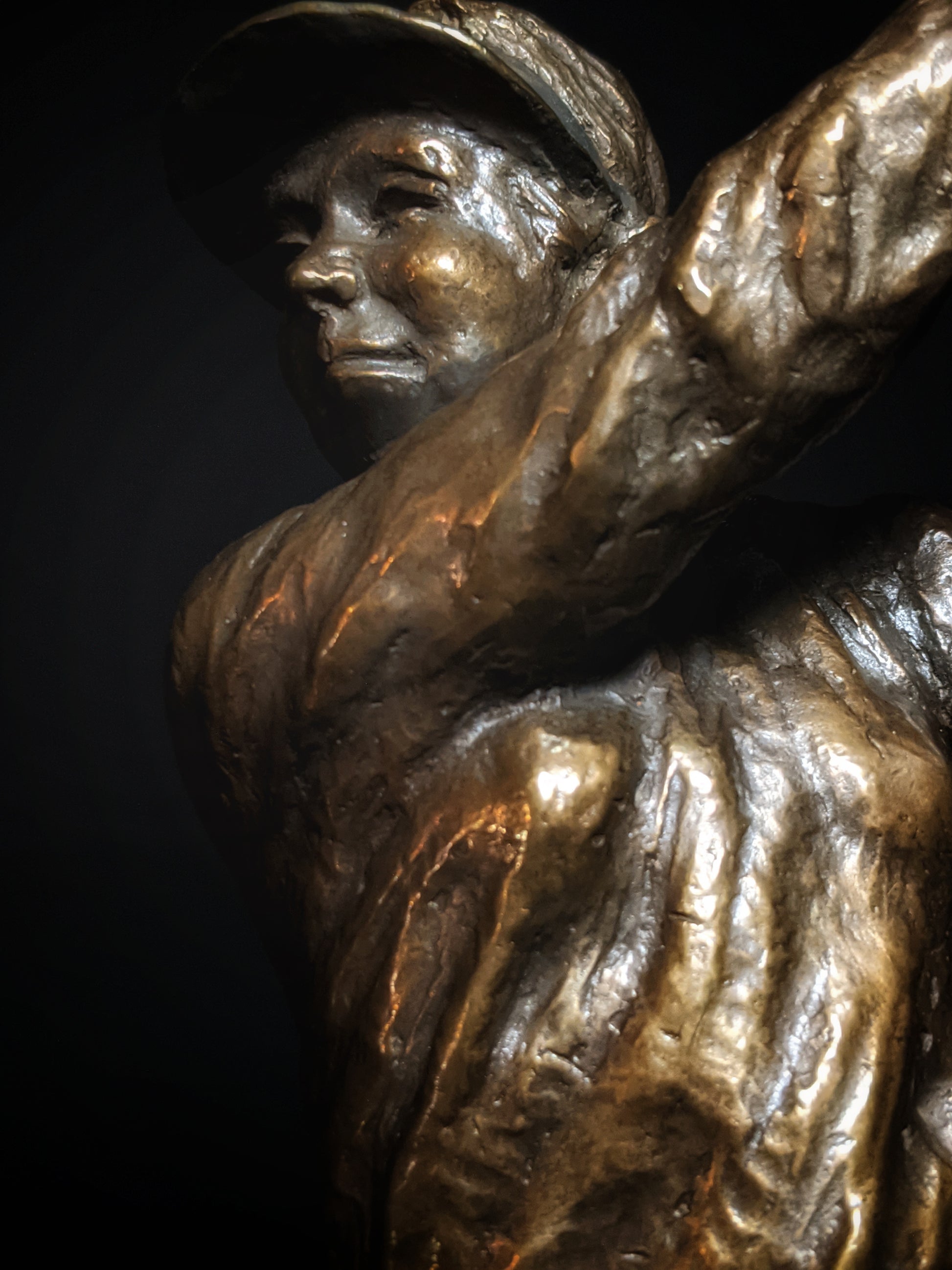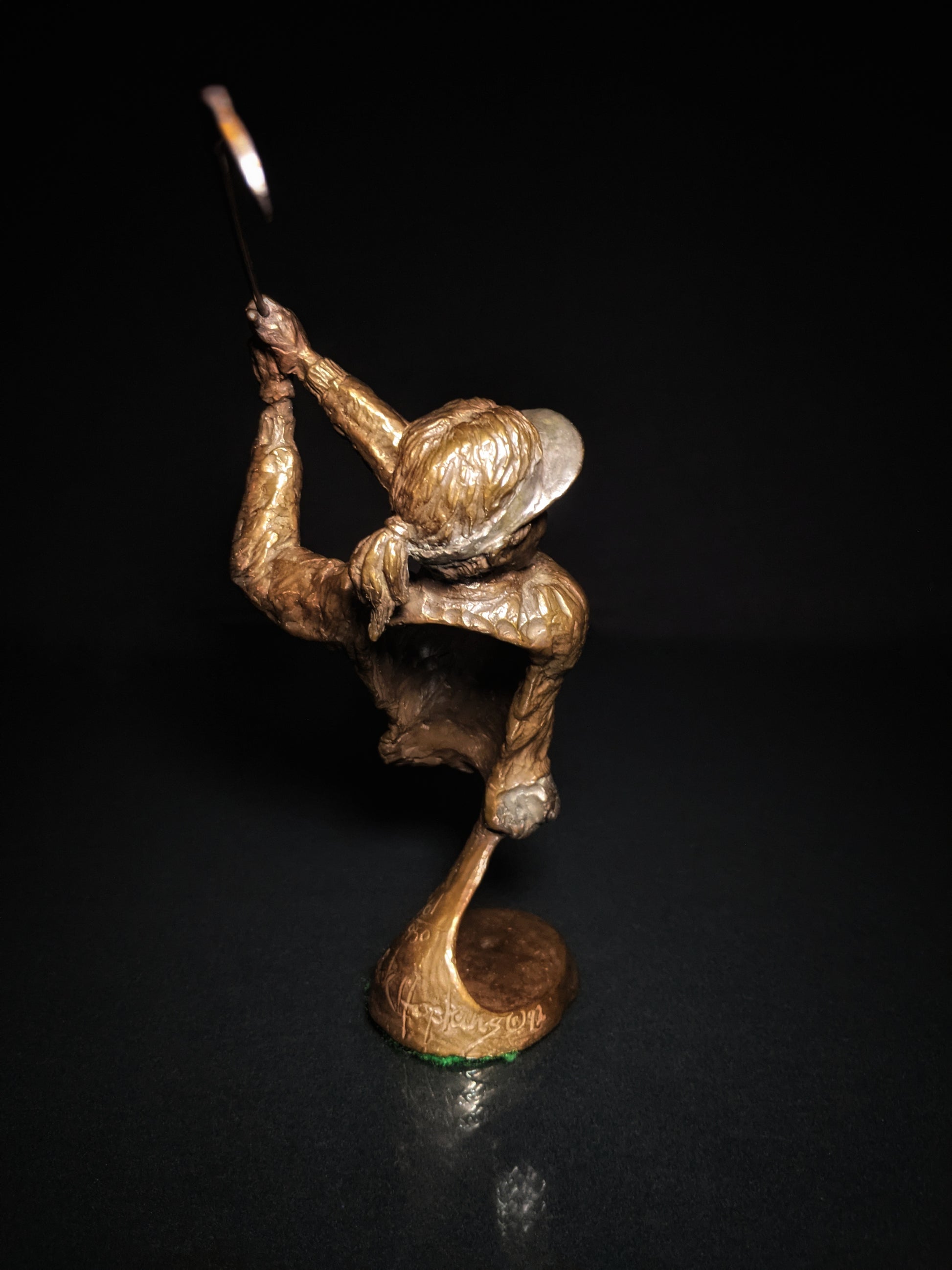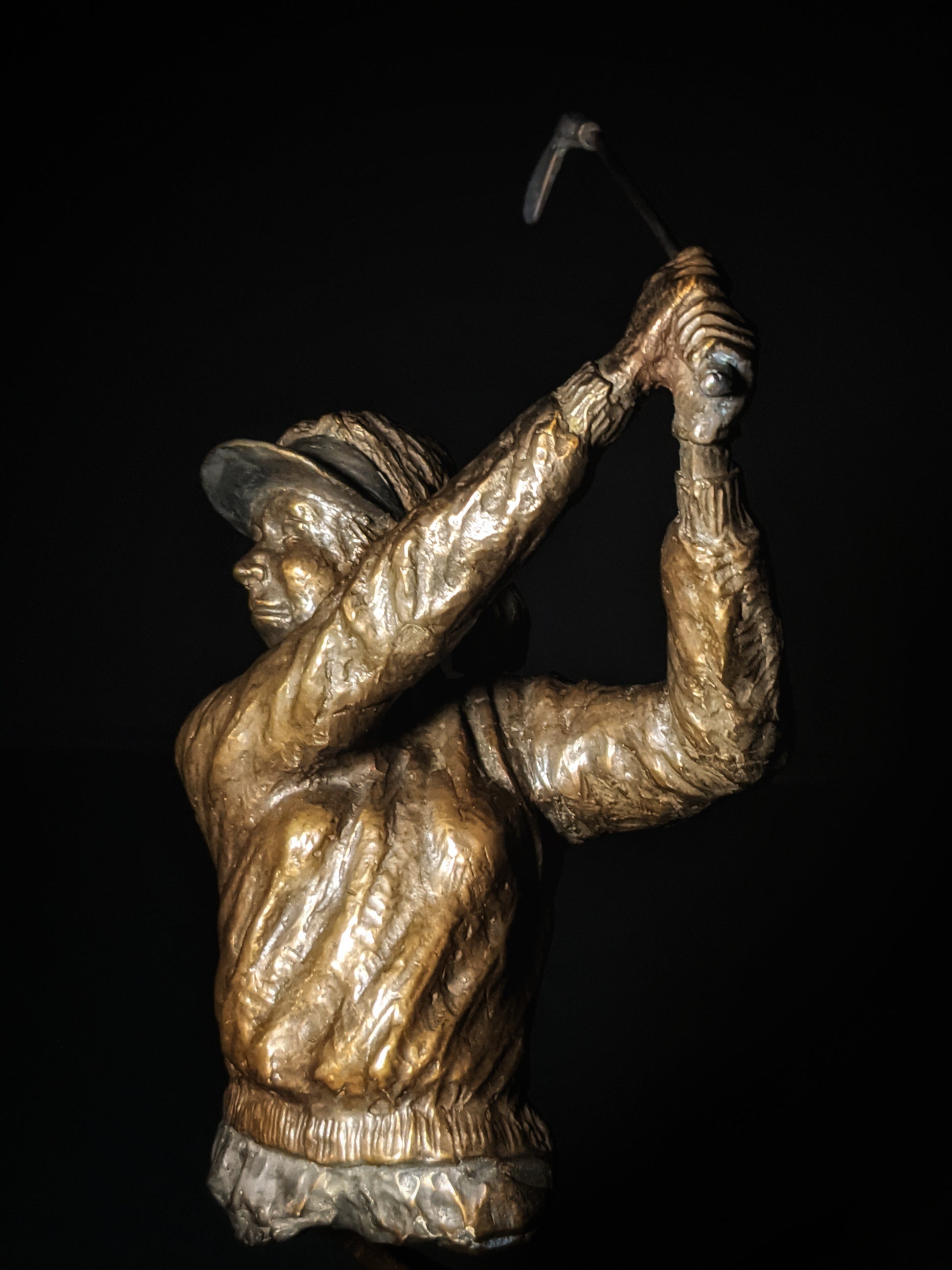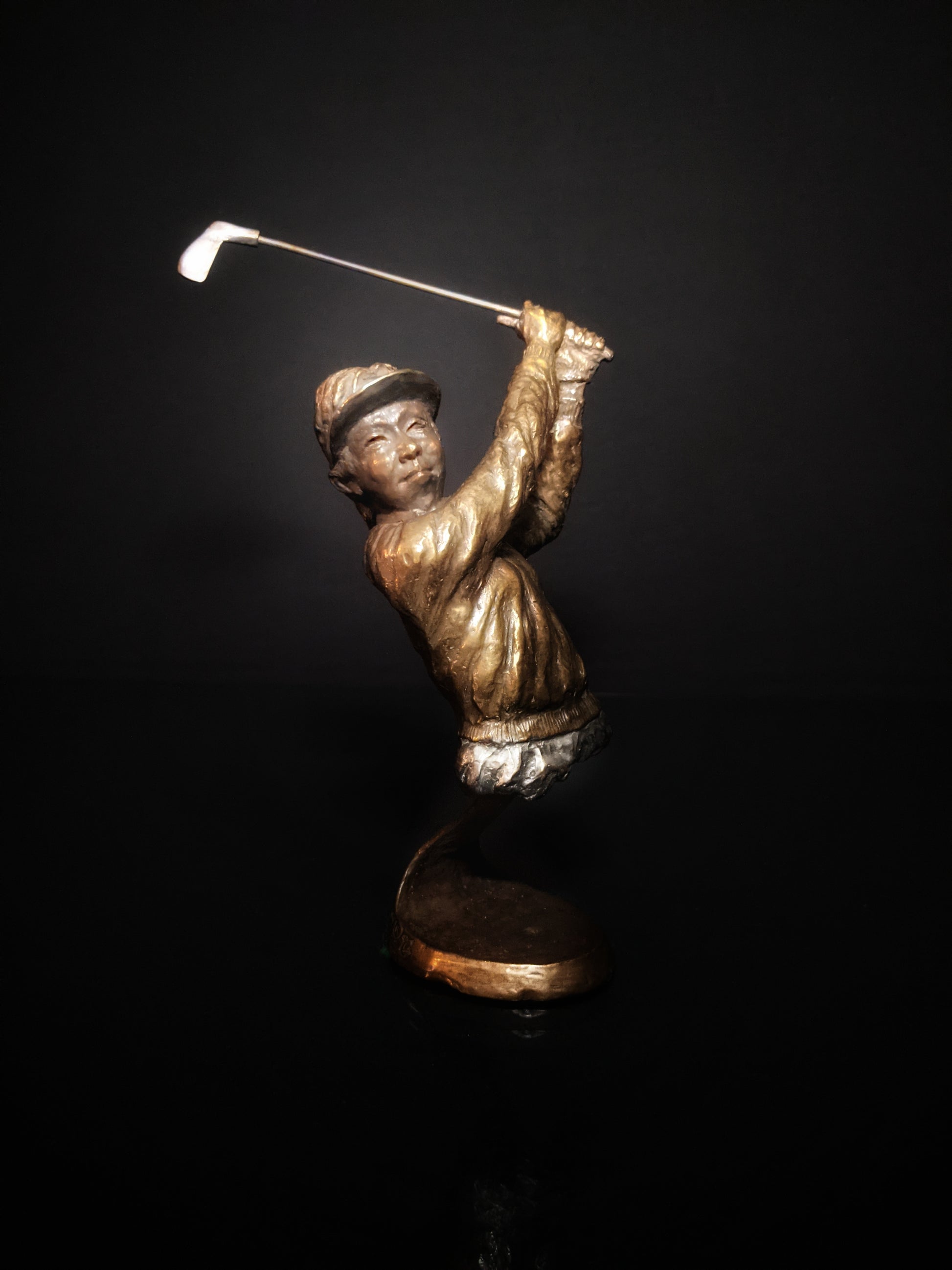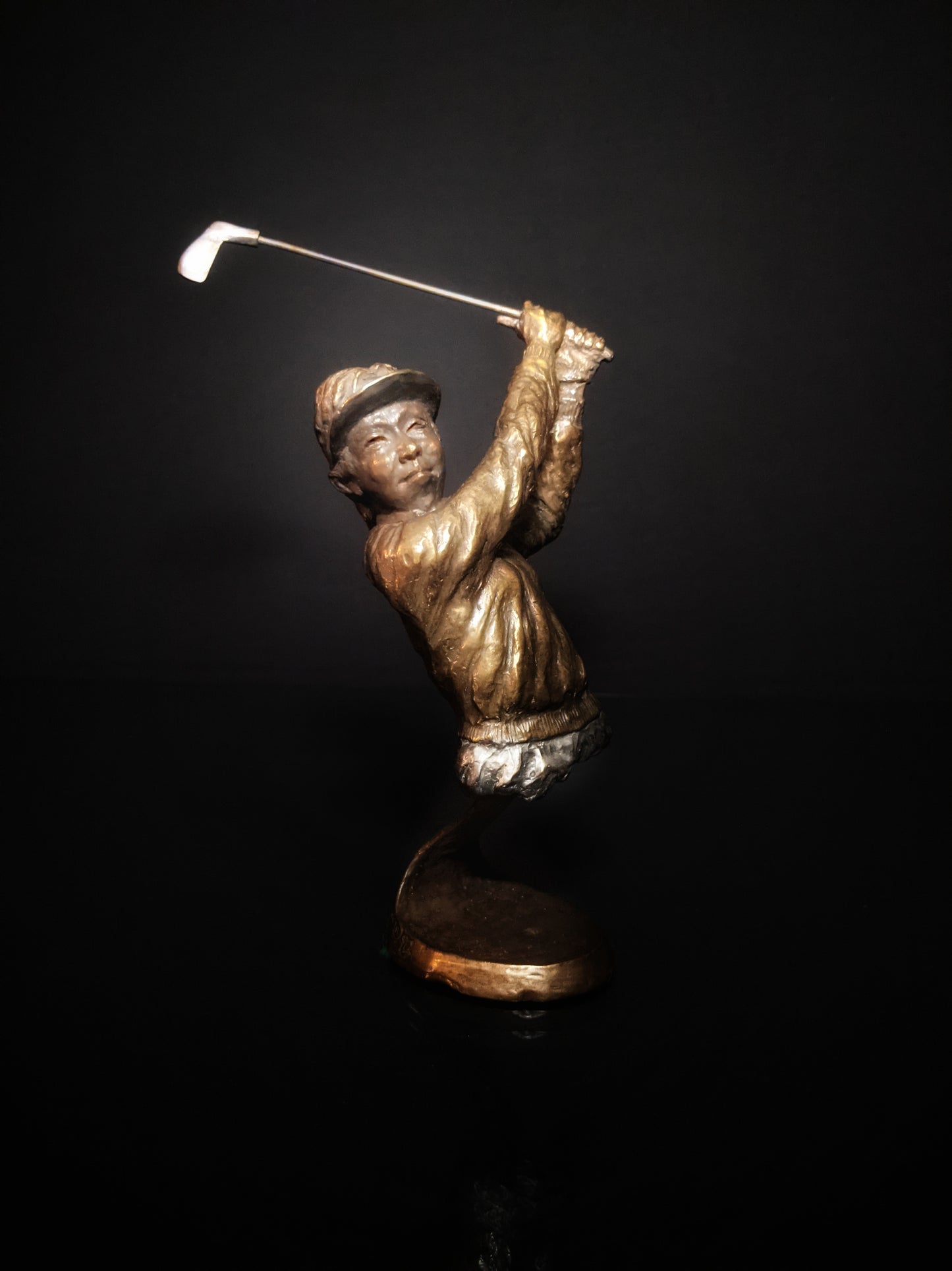 This is a Mark Hopkins Bronze of a Lady Golfer swinging a golf club. It captures the spirit of golfers after making a long putt.The view of golf clubs is created in hot cast bronze and is limited to an edition of 950 pieces. This impressive and timely detailed bronze golf sculpture is one that will be treasured for generations to come. Numbered xx / 950. Comes with original box and without coa. Good condition. Measures approx 8 1/4" H x 5 1/2 " W. We ship Worldwide fully insured.