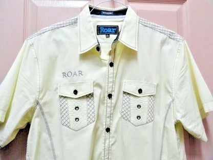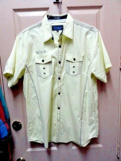 This is a preowned Roar Light Yellow Short Sleeve Large size Adult shirt. Has embroidered design front and back. Good condition. Hardly worn. No missing buttons or issues. Fresh Laundered. We Ship Worldwide fully insured.