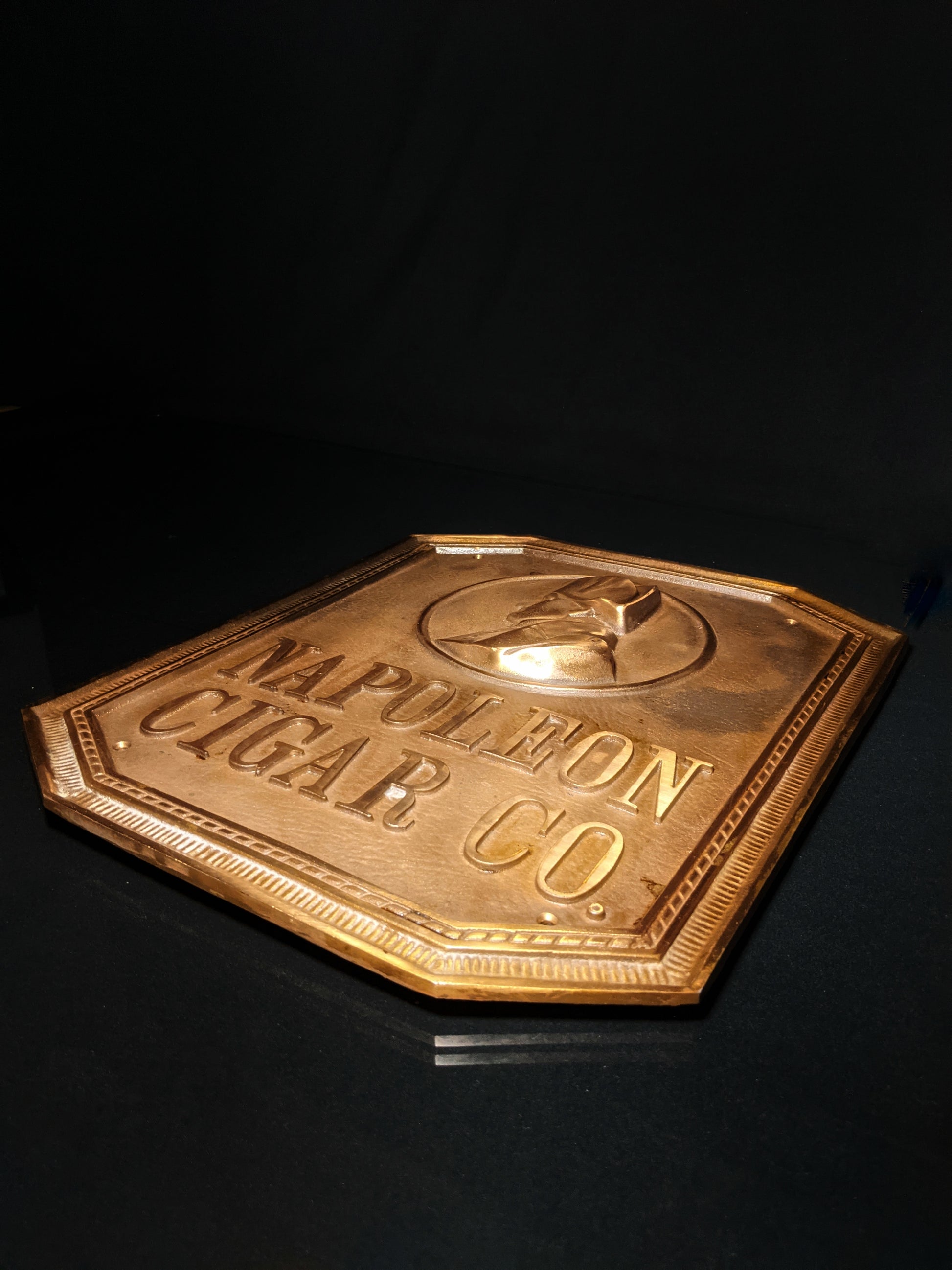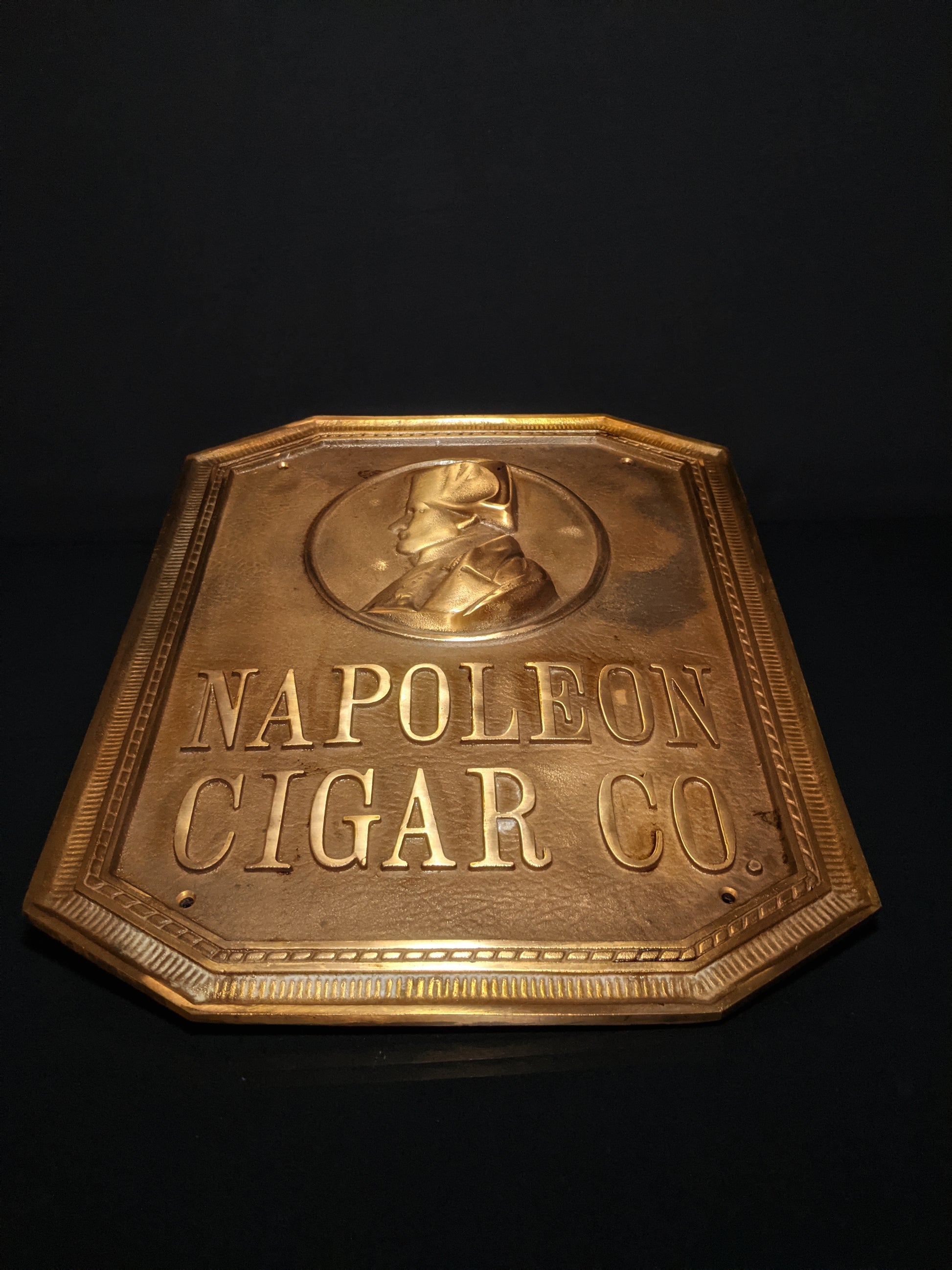This is a Napoleon Cigar Company solid bronze sign in good condition. This fabulous octagonal-shaped bronze sign features a circular bust depiction of Napoleon in a raised , tow dimensional cast, border within a border frame and the words " Napoleon Cigar Co." In large raised letters. There are four mounting holes , one at each corner for secure mounting. Measures approx 15.75' H x 12.5" W. Stunning presence and definition in this heavy bronze for the ultimate cigar aficionado or serious cigar bar . We Ship Worldwide fully insured.