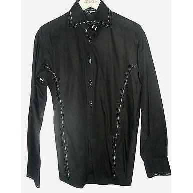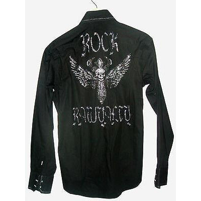 This is a preowned Rawyalty men's large designer dress shirt with embroidered graphic on back. (measures 21" from armpit to armpit and 25.5" from shoulder to cufflink) Worn couple of times. We Ship Worldwide fully insured.