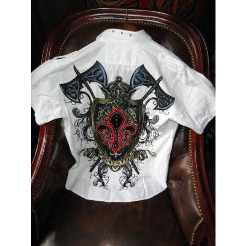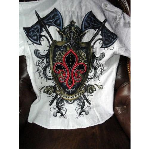 This is a pre-owned Retrofit of Los Angeles California White Short Sleeve Shirt. Custom embroidered on the front and back side. Has Medieval Shield with Axes on backside. Good condition. Freshly laundered. We Ship Worldwide fully insured. Signature upon delivery required. Thank you!