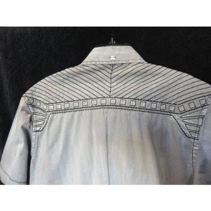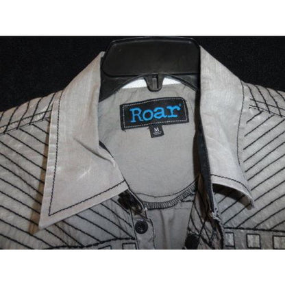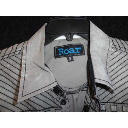 This is preowned Roar men's ( 18" from armpit to armpit) casual designer Gray short sleeve shirt with black embroidered graphics. Made in China . 98% Cotton & 2% Spandex. Good condition. No missing buttons. We ship Worldwide fully insured. Signature required upon delivery.