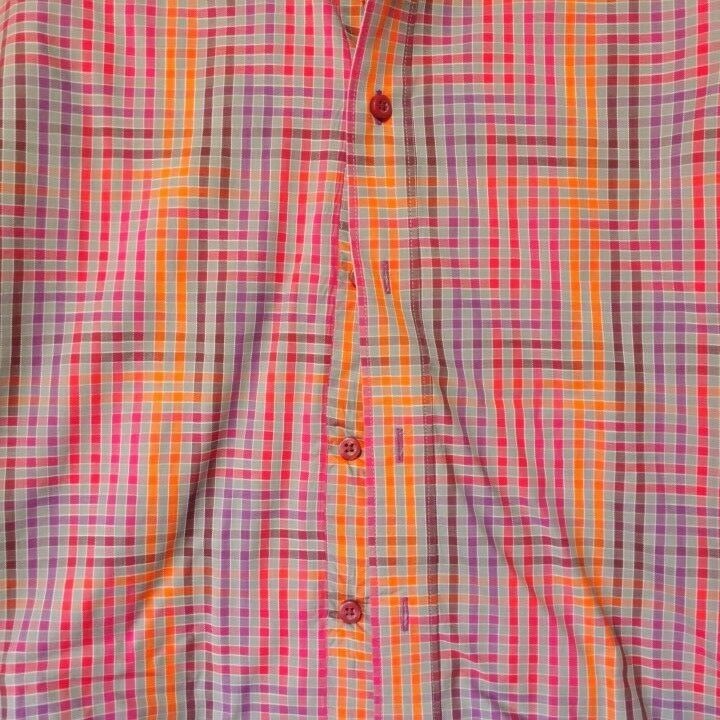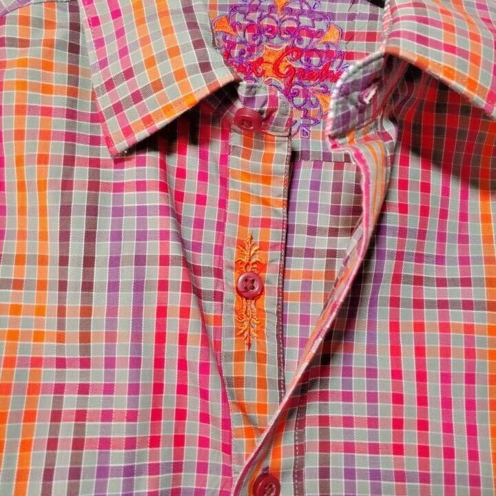 100% Original ROBERT GRAHAM long-sleeved button down classic fit shirt. Color and bold printed pattern with embroidered "RG" logo at the bottom of the hem.