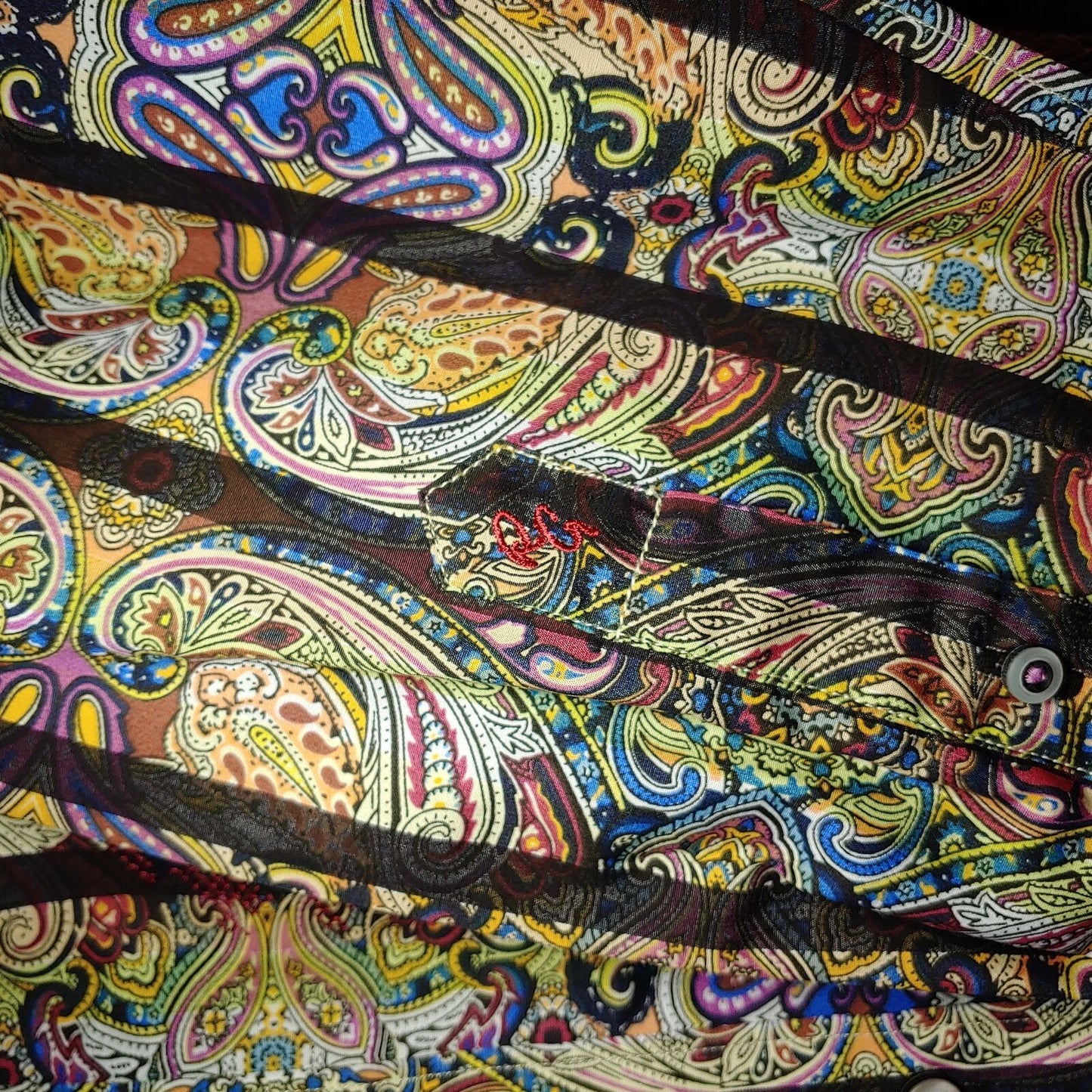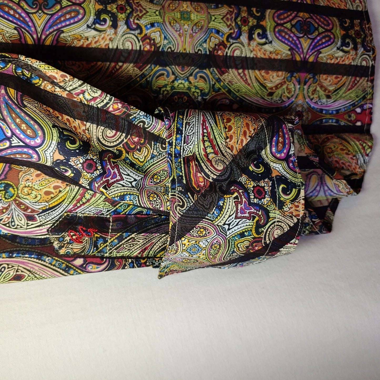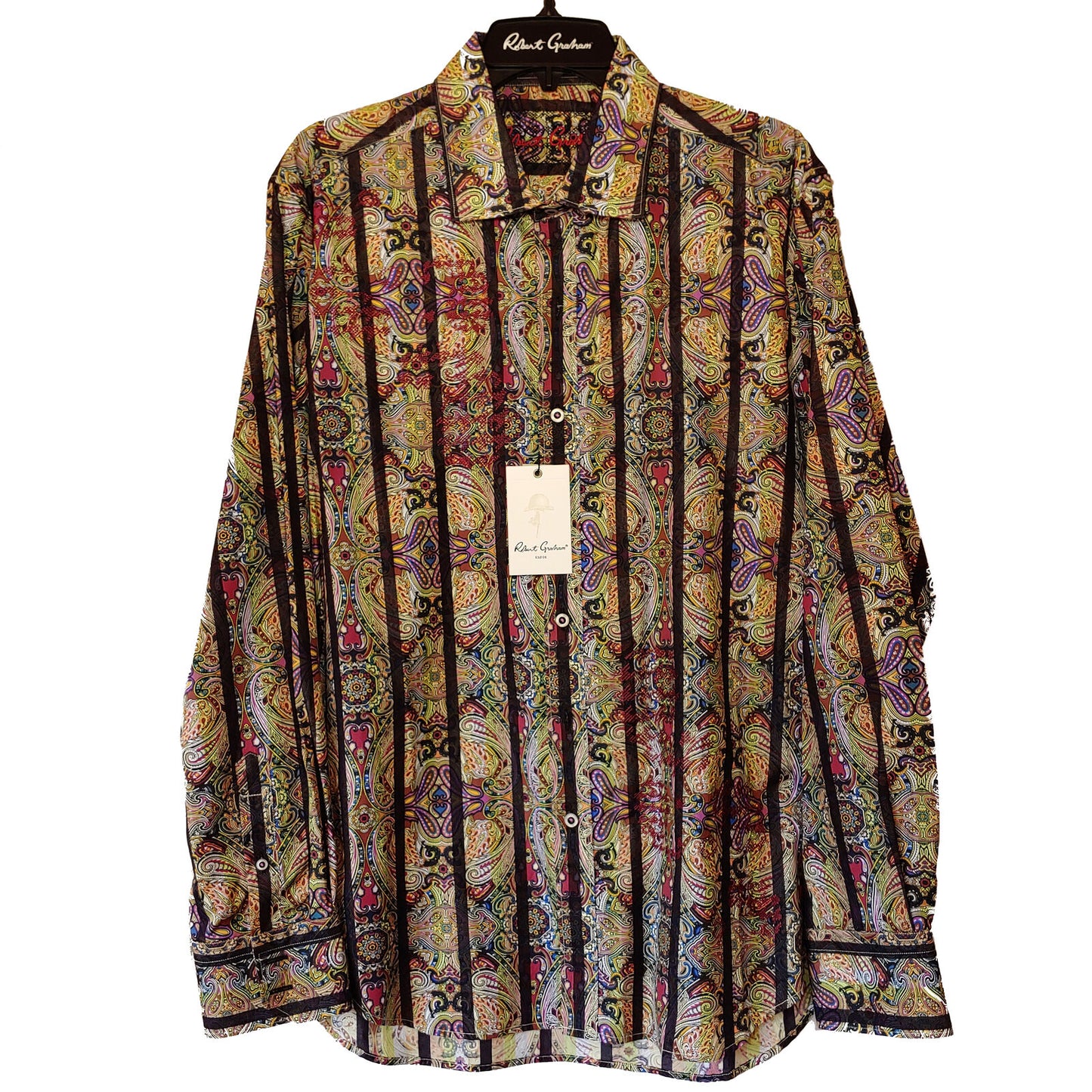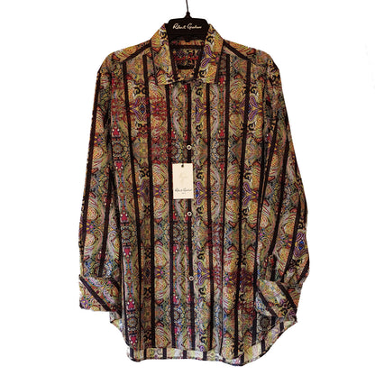 100% Original ROBERT GRAHAM long-sleeved button-down classic fit shirt. Color and bold printed pattern with embroidered "RG" logo at the bottom of the hem.