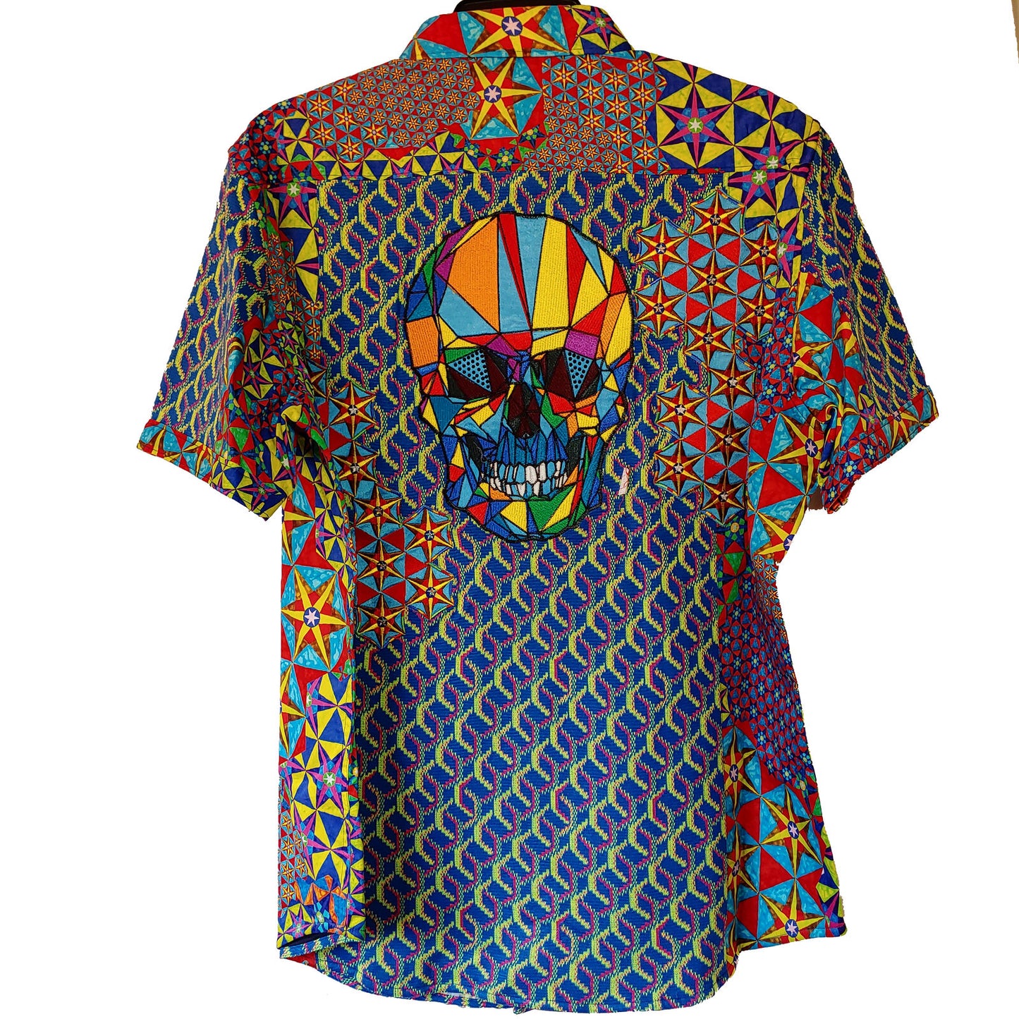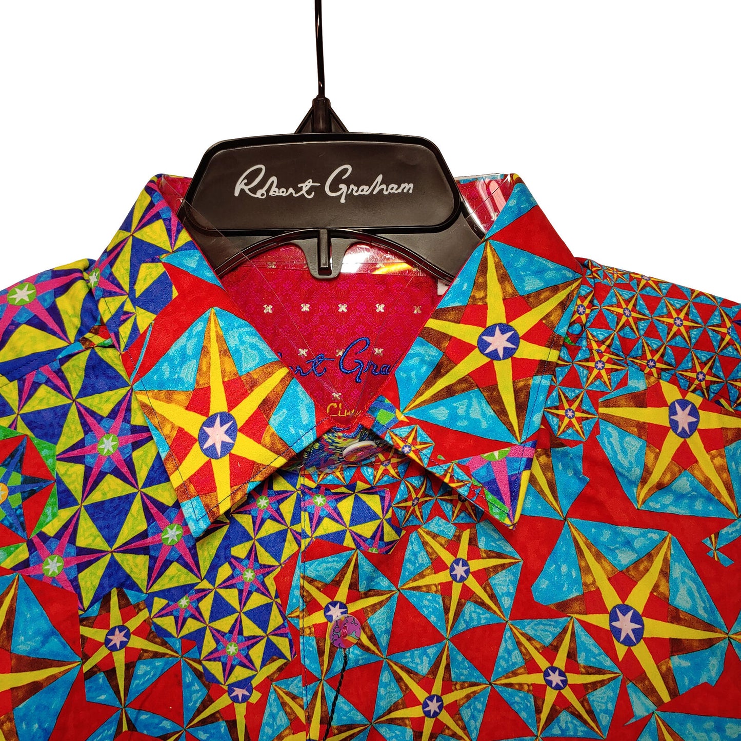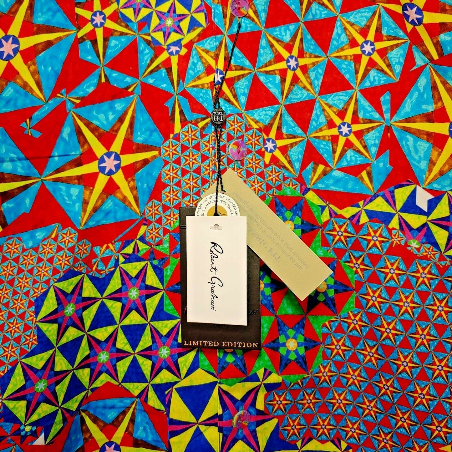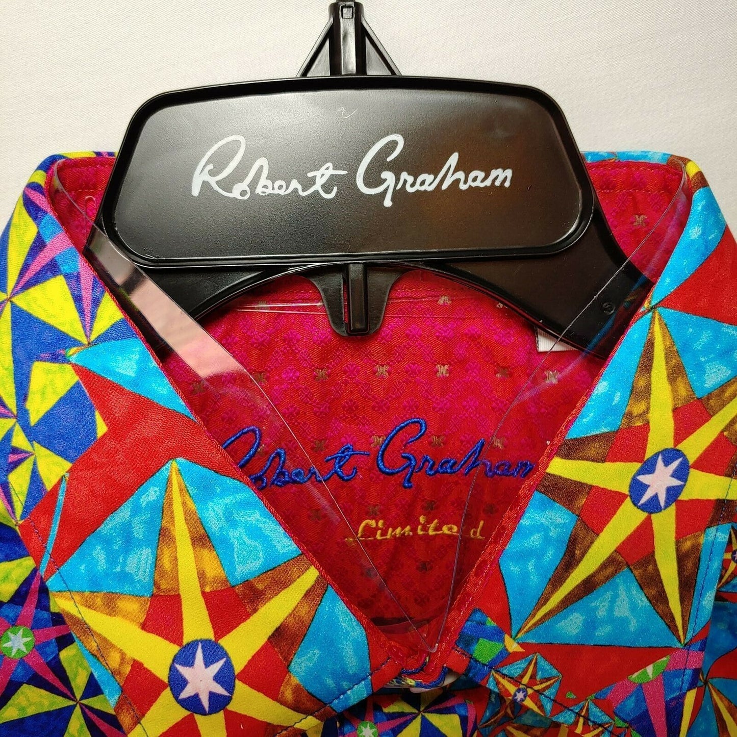 100% Original ROBERT GRAHAM long-sleeved button-down classic fit shirt. Color and bold printed pattern with embroidered "RG" logo at the bottom of the hem.