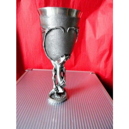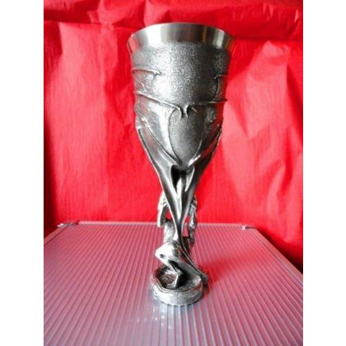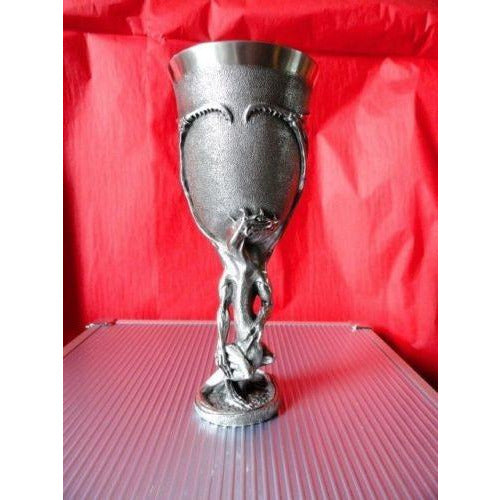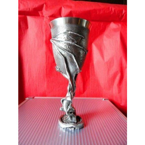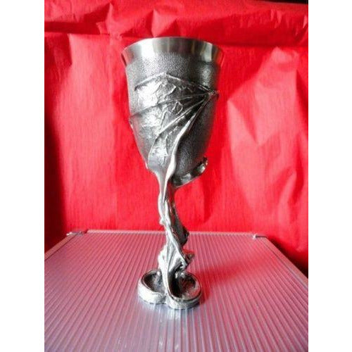 This realistically sculptured Fire Drake forms the stem of the goblet. Huge bat-like wings curved upwards as a show of strength, to support a heavily textured cup. Sculptured with attention to detail, the goblet is highly polished and stands 19 cm in height.