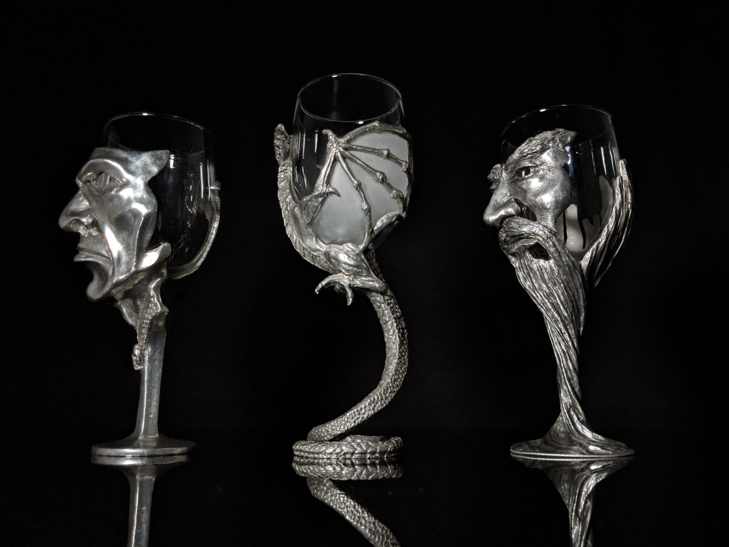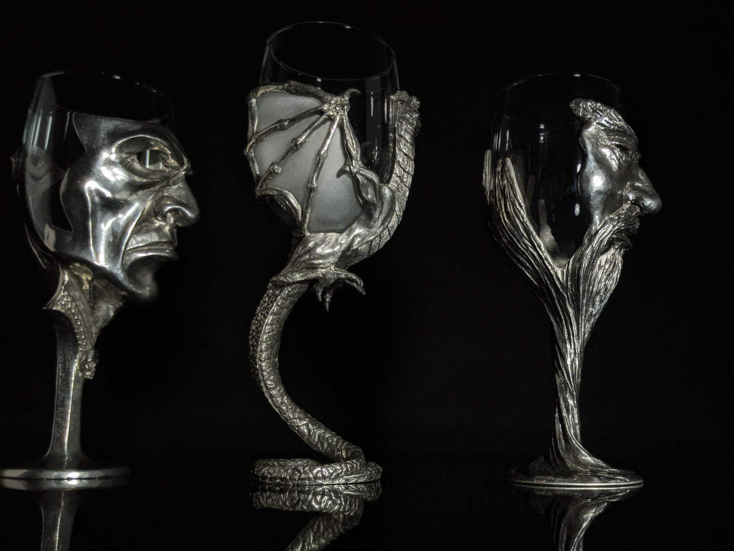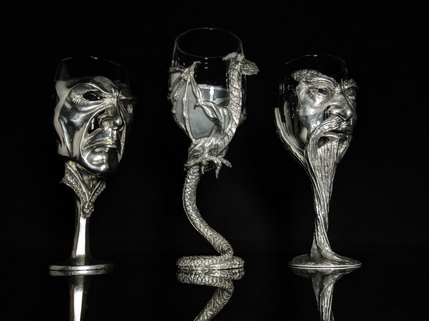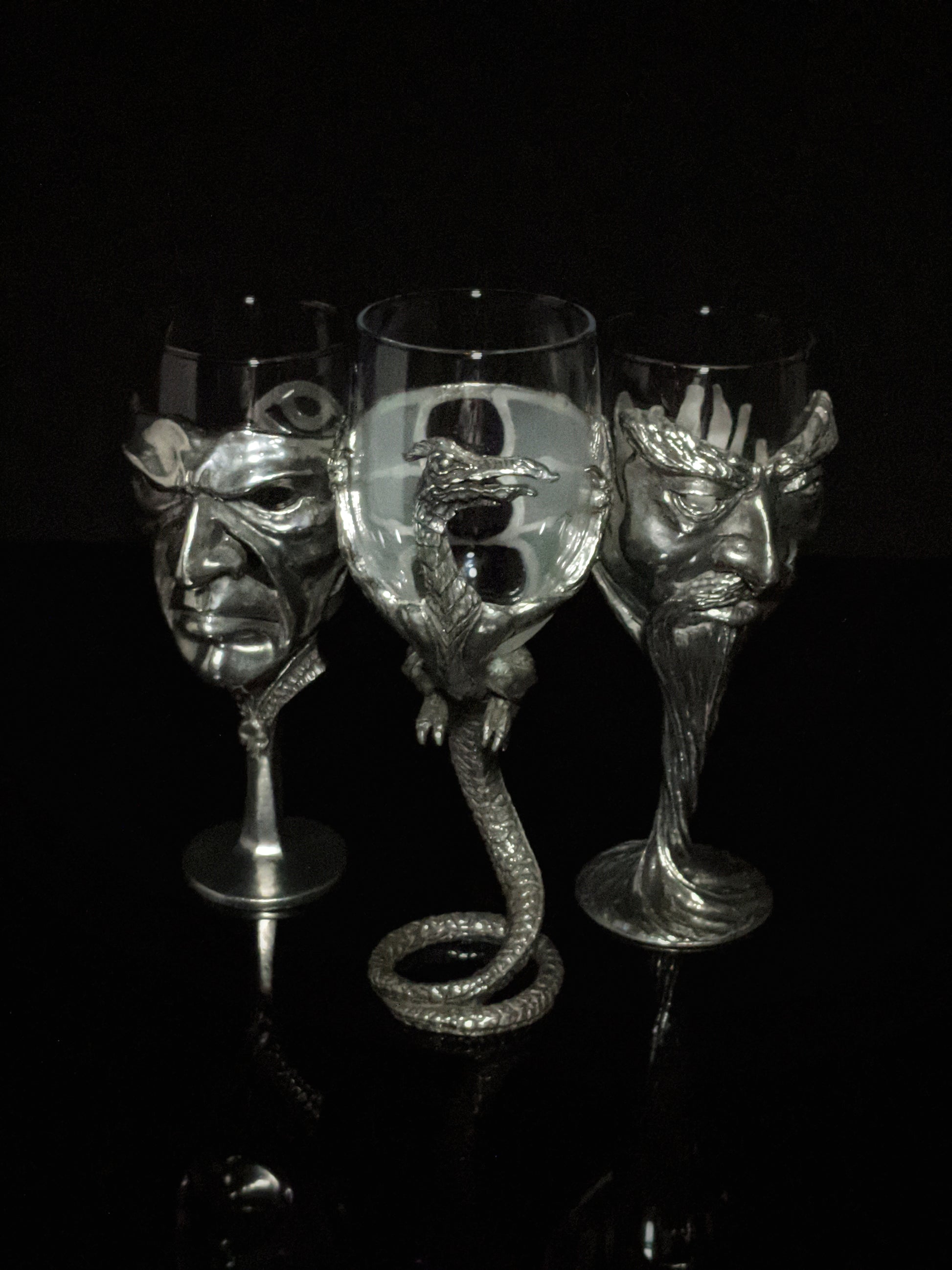 This is a set of 3 Royal Selangor Lord of Rings Pewter Wine Glasses. Made in Malaysia. We ship insured with signature required upon delivery.
