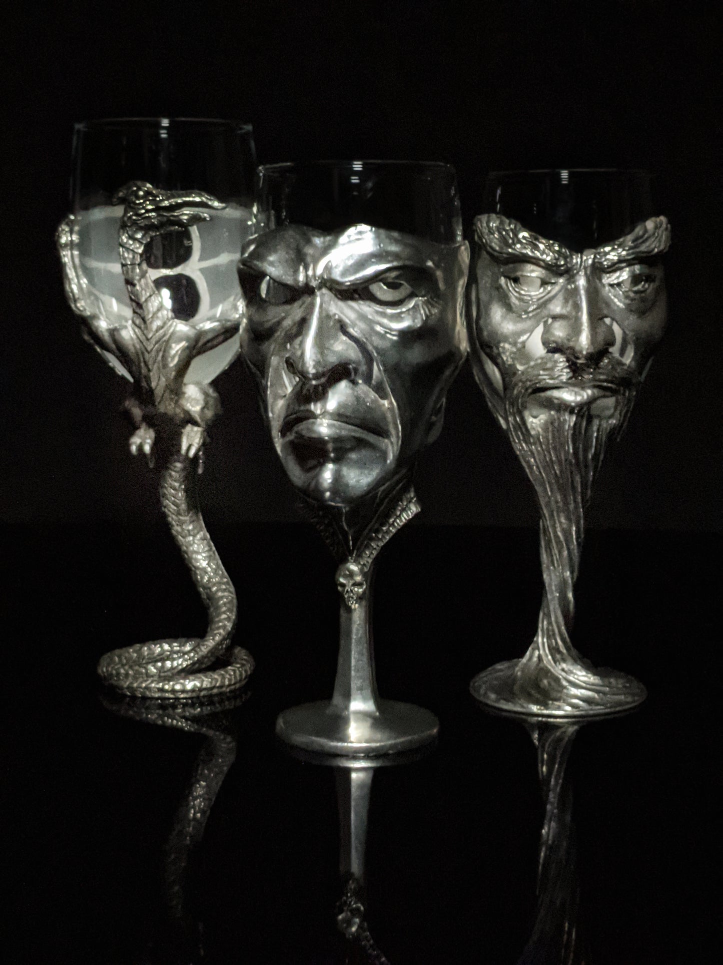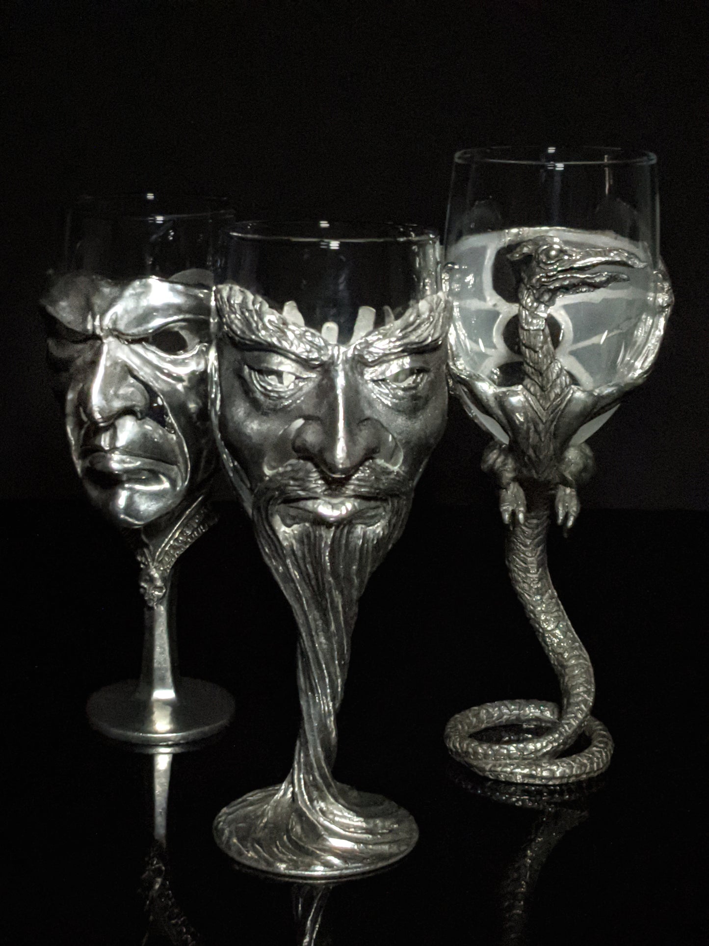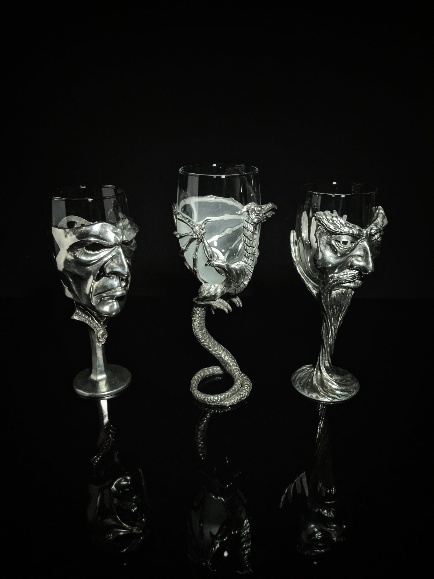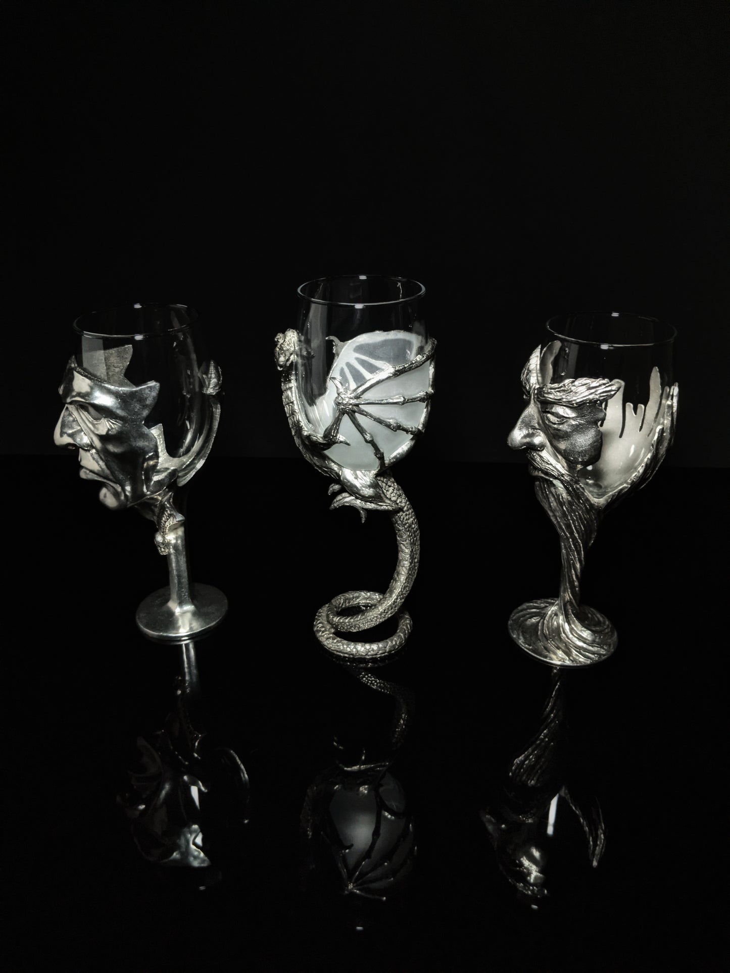 This is a set of 3 Royal Selangor Lord of Rings Pewter Wine Glasses. Made in Malaysia. We ship insured with signature required upon delivery.
