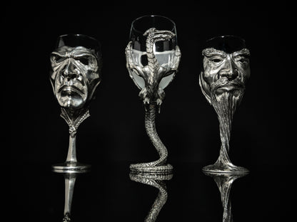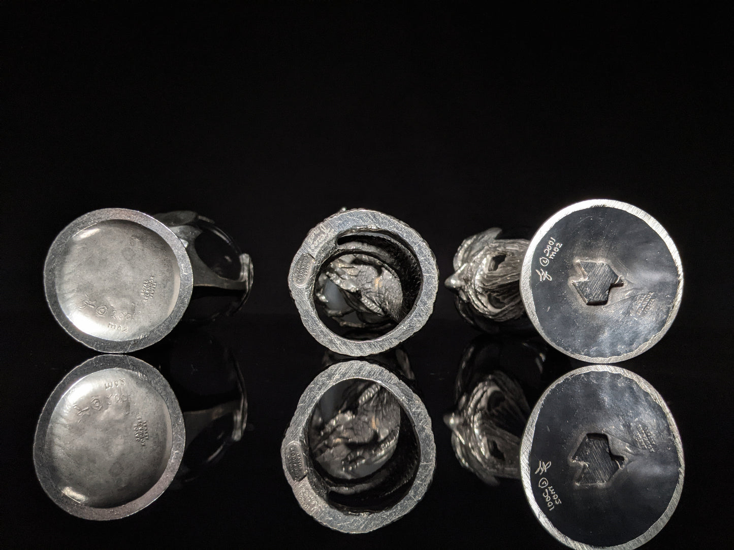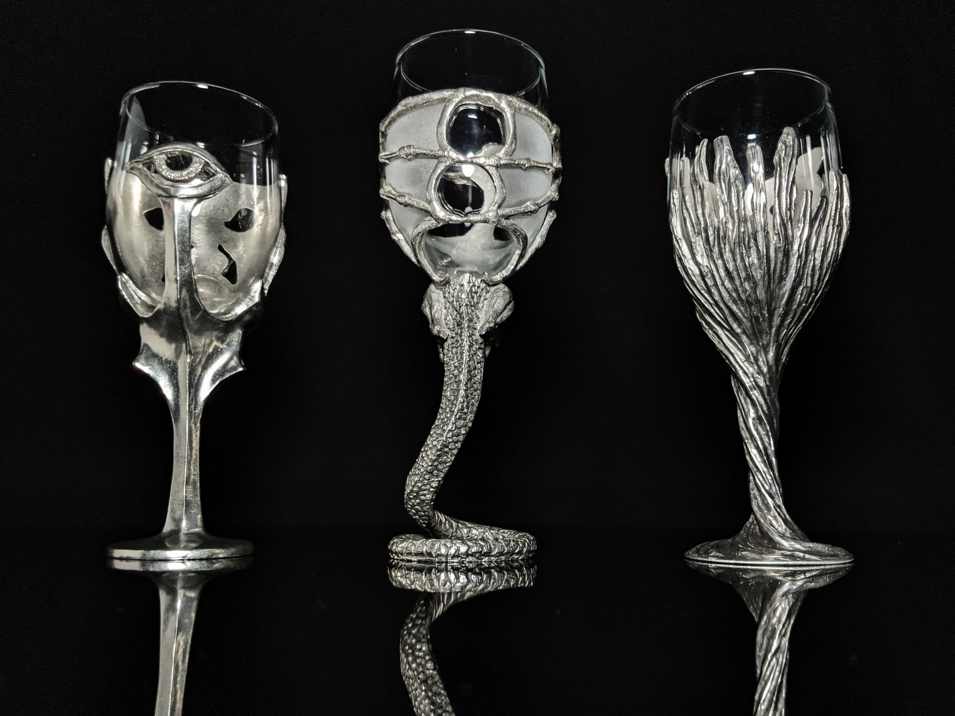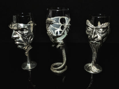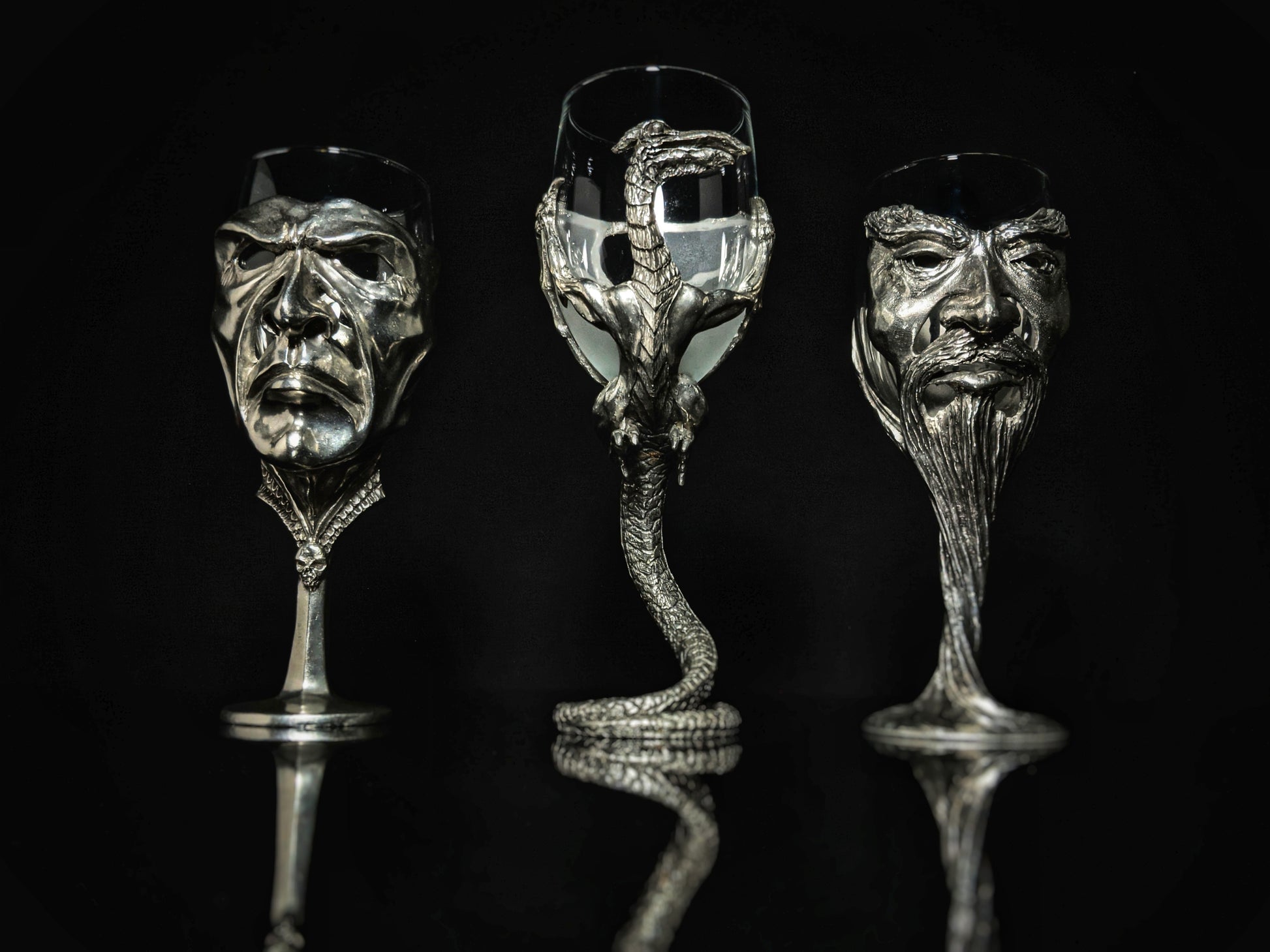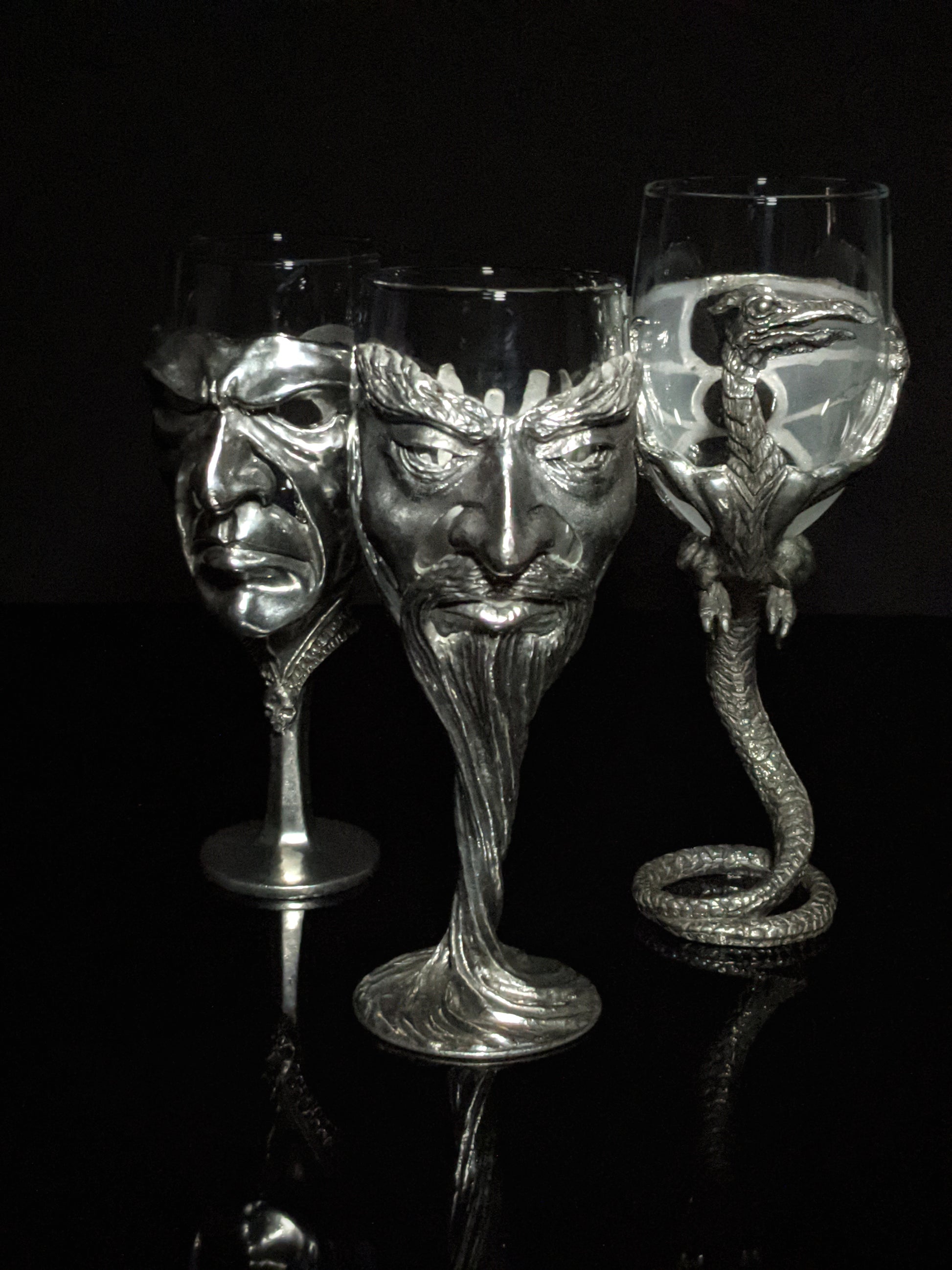This is a set of 3 Royal Selangor Lord of Rings Pewter Wine Glasses. Made in Malaysia. We ship insured with signature required upon delivery.